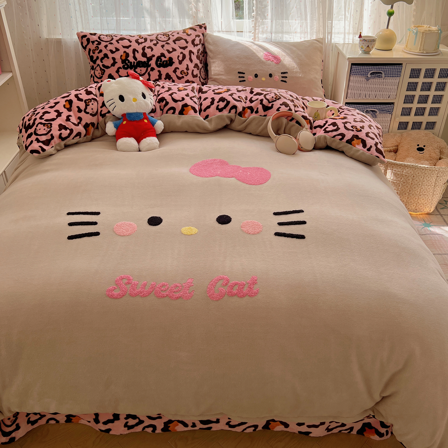 (总)顾里家纺 2024新款印花牛奶绒毛巾绣四件套,爱心花猫,蛋糕花猫,苹果狗