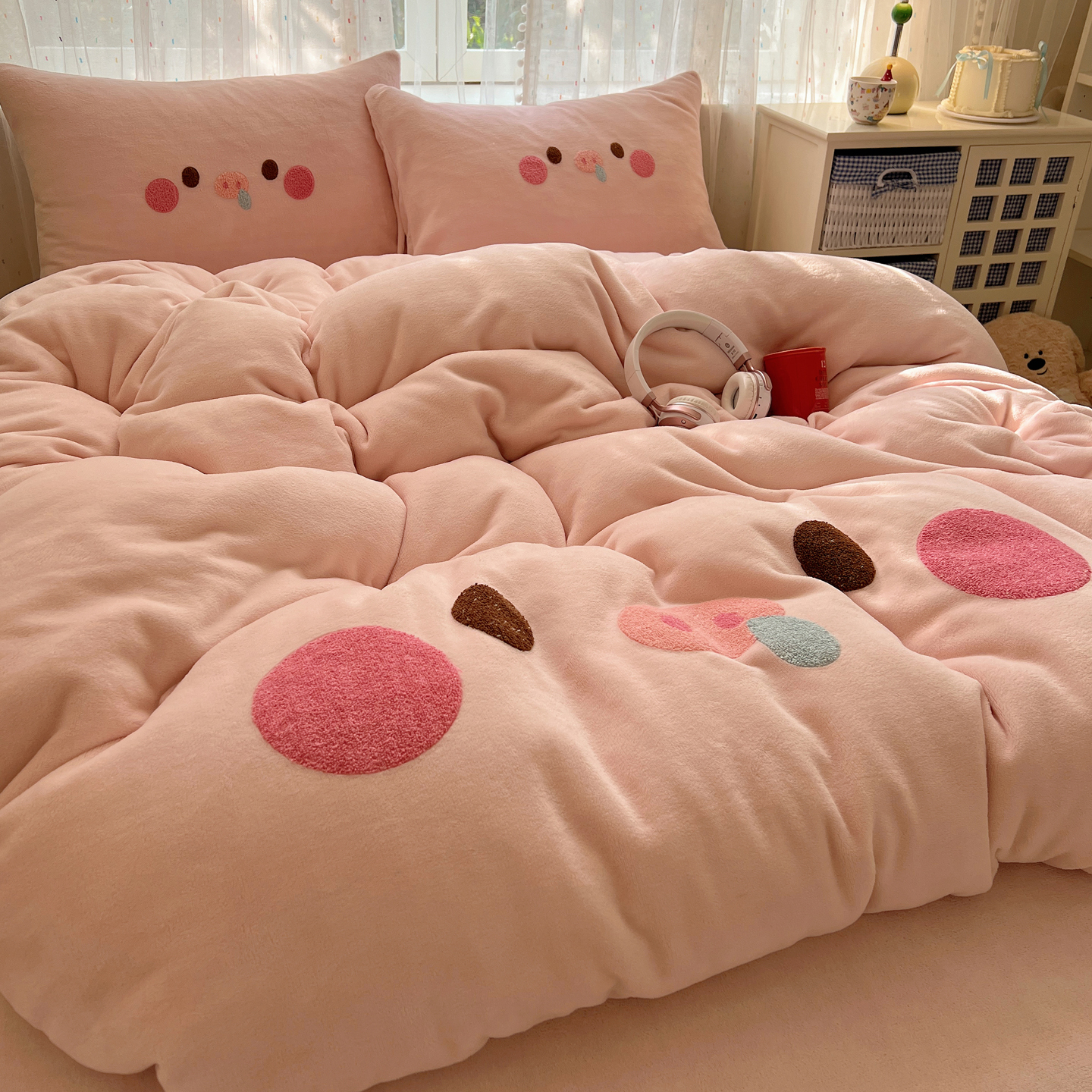 顾里家纺 2025新款可爱表情包毛巾绣牛奶绒四件套 小粉猪
