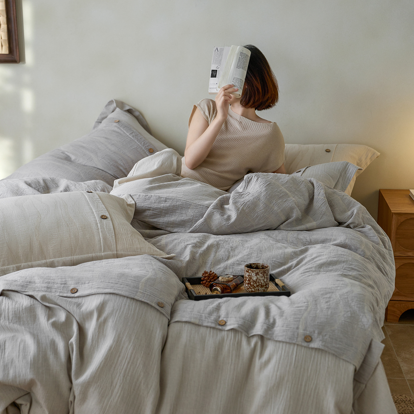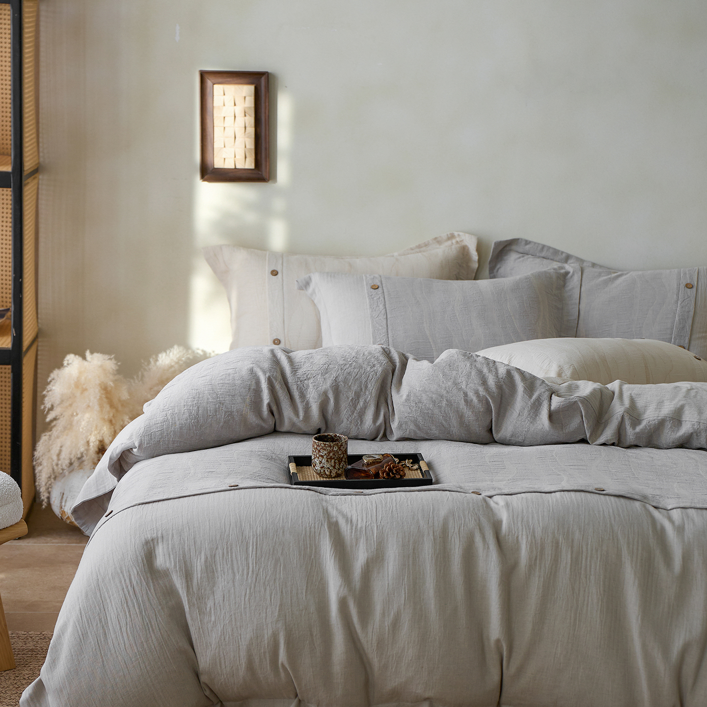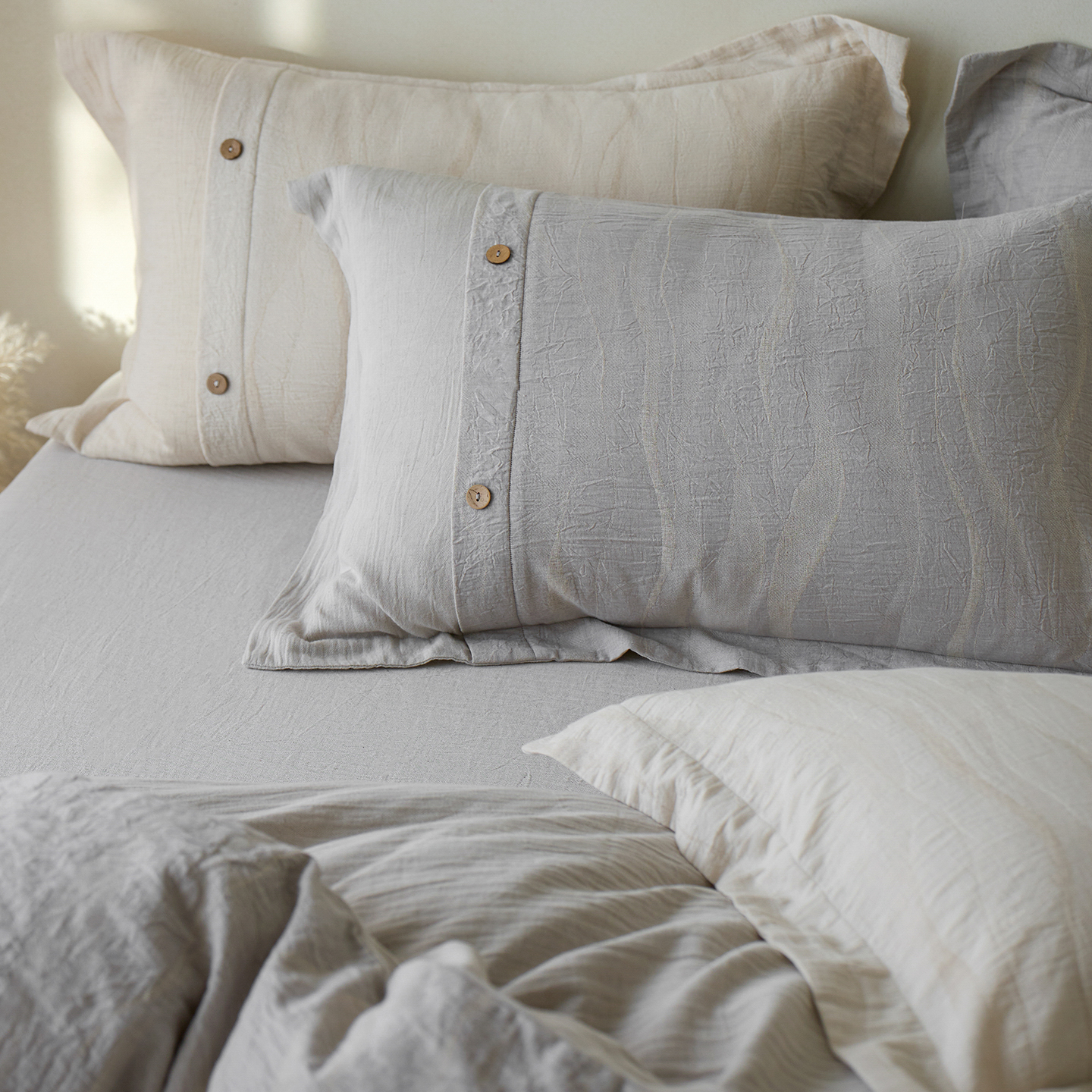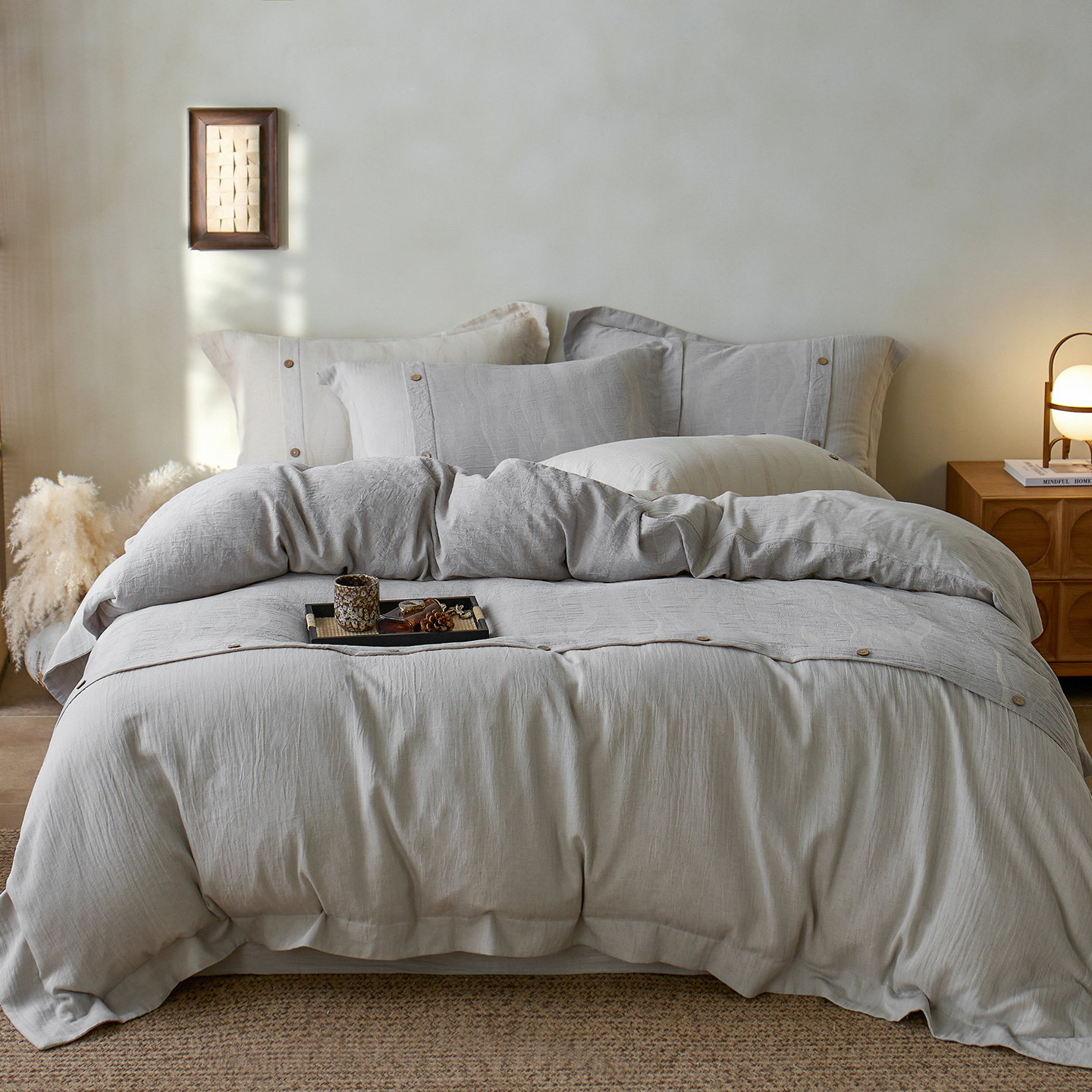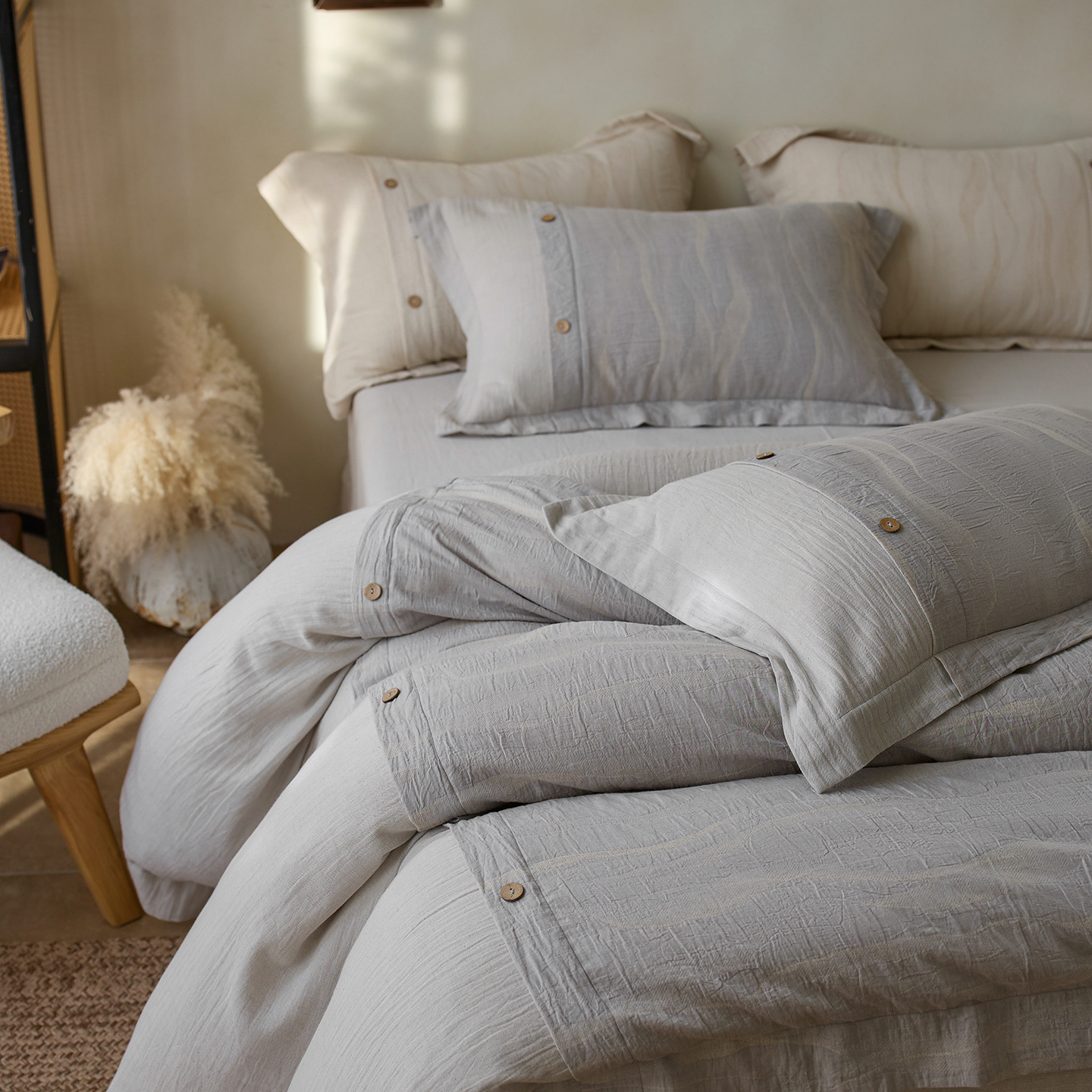 商品名称: 涞澳家纺 2025新款棉麻皱皱纱四件套 萨尔斯-蓝灰