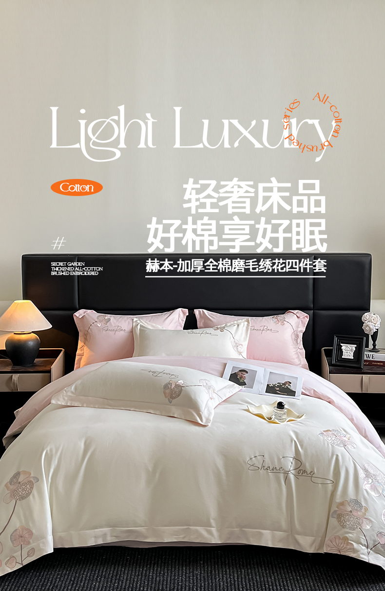 当前位置: 91家纺网 > 商品网购 > 床品套件 > 四件套 > 磨毛活性四件套 > 置顶家纺 2025新款全棉加厚磨毛刺绣秋冬系列四件套-赫本 赫本-奶白+粉玉