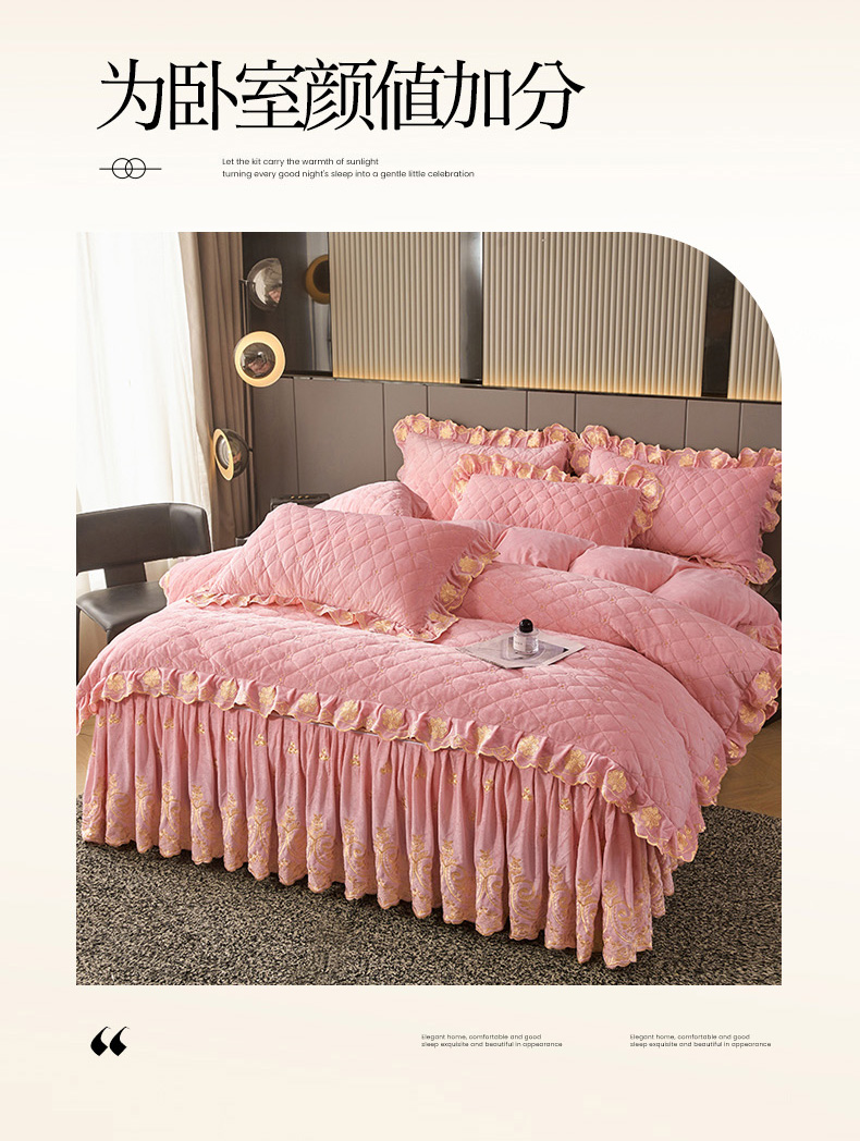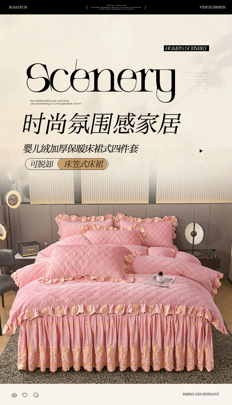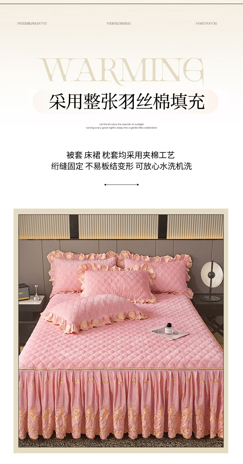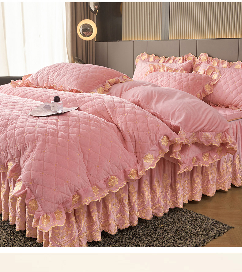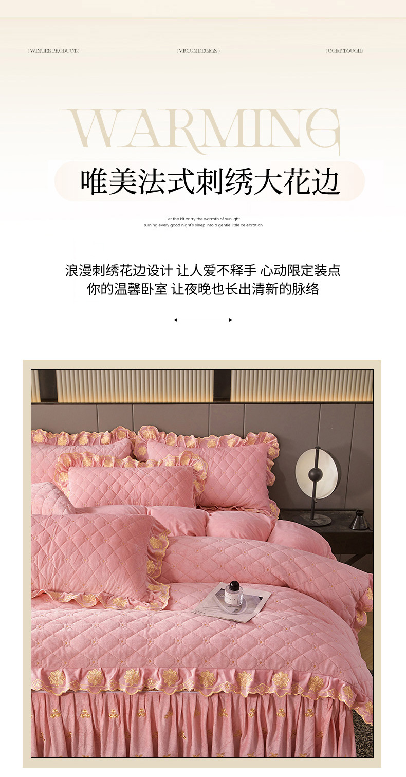 当前位置: 91家纺网 > 商品网购 > 床品套件 > 四件套 > 其它四件套 > 罗艺轩 2025新款婴儿绒加厚保暖床裙式四件套-心语 心语-樱花粉