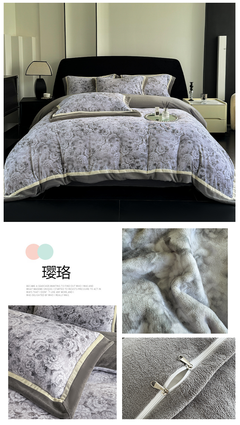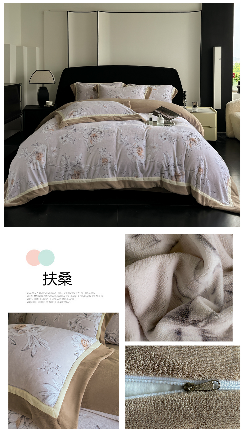 (总)娇逸家居 2025新款高克重A类数码印花牛奶绒双拼边款四件套,采薇灰,扶桑,浅影,秋灵粉,秋灵黄,秋灵绿,舜华粉,采薇米,舜华绿,仙客,栩蝶,璎珞,玉树,芸芙