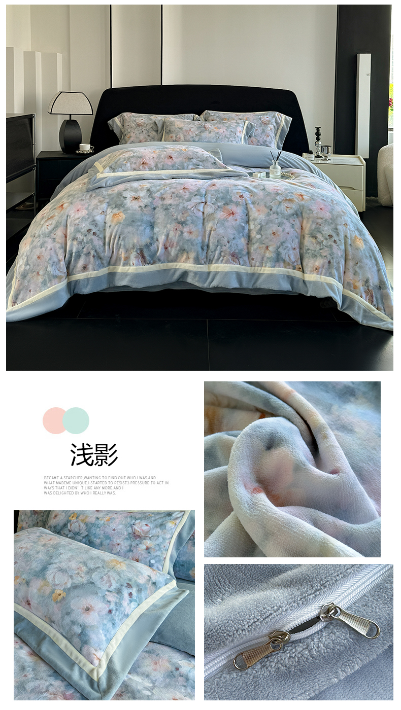 娇逸家居 2025新款高克重A类数码印花牛奶绒双拼边款四件套 舜华粉
