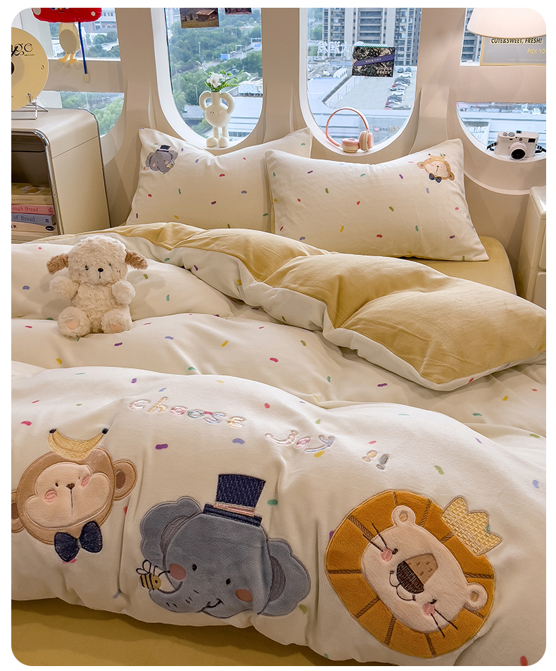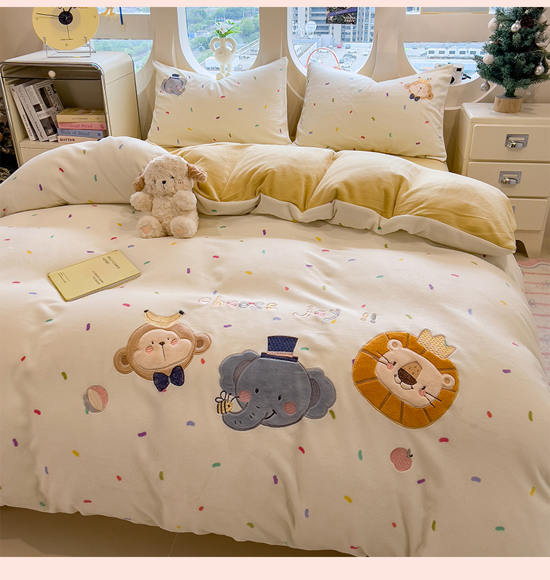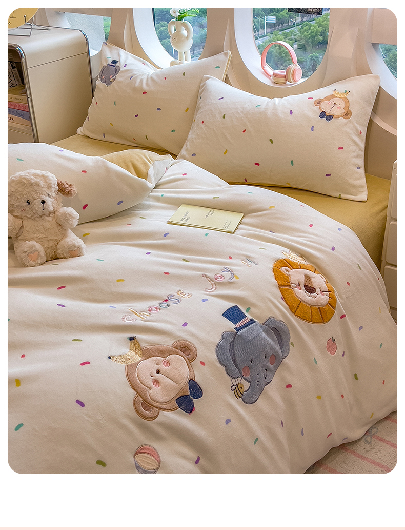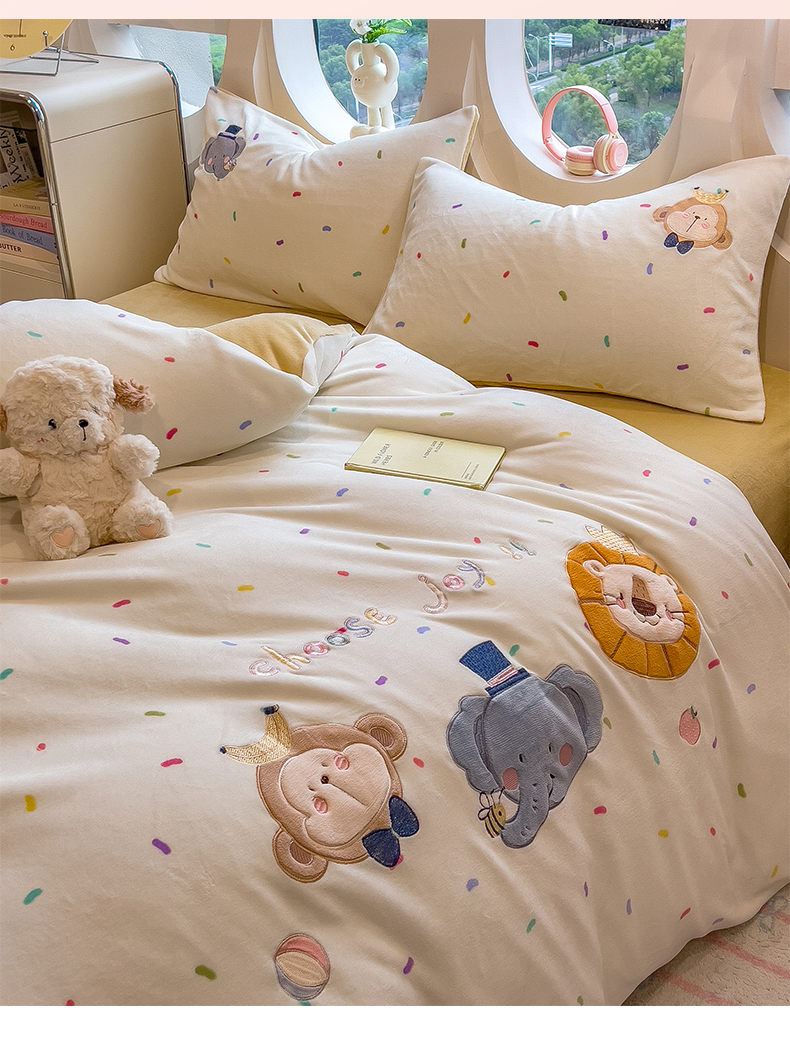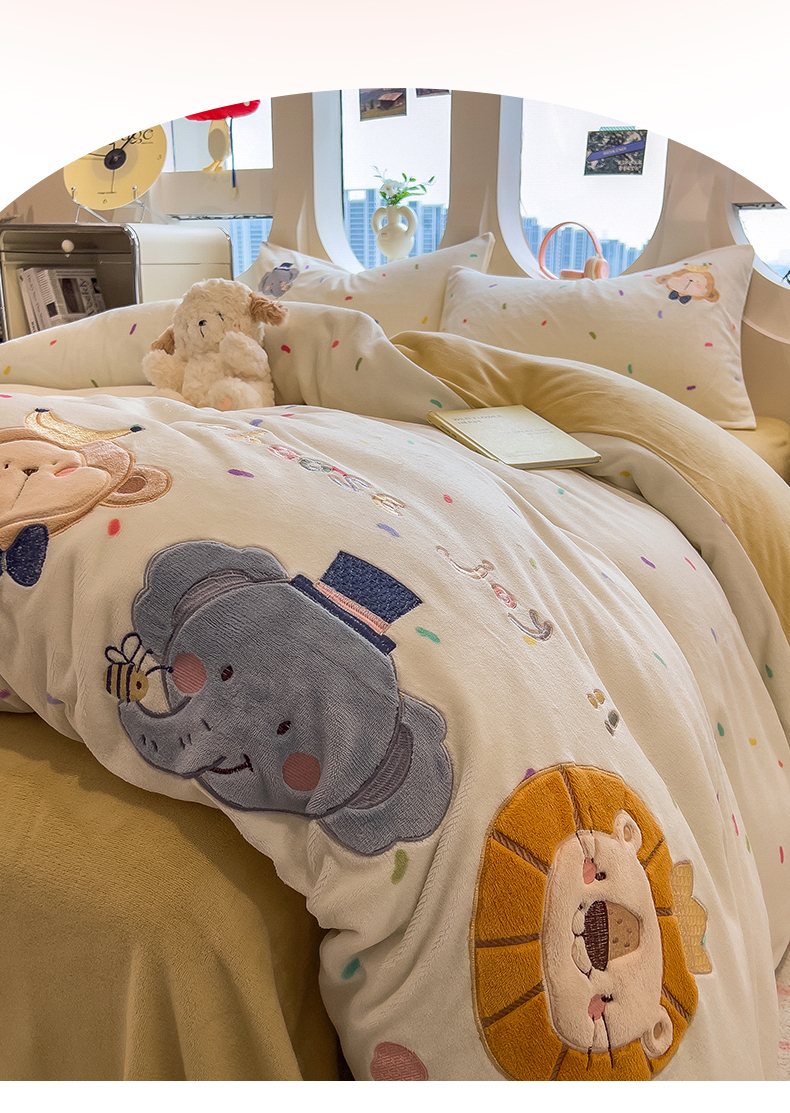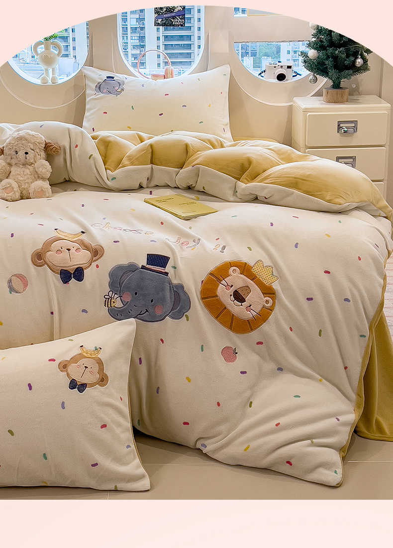 当前位置: 91家纺网 > 商品网购 > 床品套件 > 四件套 > 牛奶绒四件套 > 兄弟坊 2025新款卡通消光牛奶绒贴布绣四件套 有趣动物园