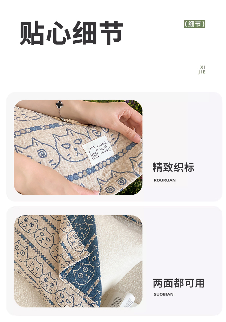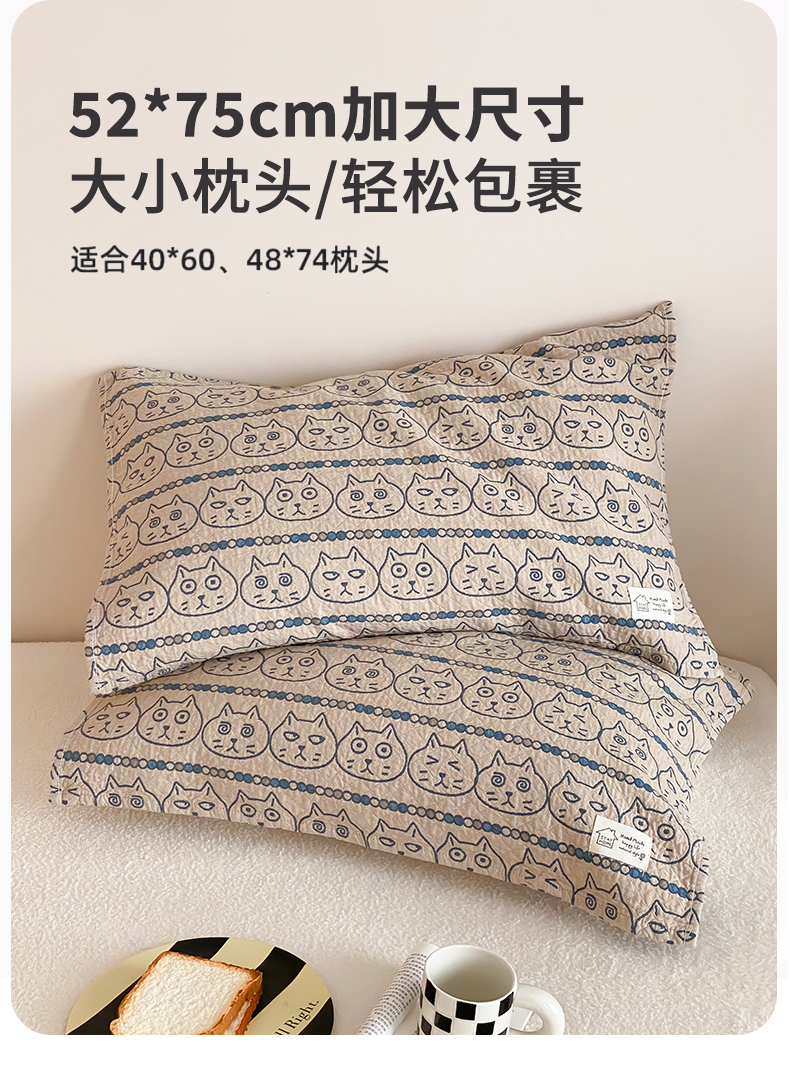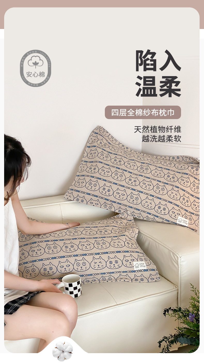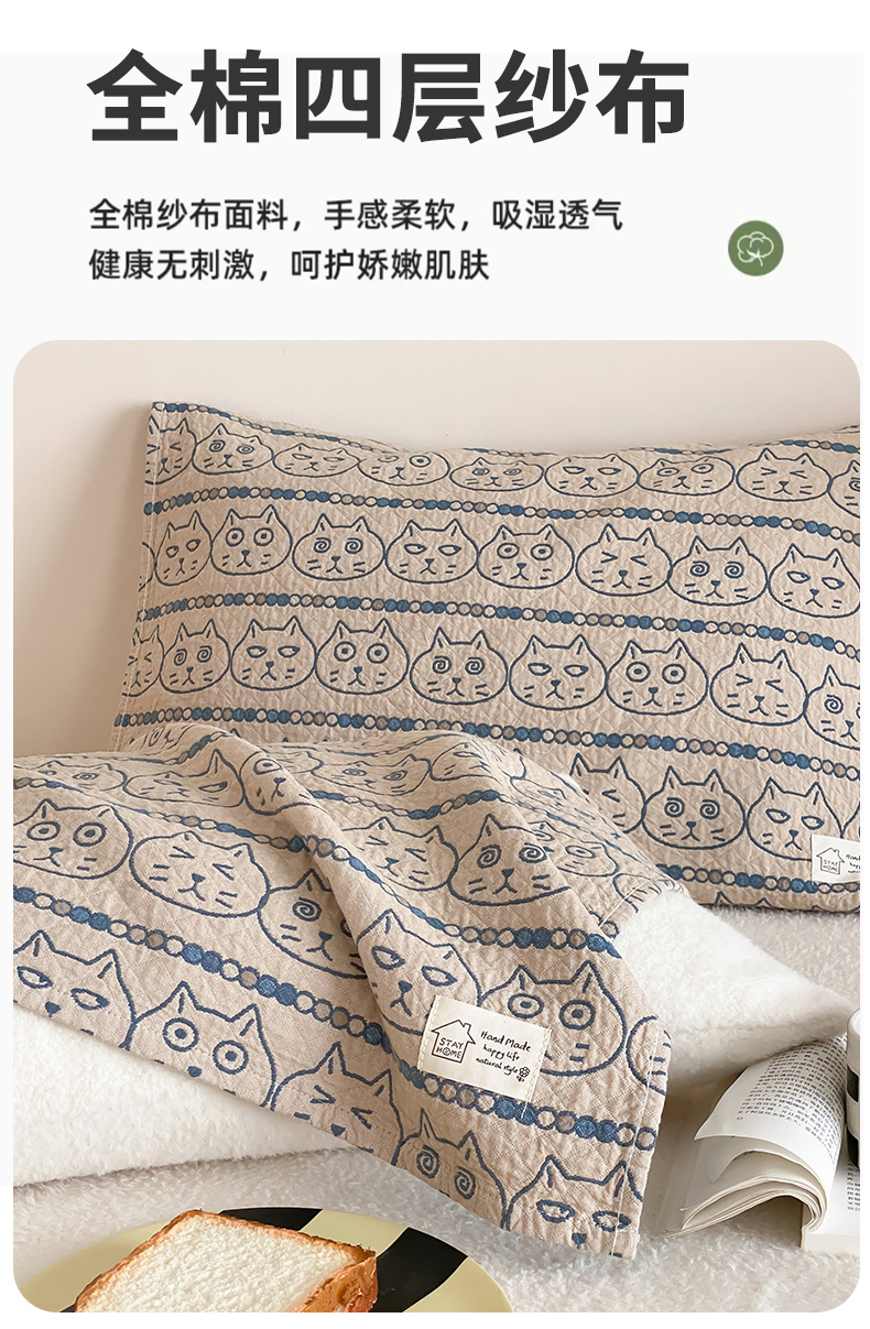 商品名称:麻依 2025新款安心棉枕巾四层全棉纱布枕头皮 搞怪猫
