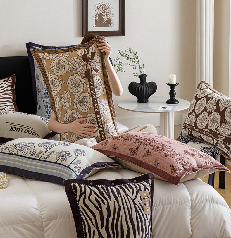 (总)悦然毛巾被 2025新款全棉四层提花纱布美拉德凤格枕套,花蝶红,花蝶咖,花蝶蓝,蔓叶咖,蔓叶蓝,蔓叶棕,玫瑰格调咖,玫瑰格调棕,素布花灰,素布花蓝,野韵,野韵棕,组合