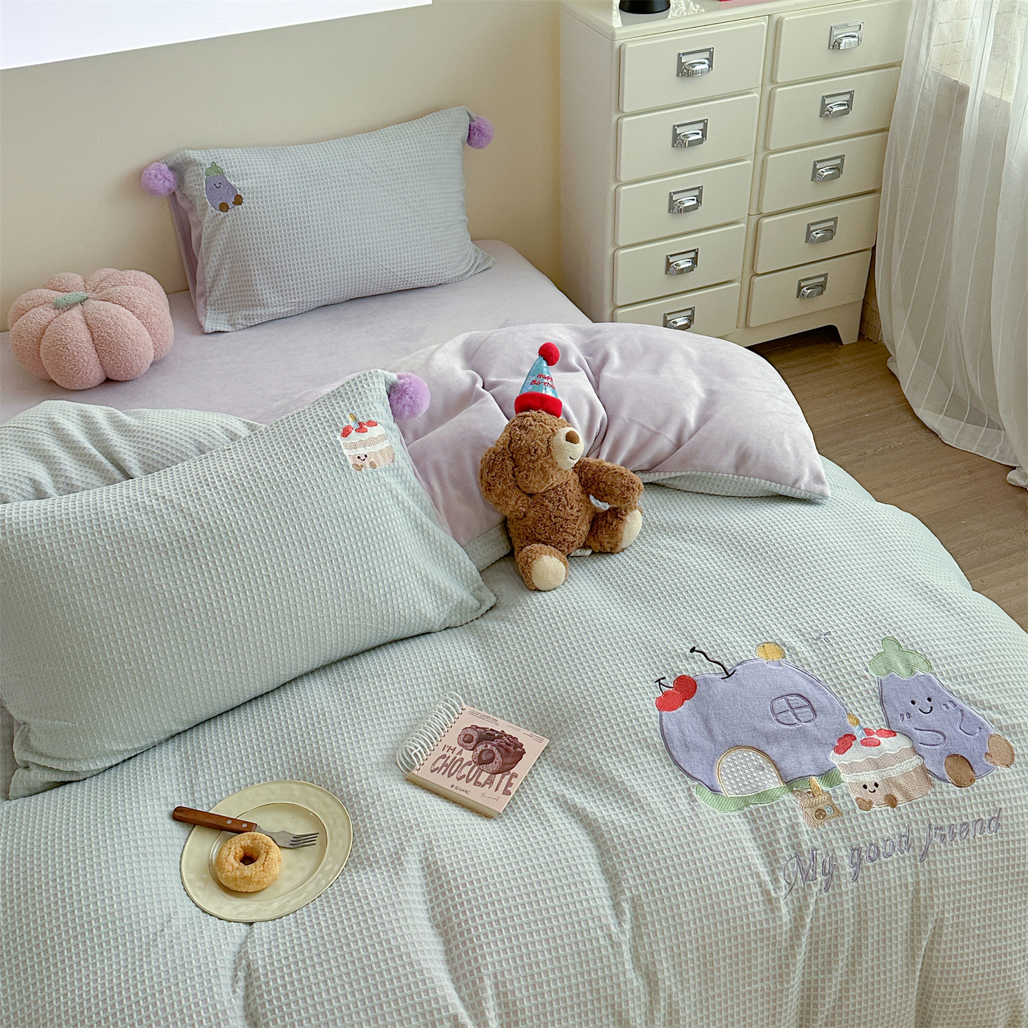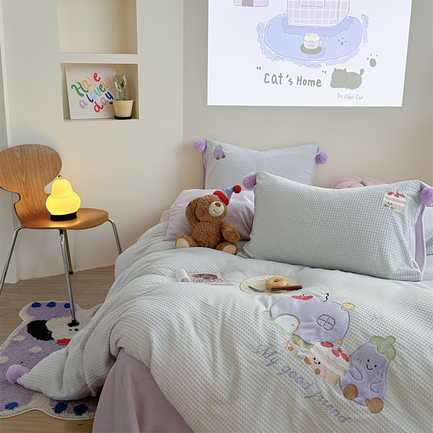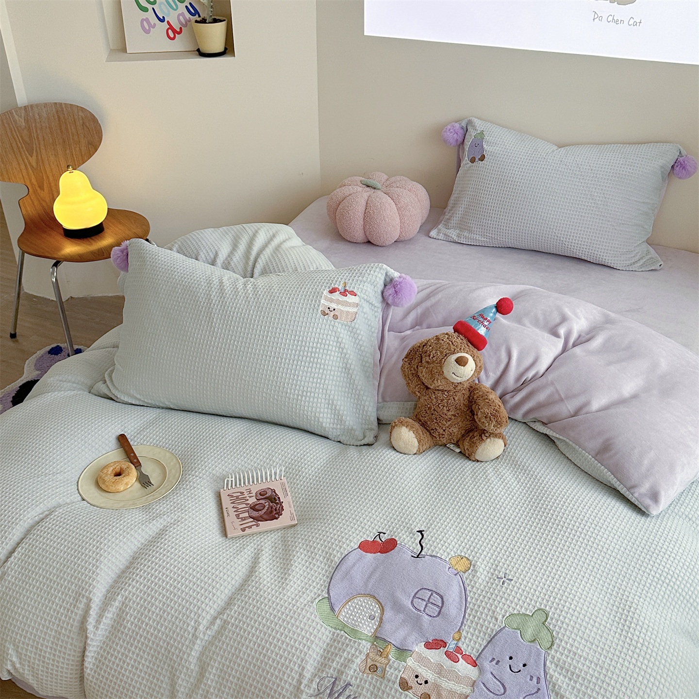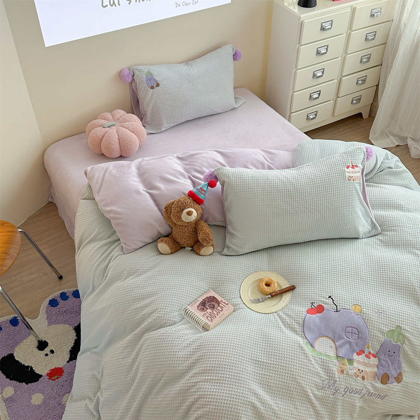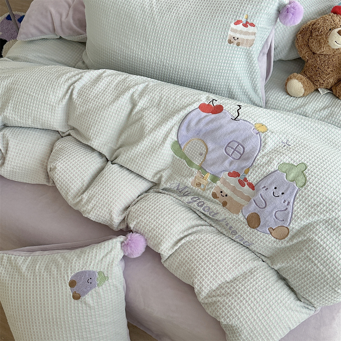 柚子YOUTH 2025新款华夫格提花绒刺绣四件套 茄子蛋糕屋