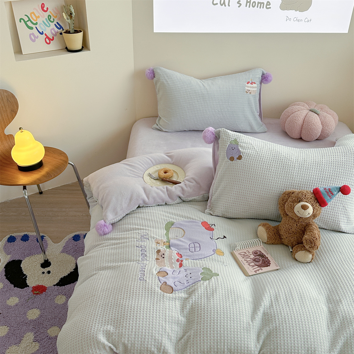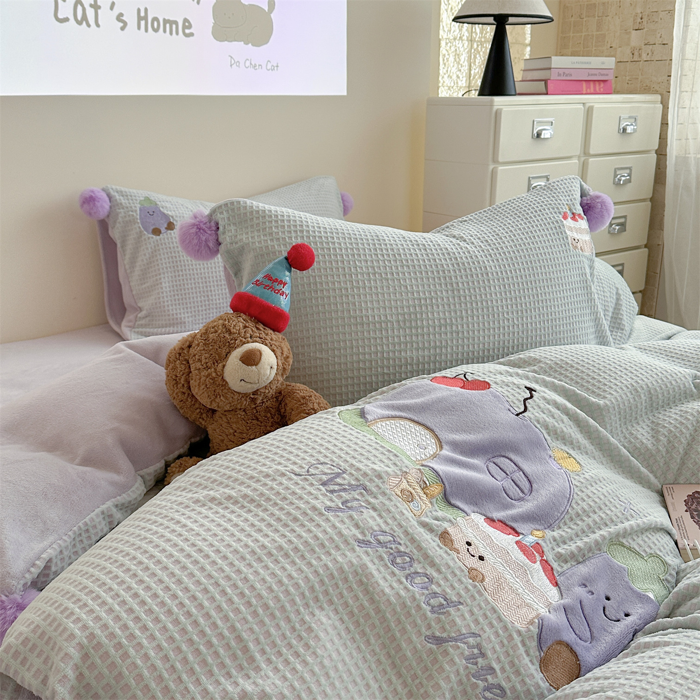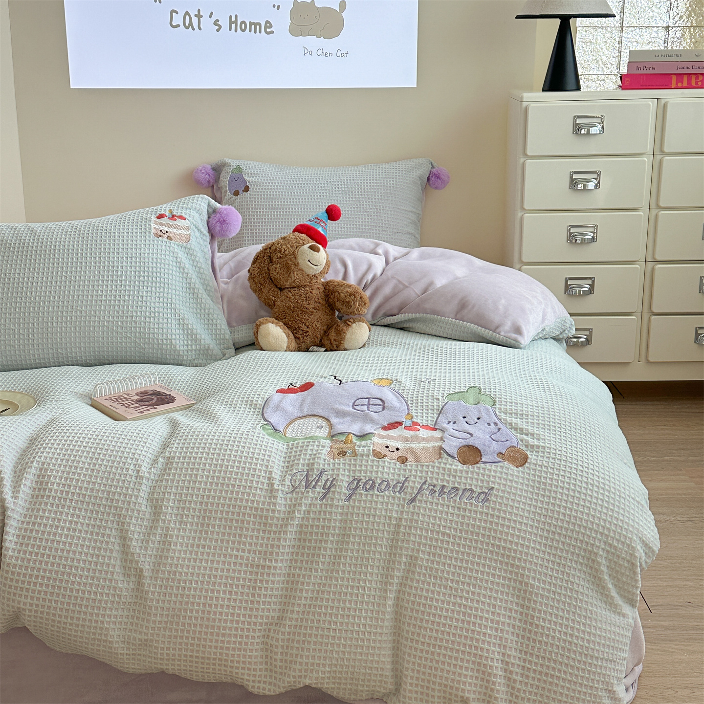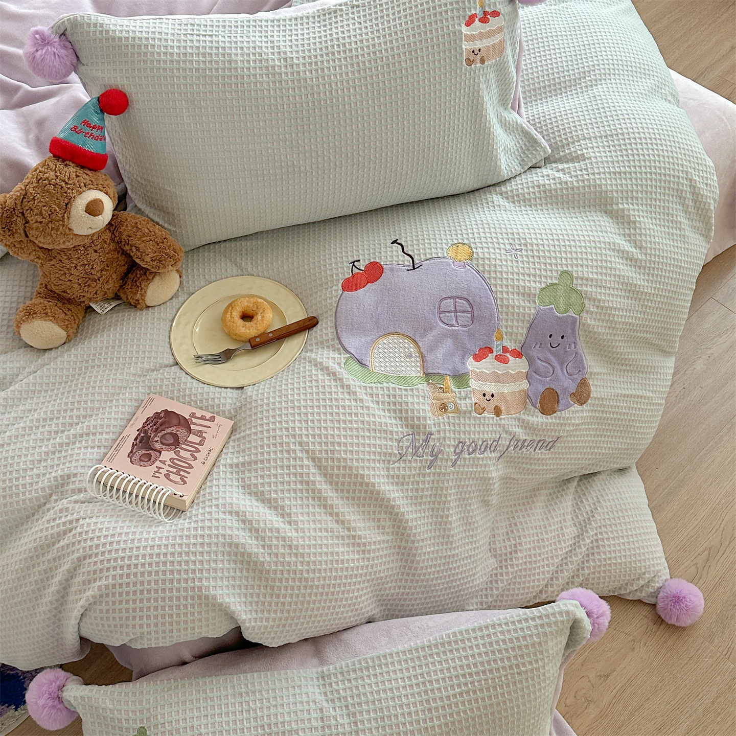 柚子YOUTH 2025新款华夫格提花绒刺绣四件套 茄子蛋糕屋