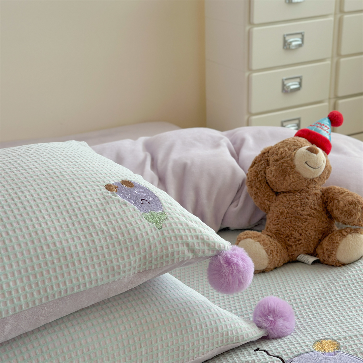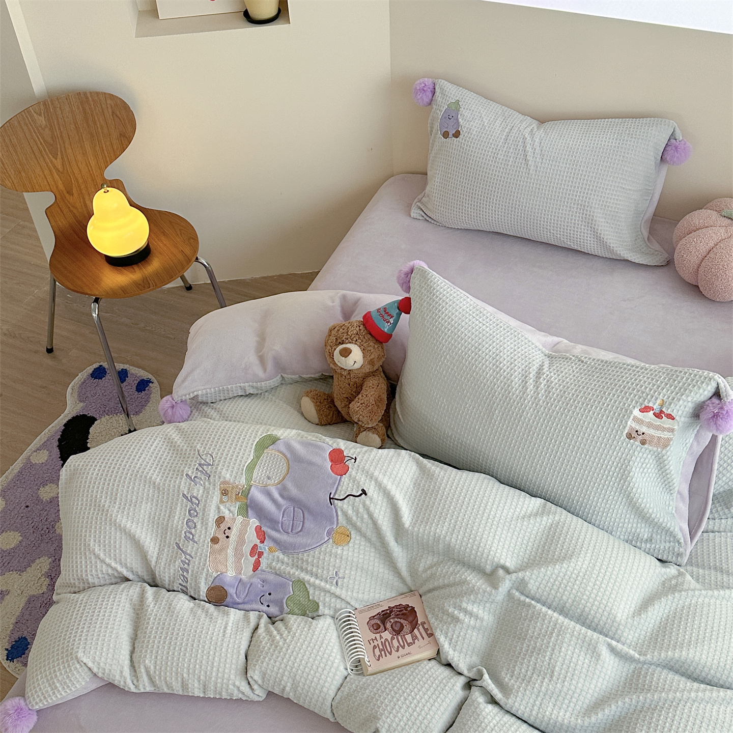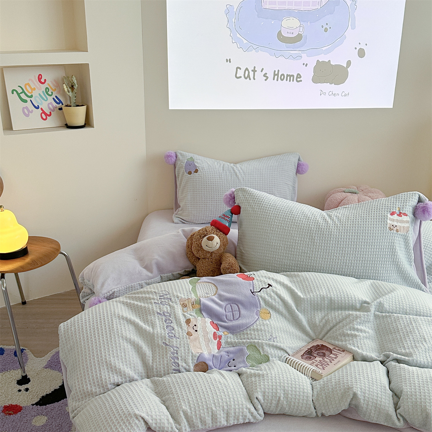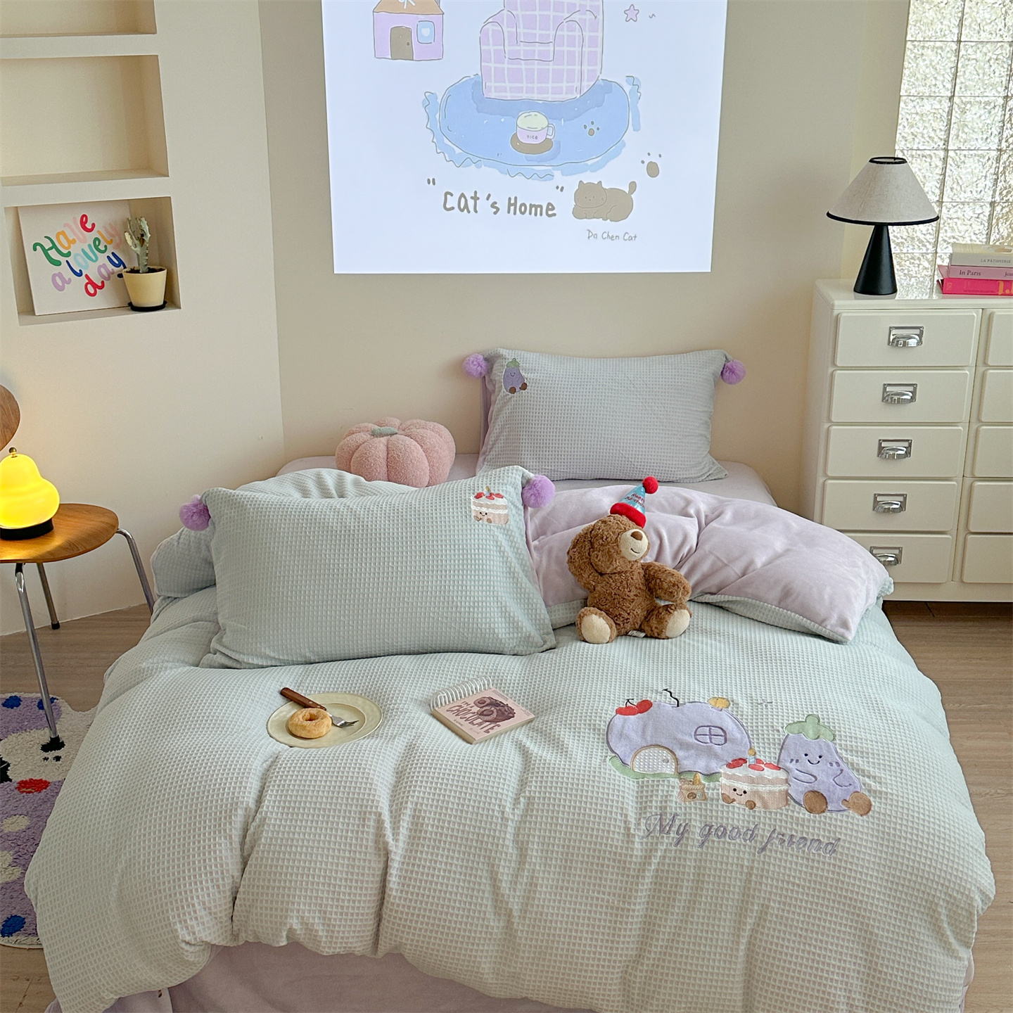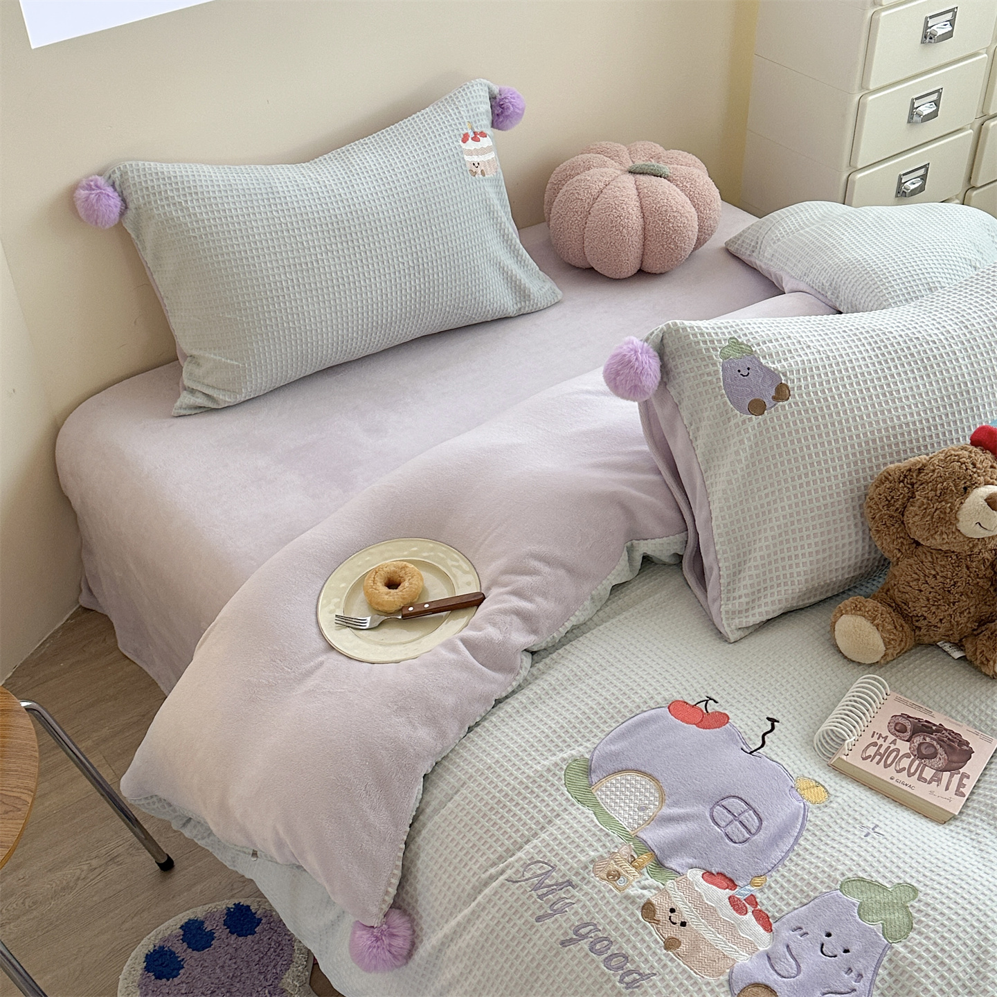 柚子YOUTH 2025新款华夫格提花绒刺绣四件套 茄子蛋糕屋