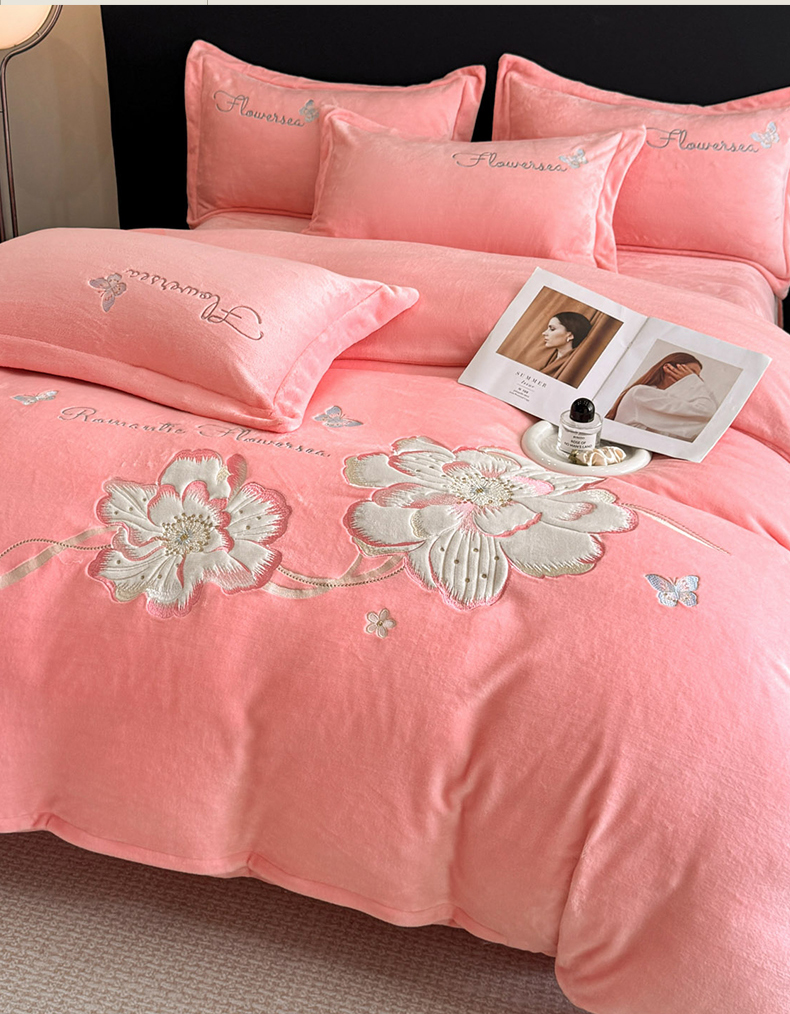 畅畅家纺 2025新款牛奶绒大版贴布绣四件套 富贵花开-粉色