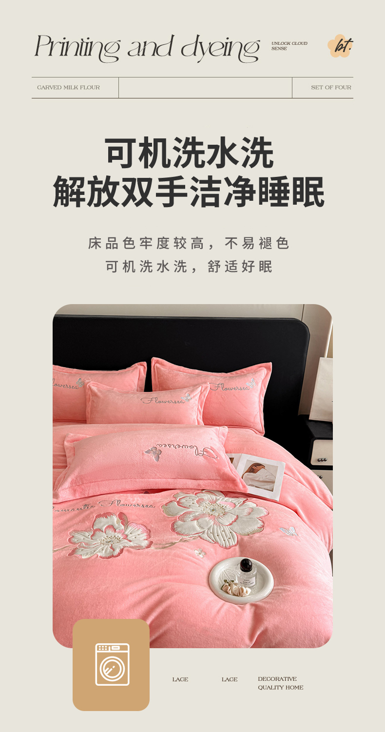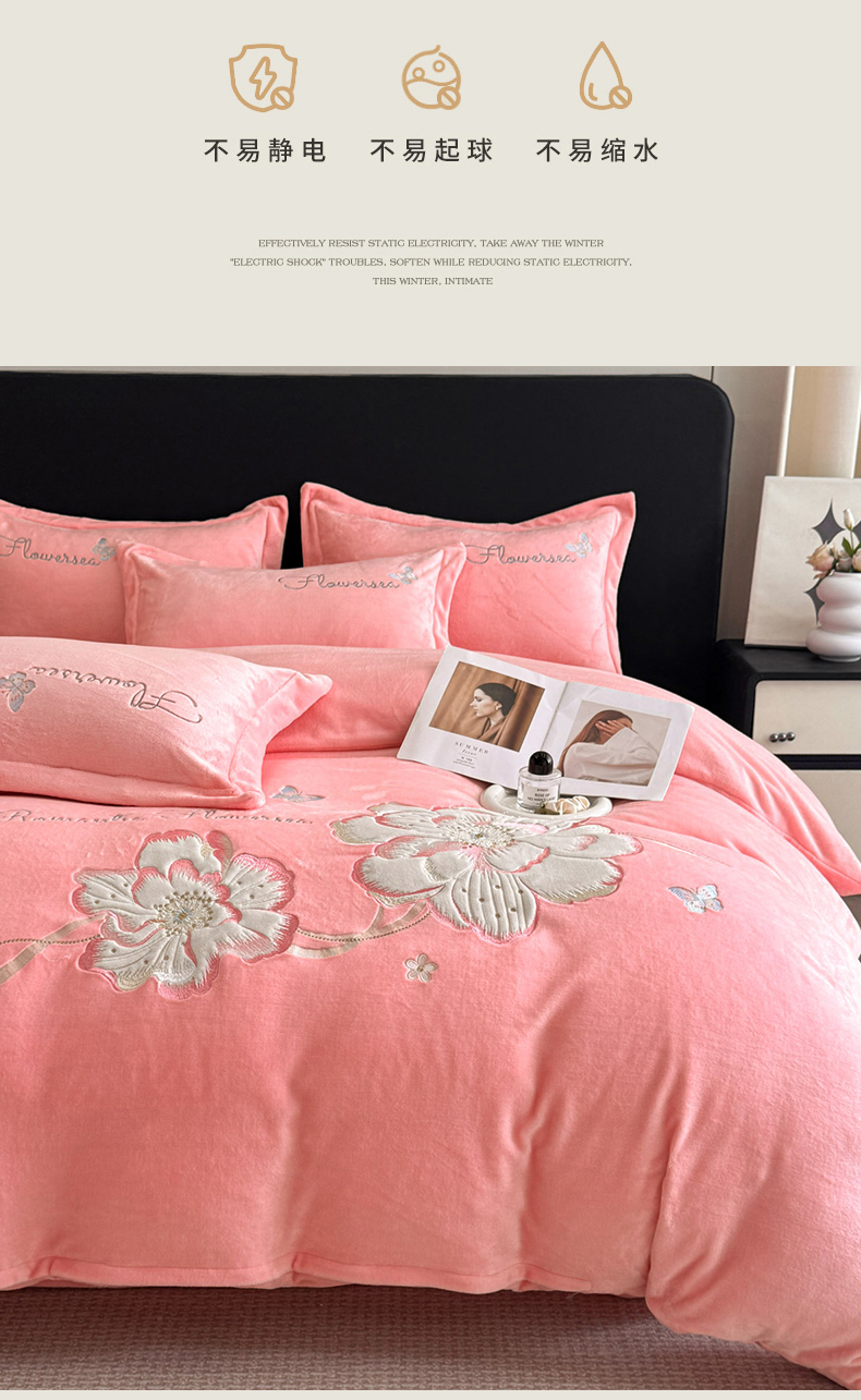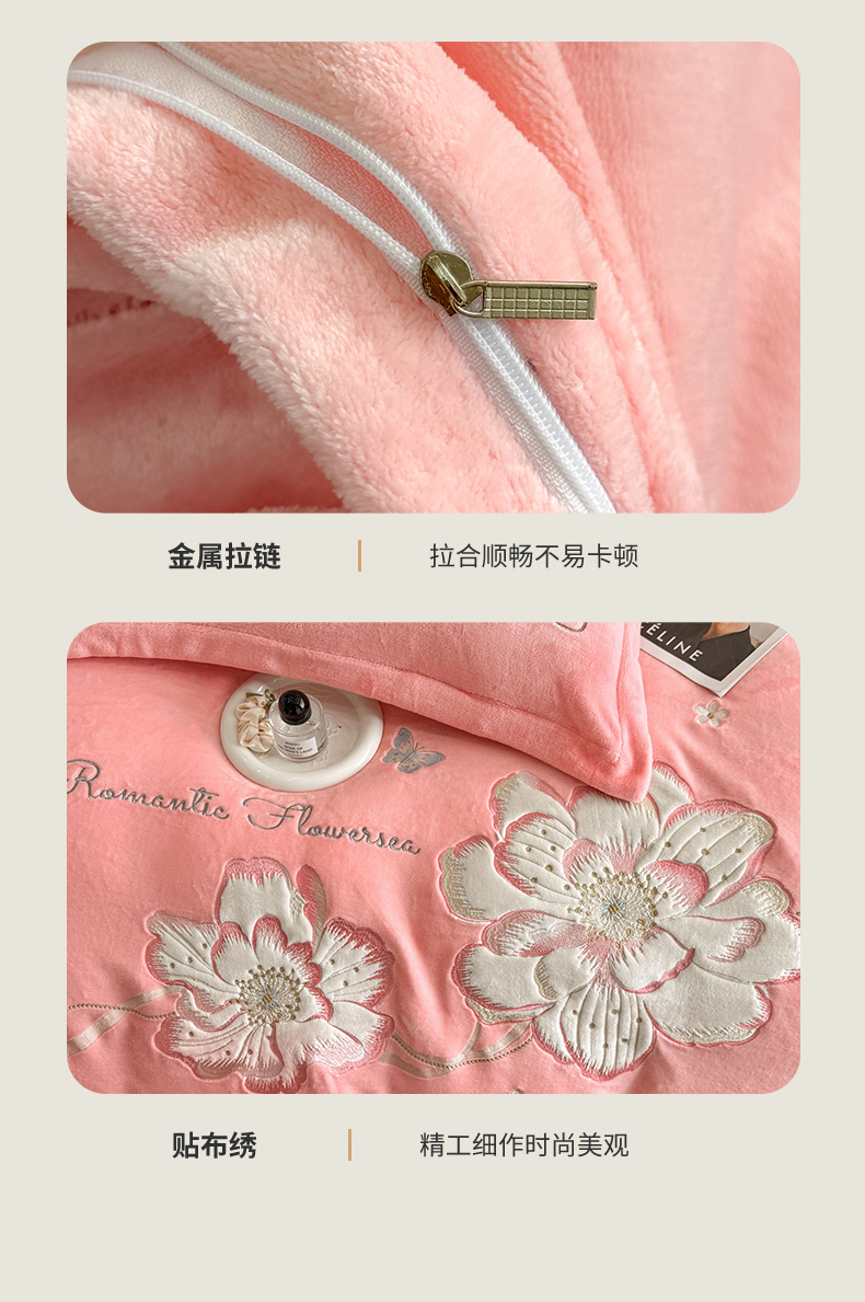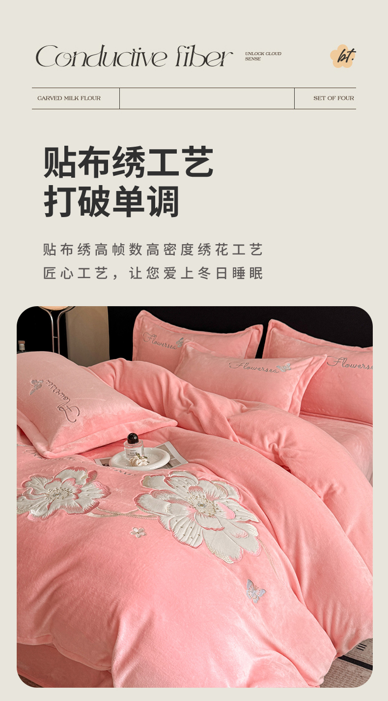 商品名称:畅畅家纺 2025新款牛奶绒大版贴布绣四件套 富贵花开-粉色