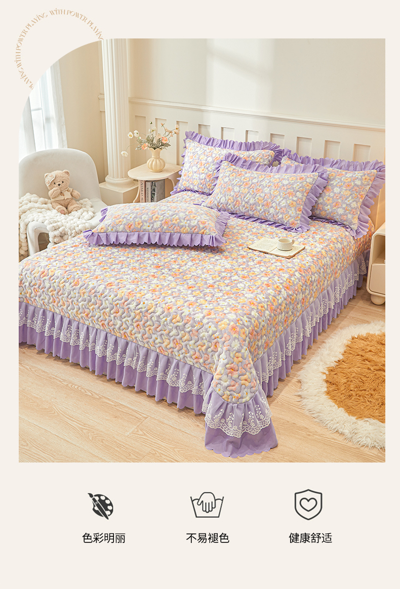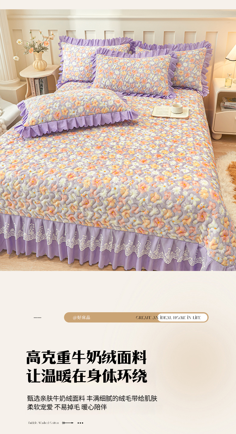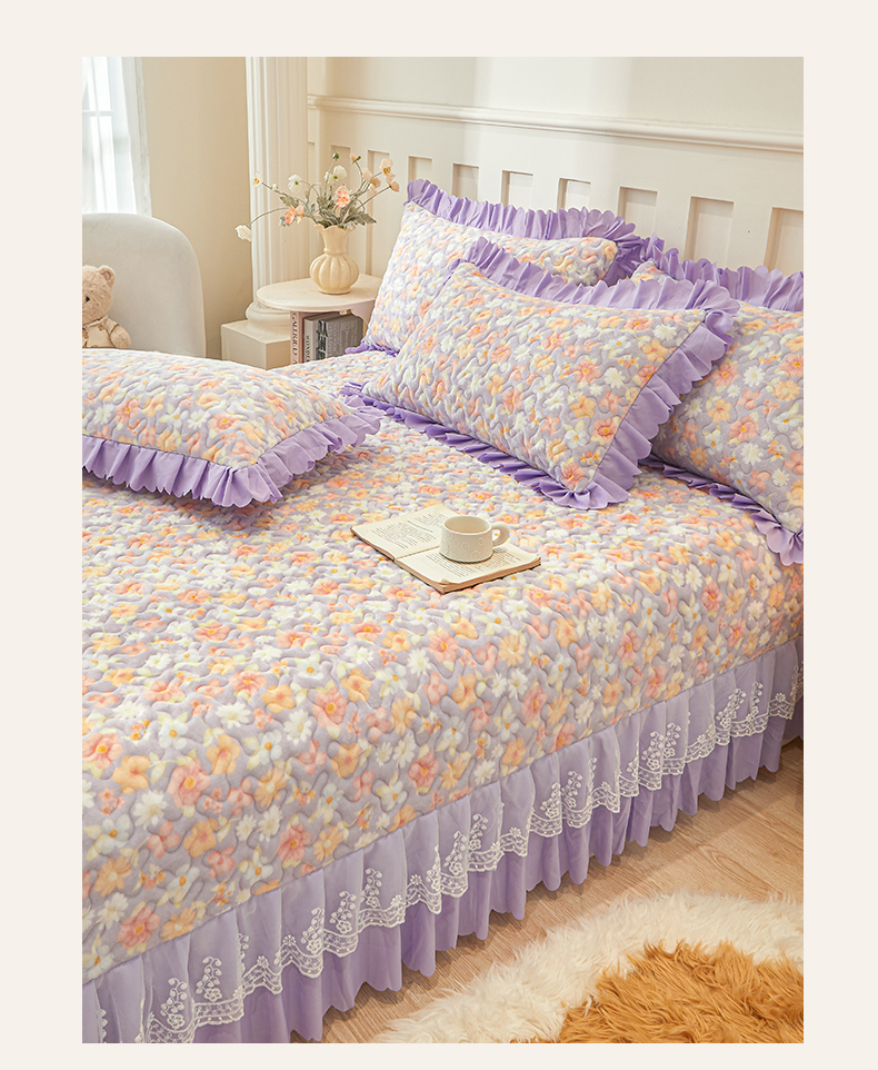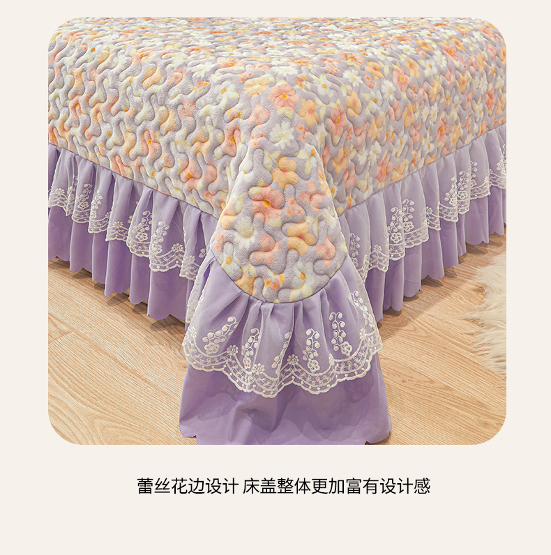 当前位置: 91家纺网 > 商品网购 > 床品套件 > 三件套 > 艾裙海 2025新款蕾丝边牛奶绒床盖三件套 花漾-紫