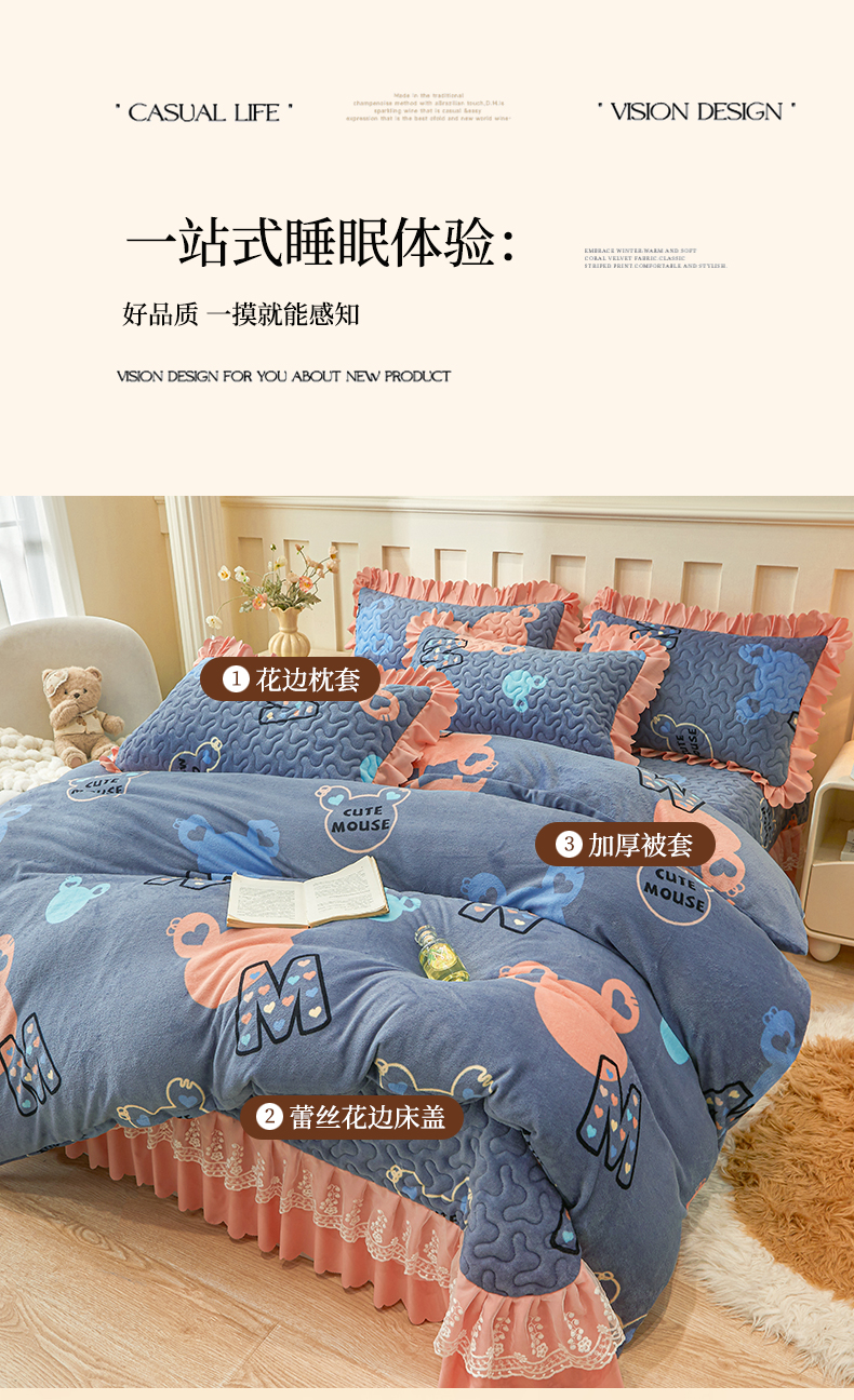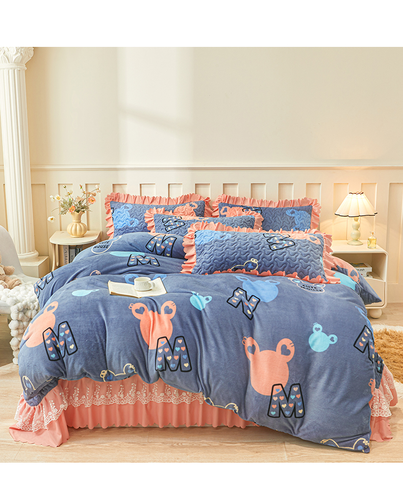 当前位置: 91家纺网 > 商品网购 > 床品套件 > 四件套 > 牛奶绒四件套 > 艾裙海 2025新款蕾丝边牛奶绒床盖四件套 米奇妹妹