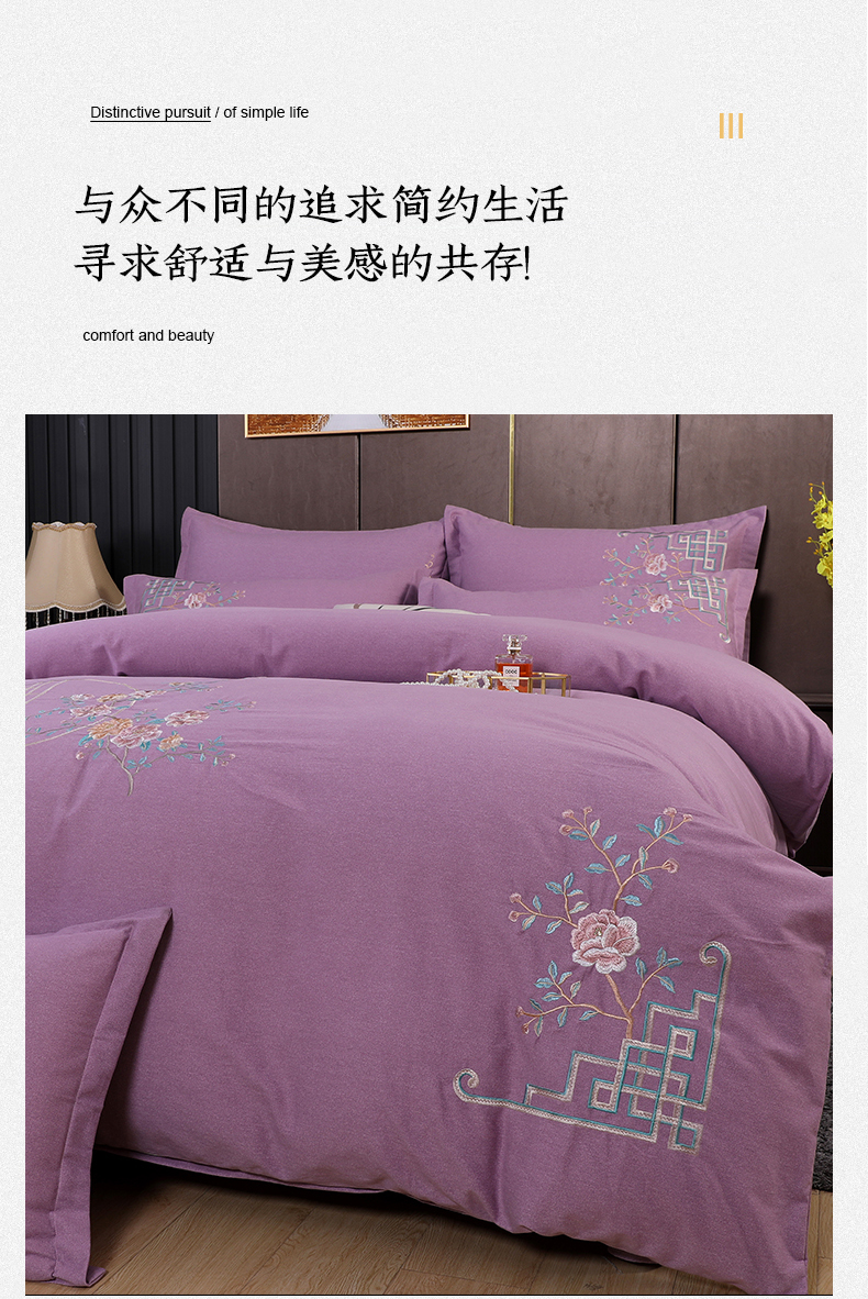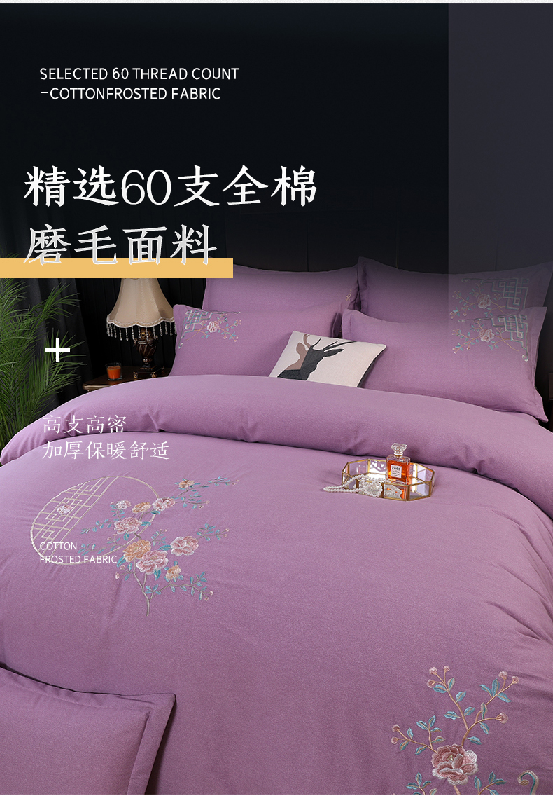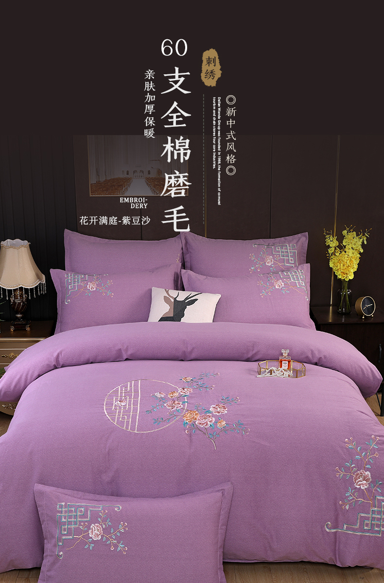 浩情国际婚庆供货中心 2026新款秋冬60S高端全棉刺绣磨毛系列 花开满庭-紫豆沙