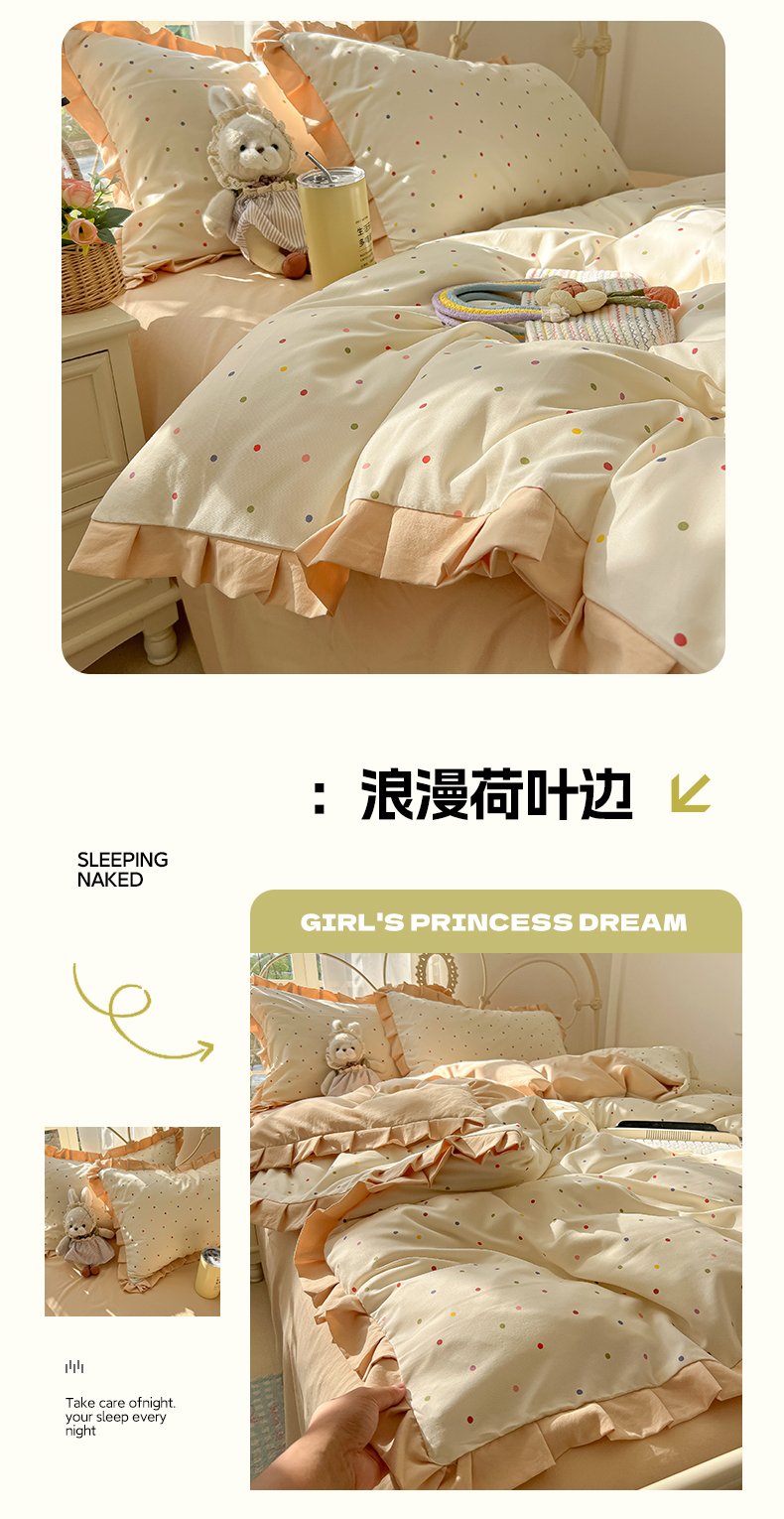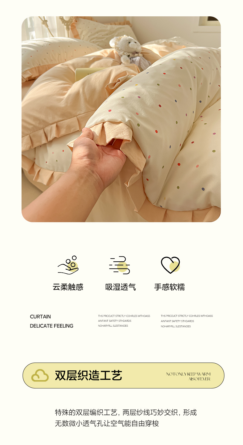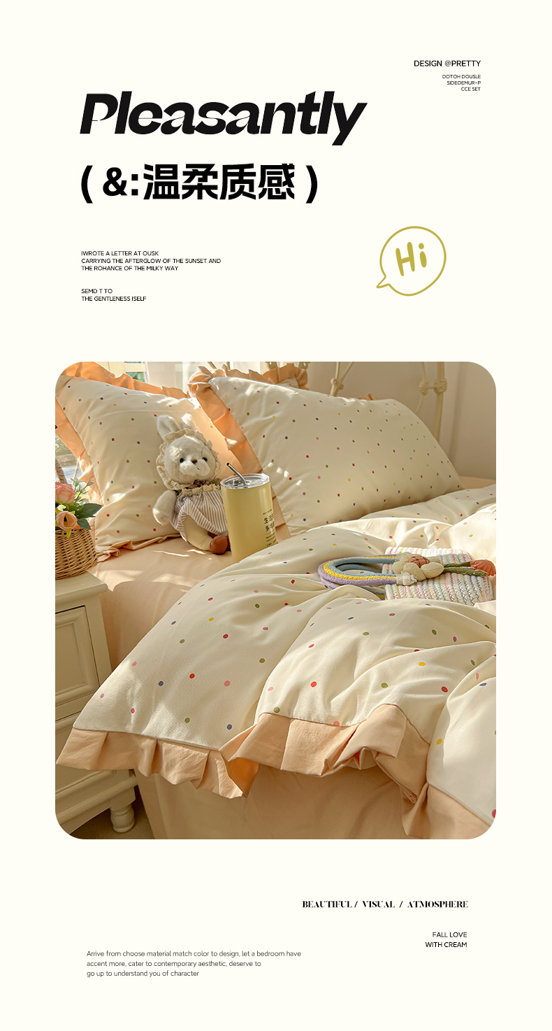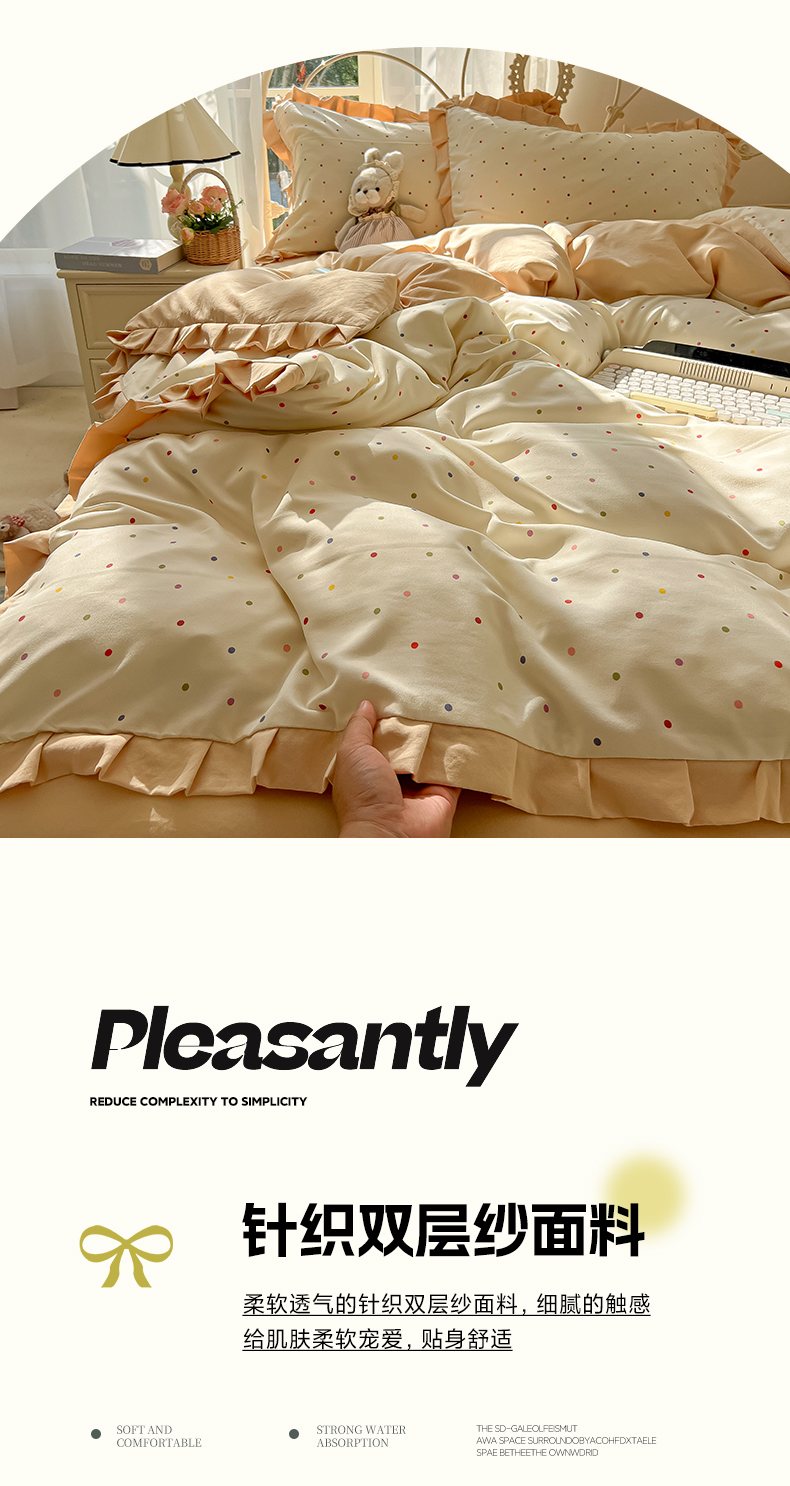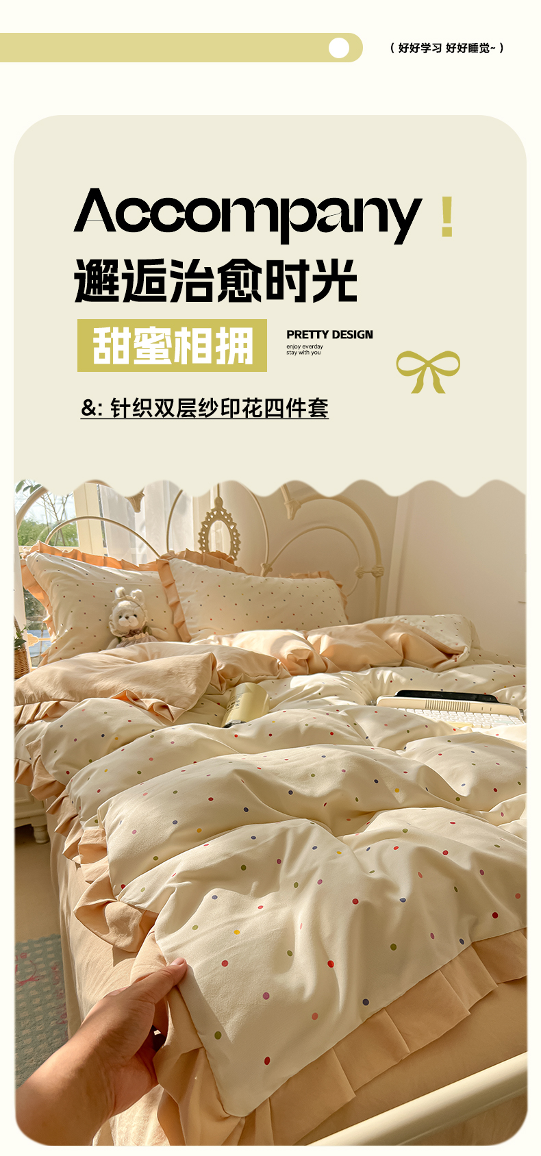 当前位置: 91家纺网 > 商品网购 > 床品套件 > 四件套 > 双层纱四件套 > 韩巢家纺 2026新款花边款针织双层纱四件套 奶油波点米