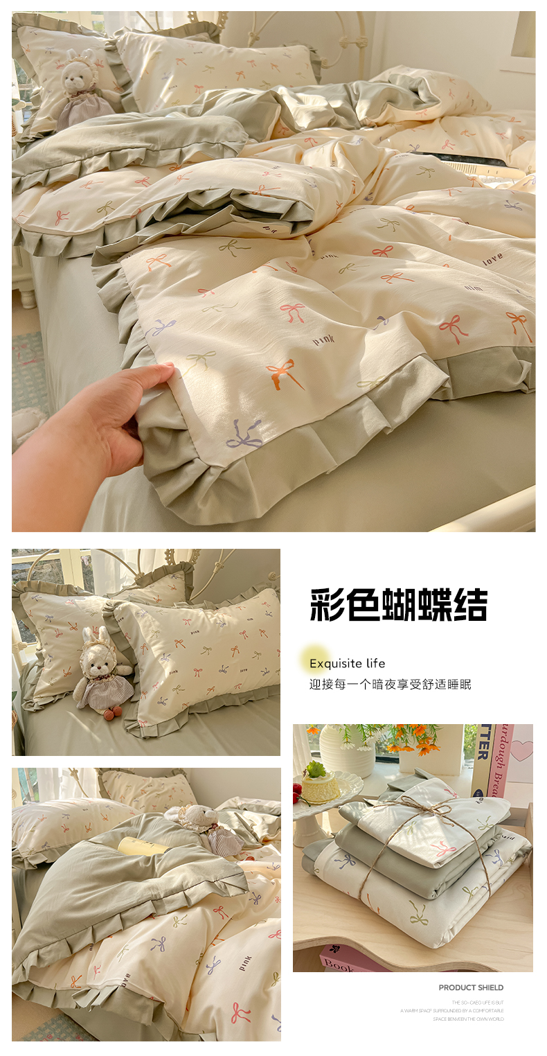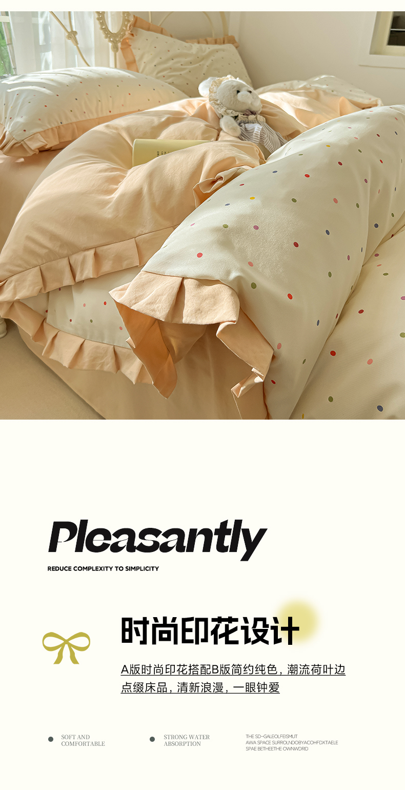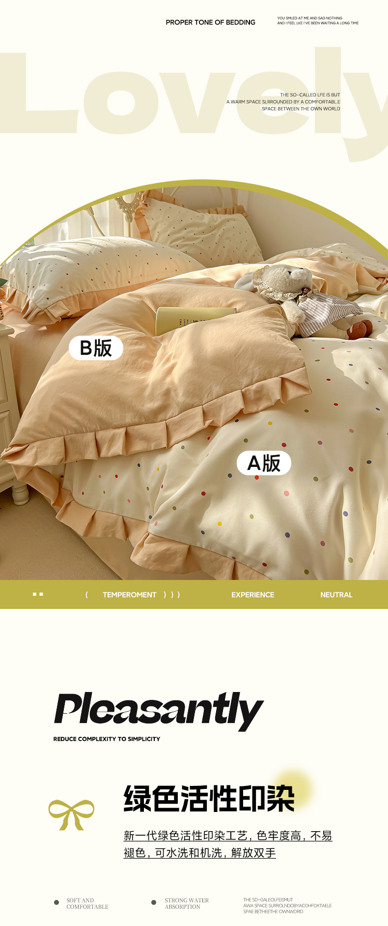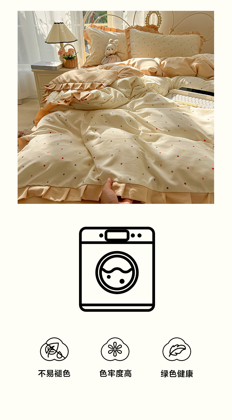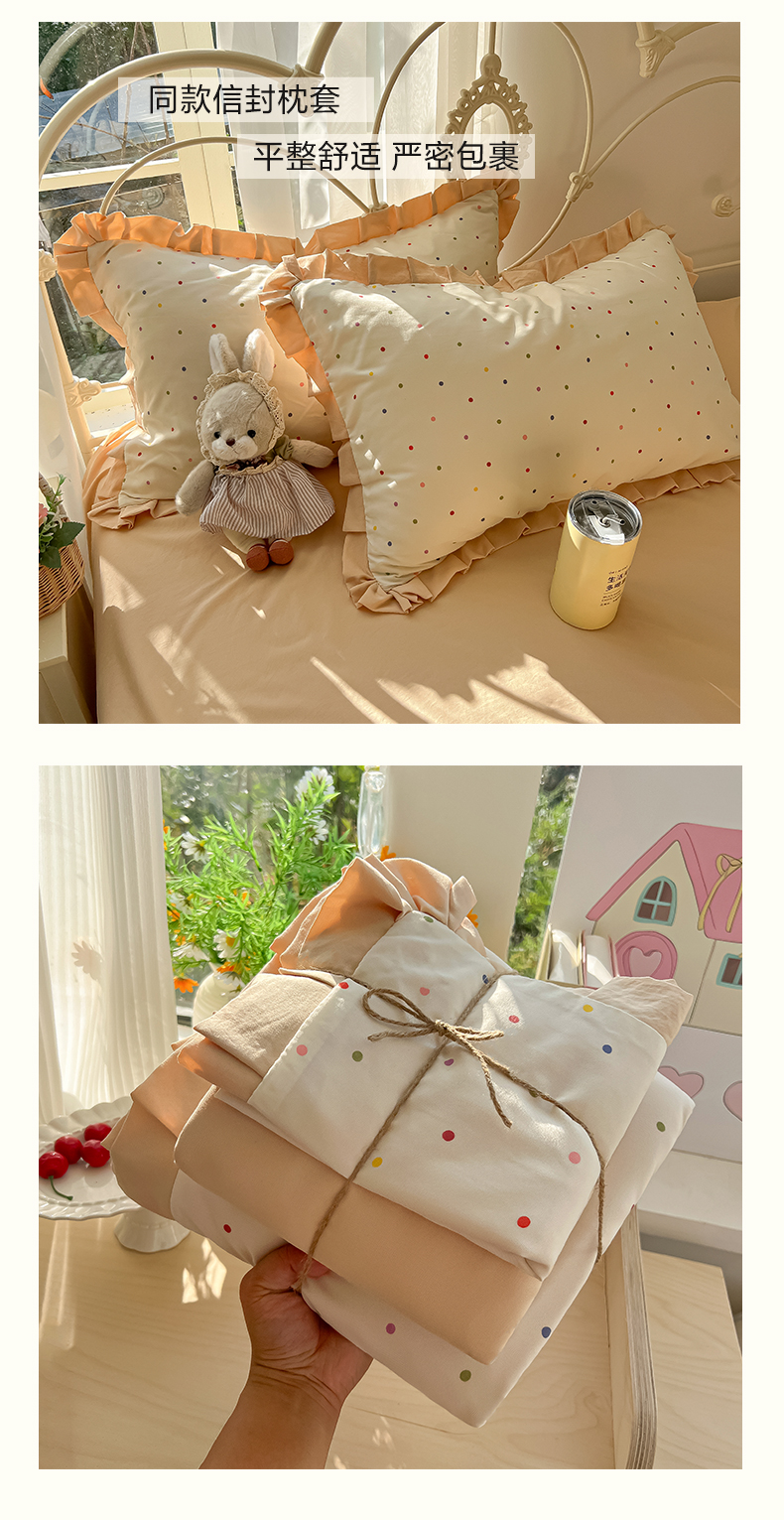 当前位置: 91家纺网 > 商品网购 > 床品套件 > 四件套 > 双层纱四件套 > 韩巢家纺 2026新款花边款针织双层纱四件套 奶油波点米