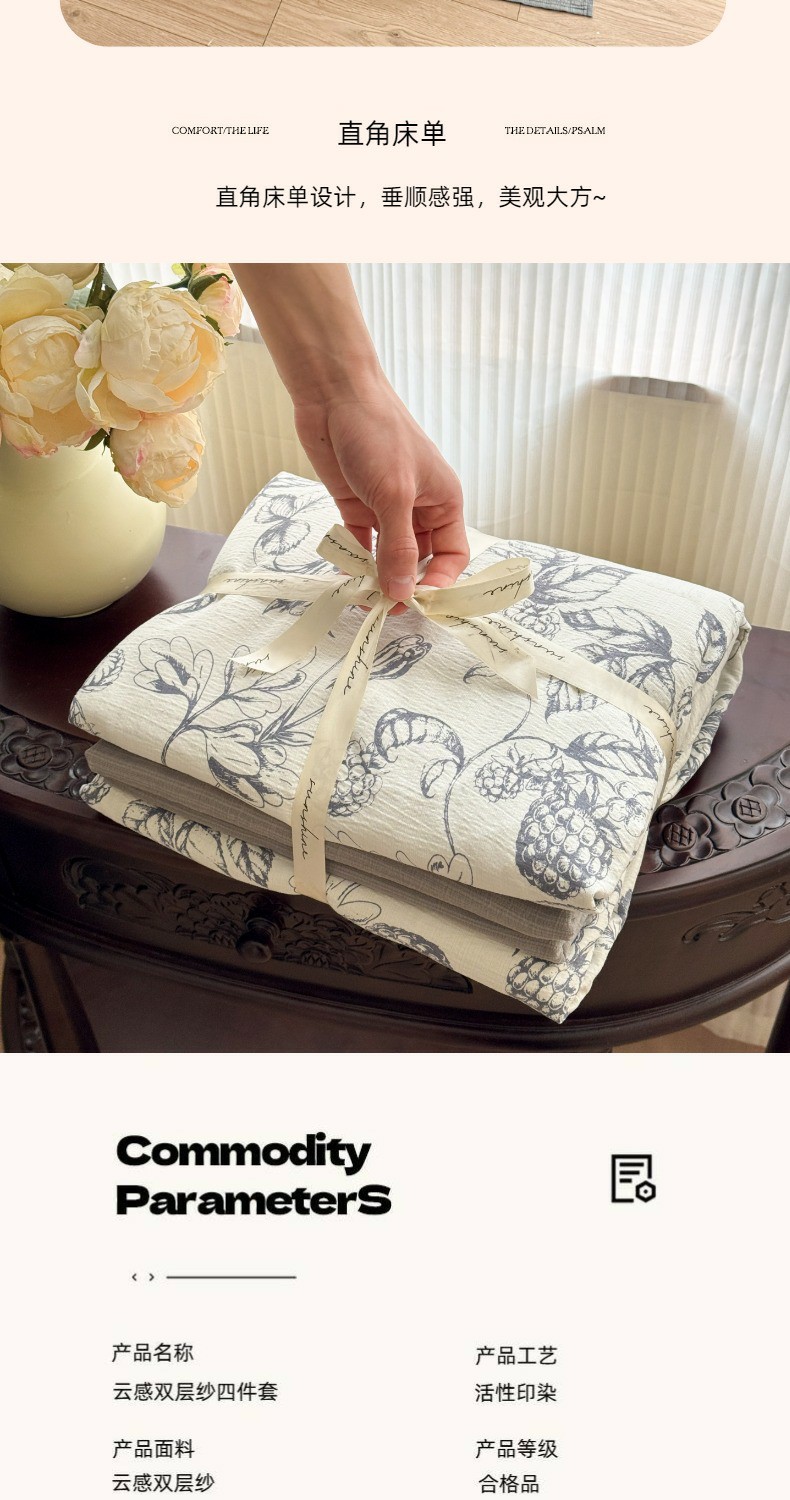 (总)温眠家纺 2026新款亲肤舒适甄选三层纱印花套件系列四件套,贩卖夏风-蓝,花丛点点猫,樱桃蝴蝶,蕾丝熊,葡萄腊肠狗,糖豆腊肠狗,星月天空,樱桃物语,雨爱,圆舞曲,芭乐米菲,彩波波,彩虹世界,动物团团,莓果结,梅森粉,莫奈-咖,沐风,秋月梨,小狗集合会,小黑豆,小花点点,幸运星,南瓜派,复古修狗,碱水结,蓝莓小猫,玫瑰夜-绿