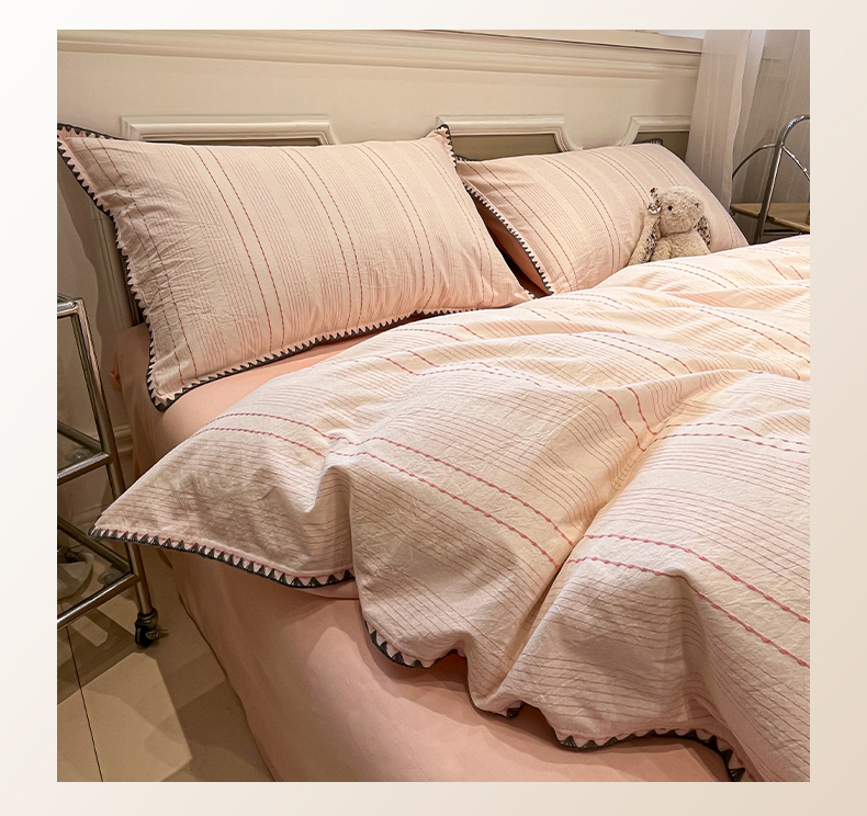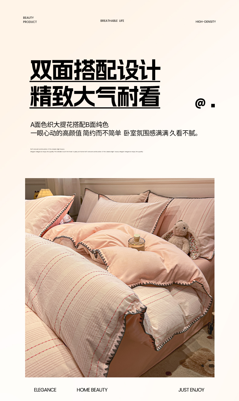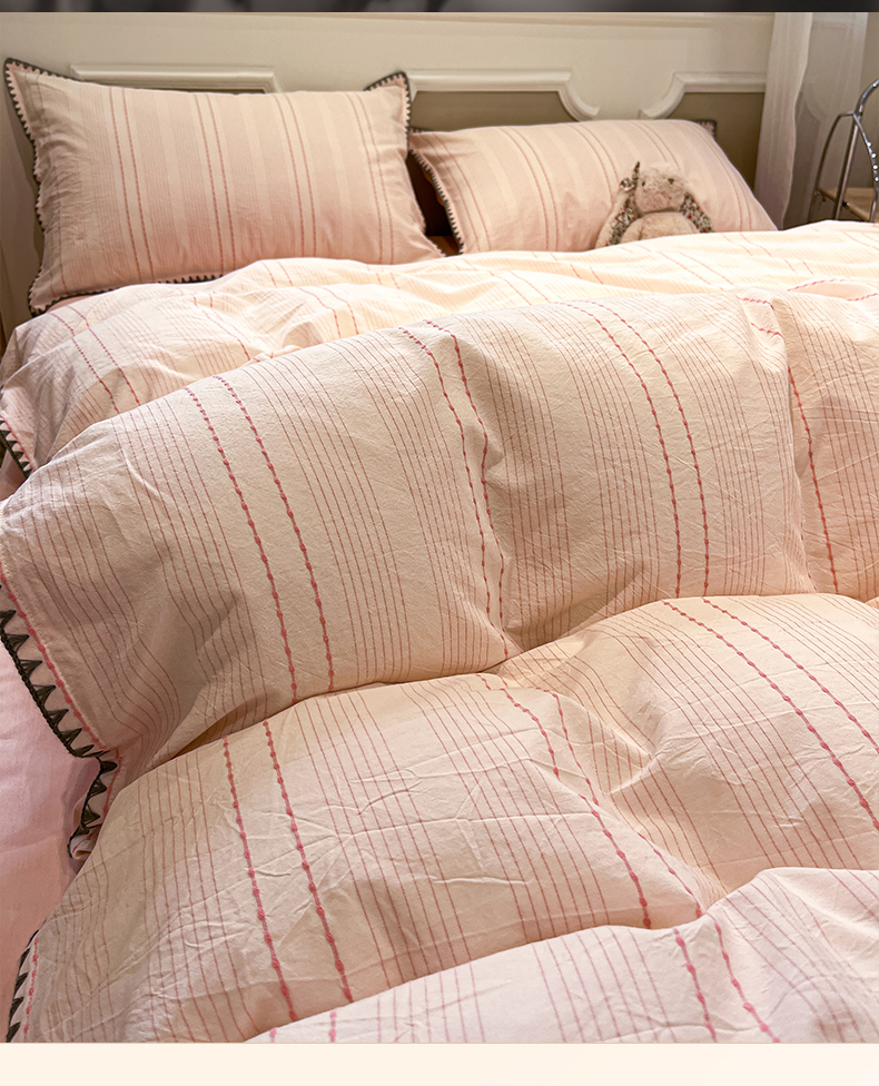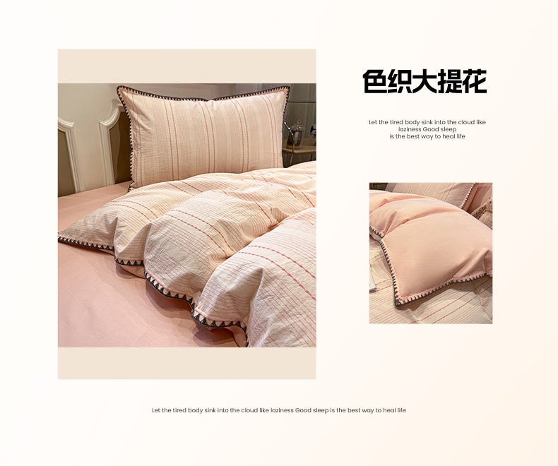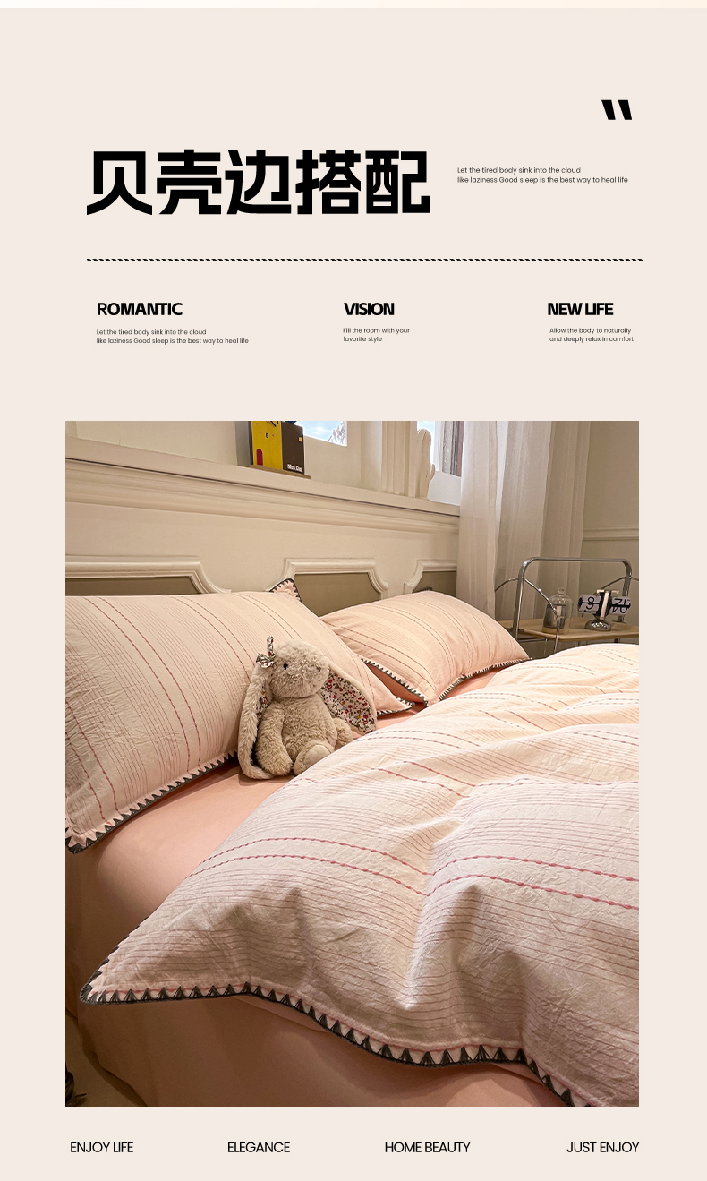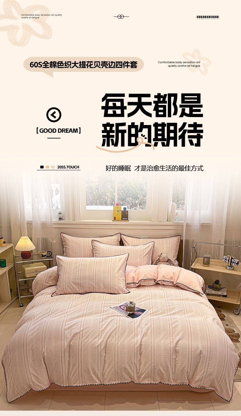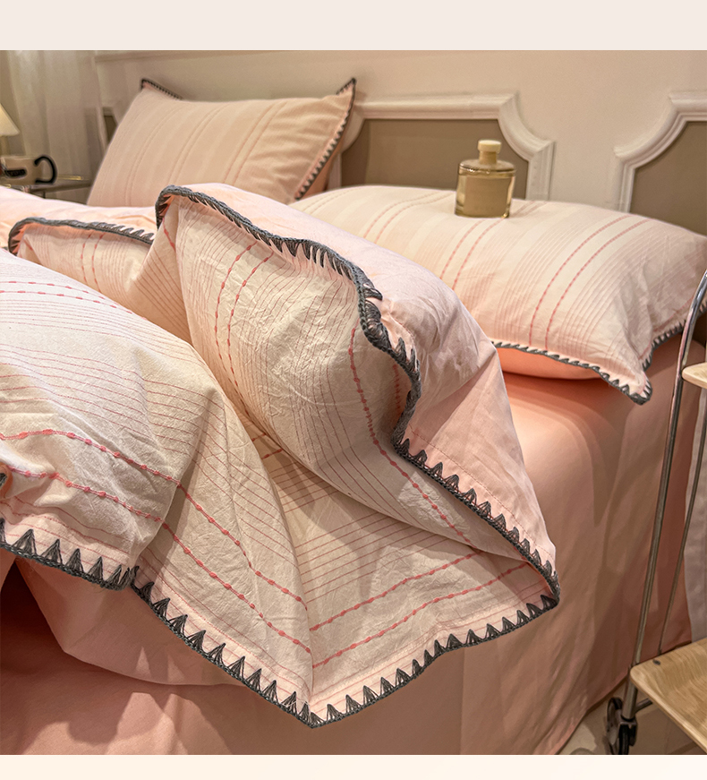 当前位置: 91家纺网 > 商品网购 > 床品套件 > 四件套 > 全棉普通四件套 > 莱茵家居 2026新款A类全棉纯棉色织大提花贝壳边四件套-序语松间系列 序语-粉