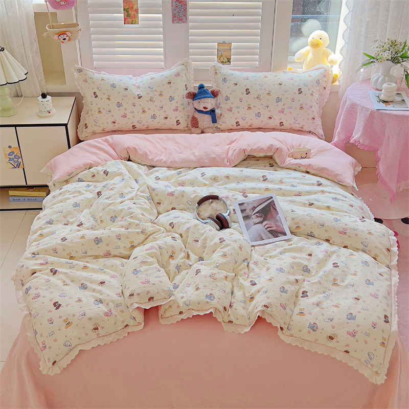(总)壹号库家纺 2026新款云感木棉皱皱纱双层纱四件套-全棉花边款,白茶,豆蔻,木兮绿,蕾丝小兔,快乐小象,梦露,百福(兰),甜茶,西高地,芝士奶酪