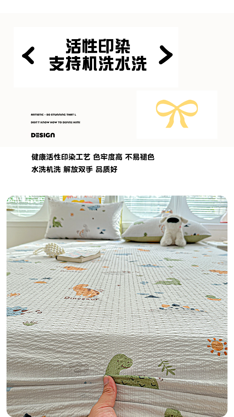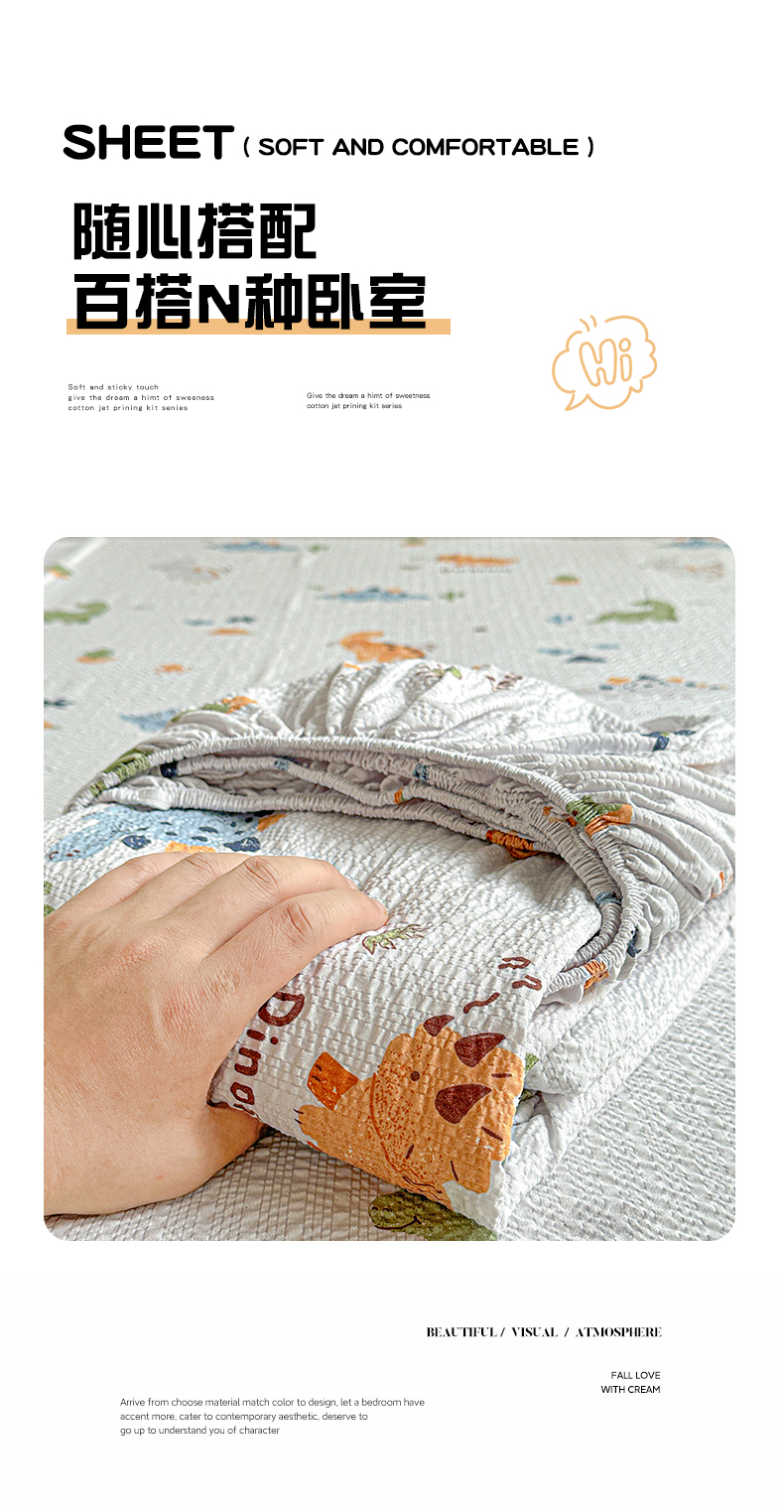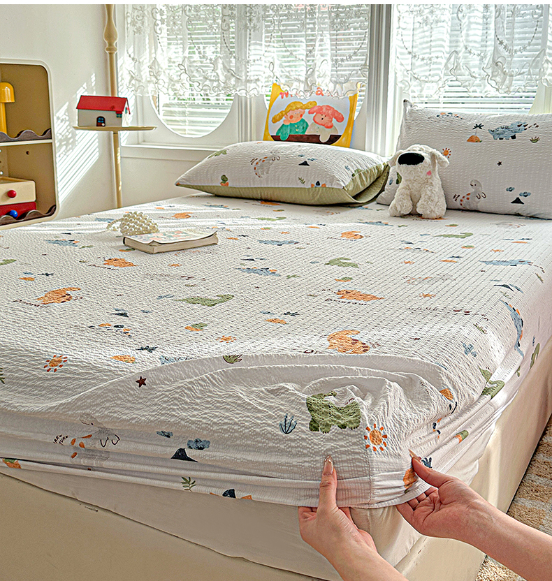 • 91家纺网 家纺一手货源 找家纺 悦织湾家纺 2026新款老粗布印花床单床笠床笠三两件套春秋学生宿舍单双人床笠 恐龙日记