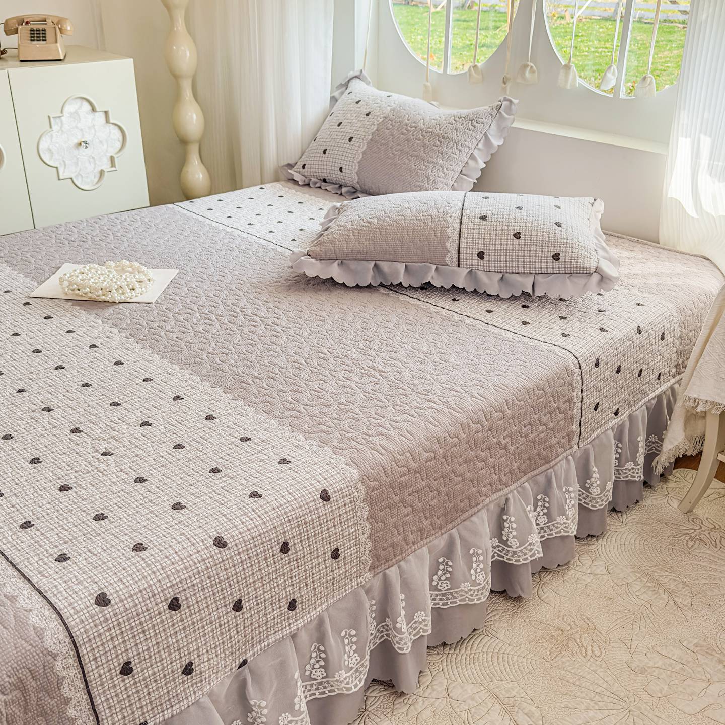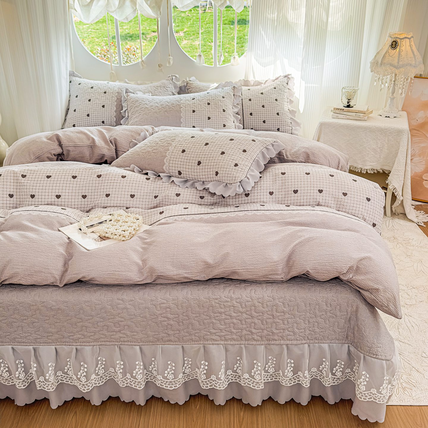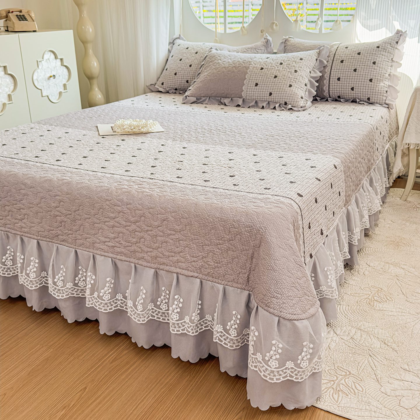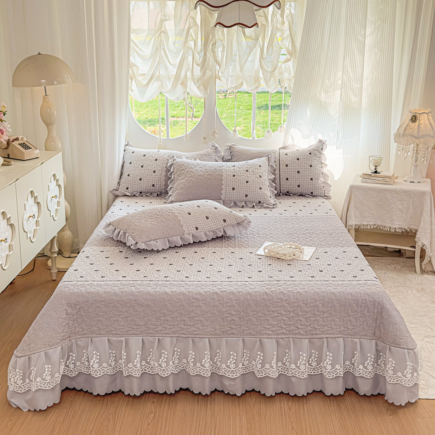 雅眠居 2026直播爆款泡芙棉双层蕾丝花边床盖四件套 甜心-灰