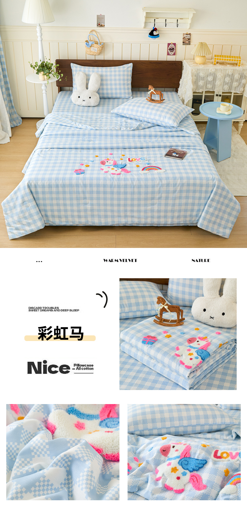 (总)倾慕家纺 2026新款全棉卡通毛巾绣系列夏被,夏被彩虹马,夏被格子小狗,夏被欢乐企鹅,夏被森林小熊,夏被兔兔熊,夏被小树企鹅,夏被小兔女孩,组合