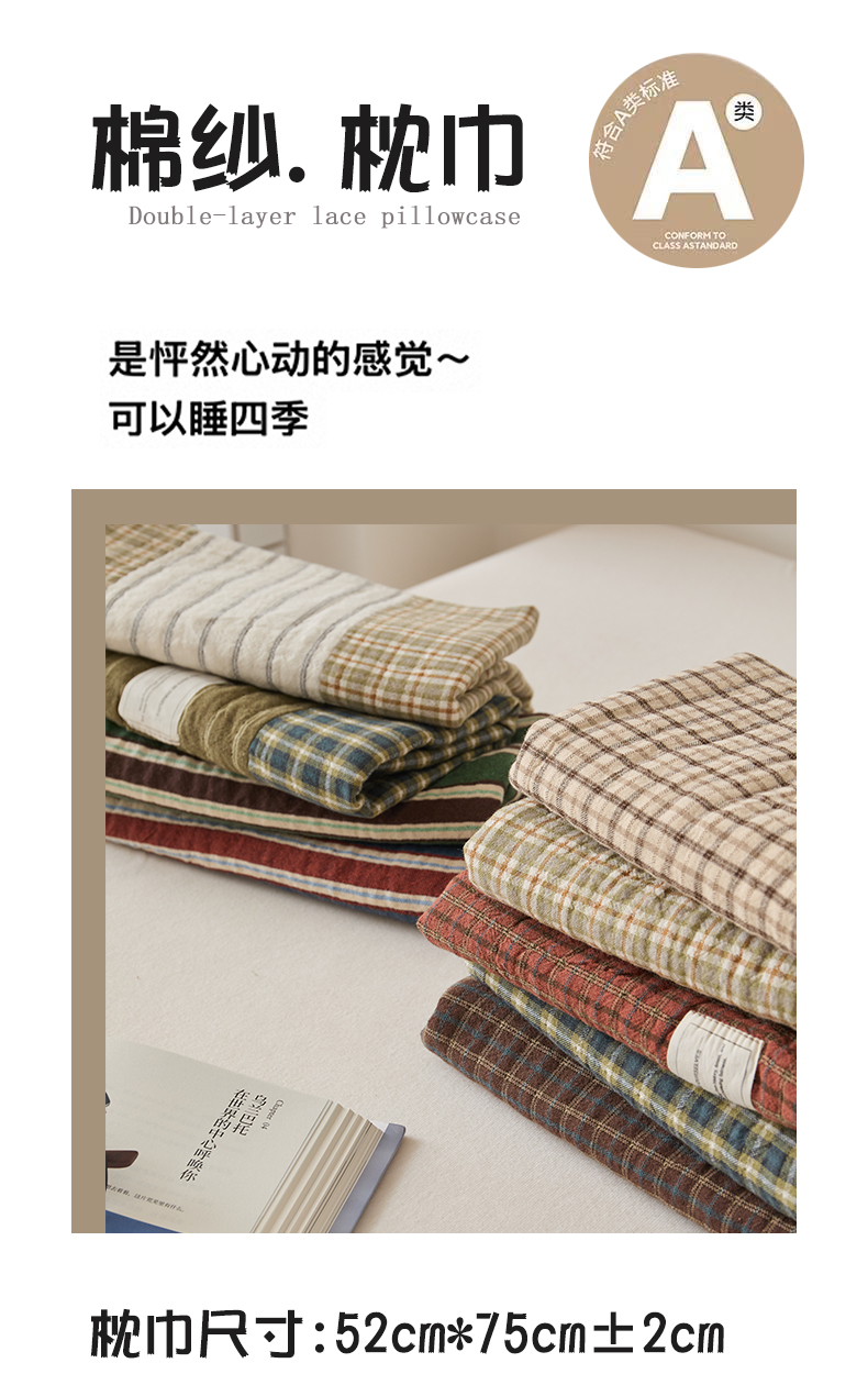 (总)百寐 2026百分百全棉A类色织枕巾52*75条纹格子美拉德色系纯棉吸汗枕巾风格二,色织 -米格,色织-红格,色织-蓝条,色织-绿格,色织-绿条,色织-浅绿格,色织-深咖格,色织-双拼绿格,色织-双拼米格,组合图(仅供展示不可下单)
