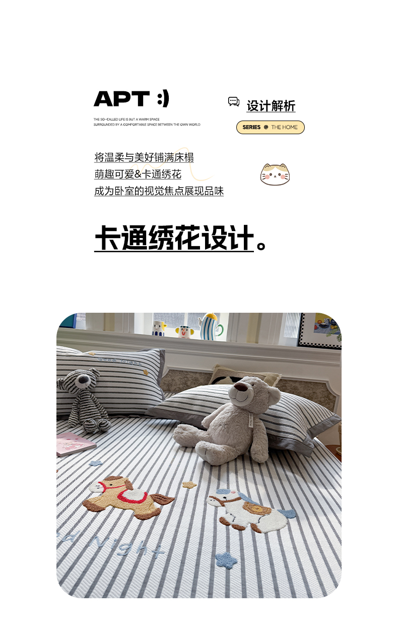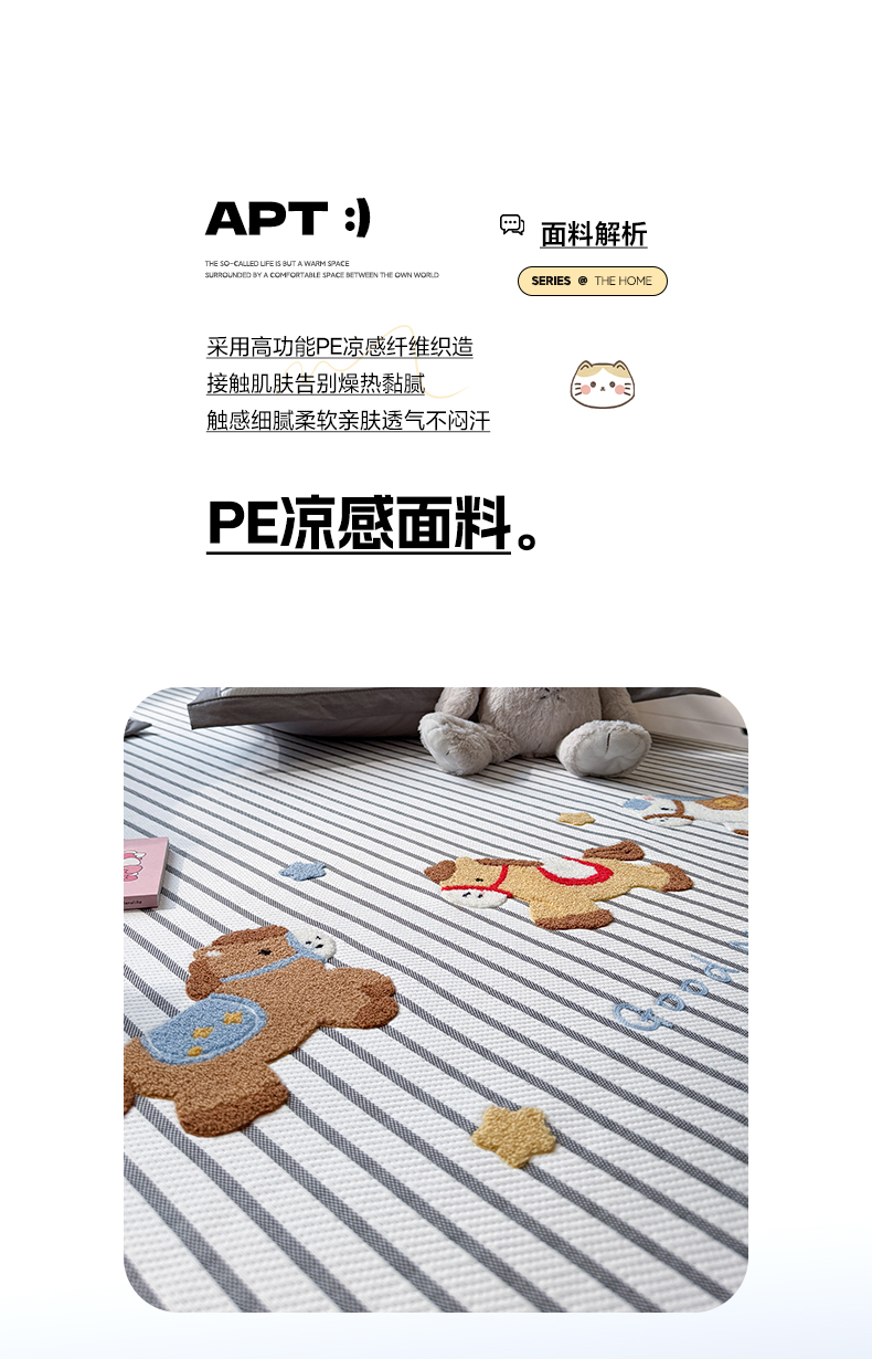 (总)雅居纺家纺 2026新款PE凉感卡通床裙床盖凉席韩版花边加厚三明治底PE凉感席,粉色猫咪家族,粉色星星腊肠狗,萌萌苹安果,汪星人,夏日苹果狗,幸运酷熊