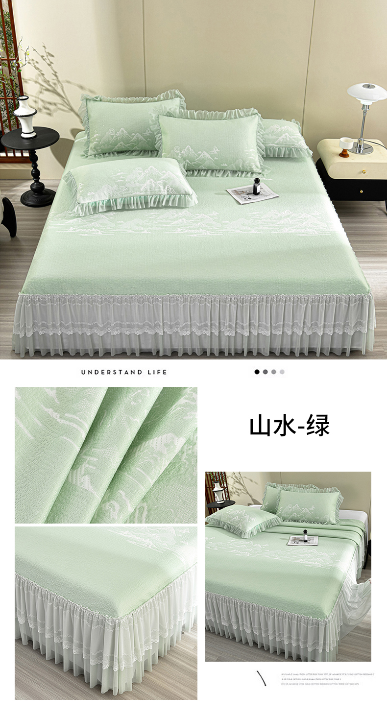 (总)畅畅家纺 2026新款提花面料530克PE凉感因子冰豆豆凉席床裙三件套,漫花-粉,漫花-灰,漫花-蓝,漫花-绿,山水-粉,山水-灰,山水-蓝,山水-绿