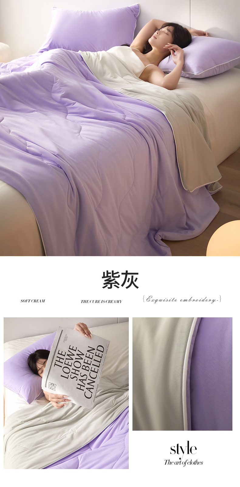 (总)头等舱 2026新款4.0版凉感A类锦氨(165克)55大豆抗菌夏凉被夏被配礼盒模特图,典雅兰,典雅兰拼黄绿,典雅兰拼浅灰,黄绿拼嫣然紫,米黄拼浅绿,浅豆沙拼米黄,浅灰,浅灰拼浅豆沙,浅绿,嫣然紫拼浅灰,配礼盒
