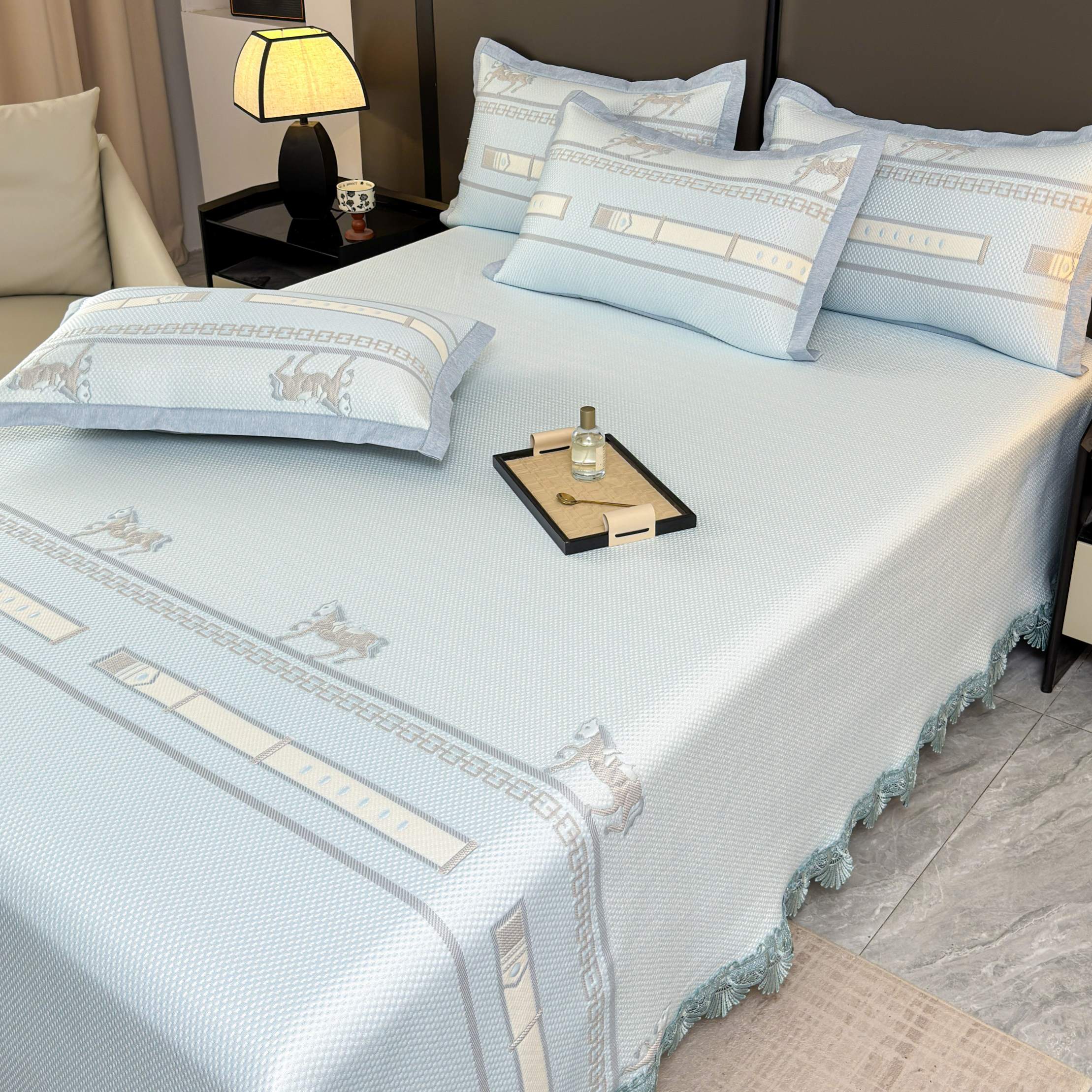 • 91家纺网 家纺一手货源 找家纺 席匠 2026新款双排扣子席三件套 双面马-蓝