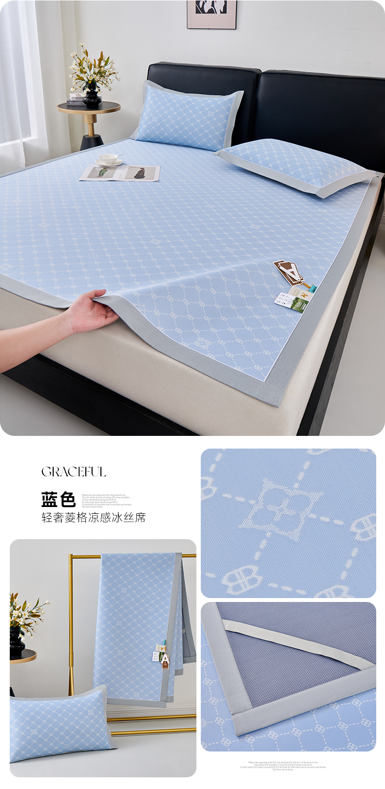 (总)2023新款超精密冰丝席-小斜纹系列-床笠款藤席凉席竹席,粉色,蓝色,绿色,银灰
