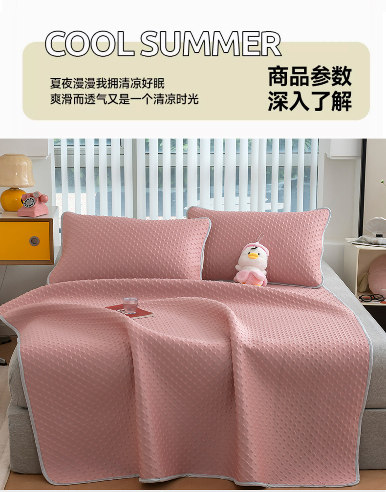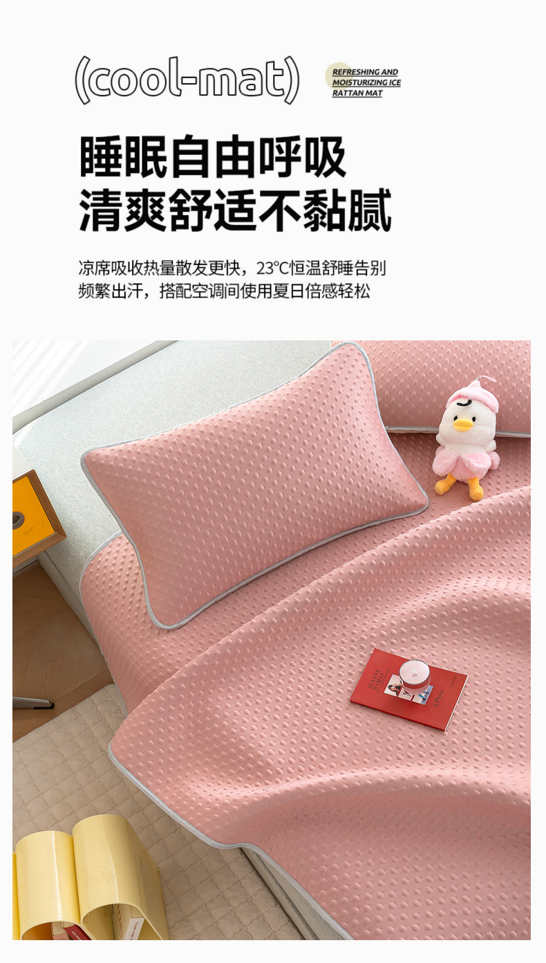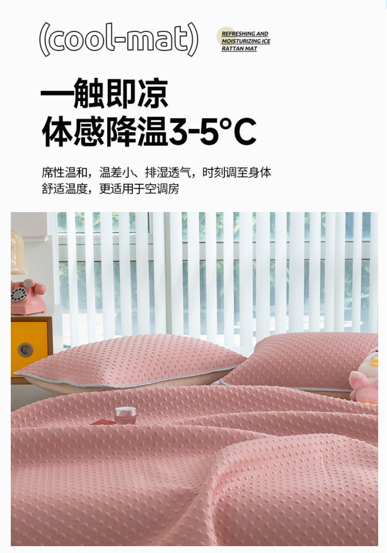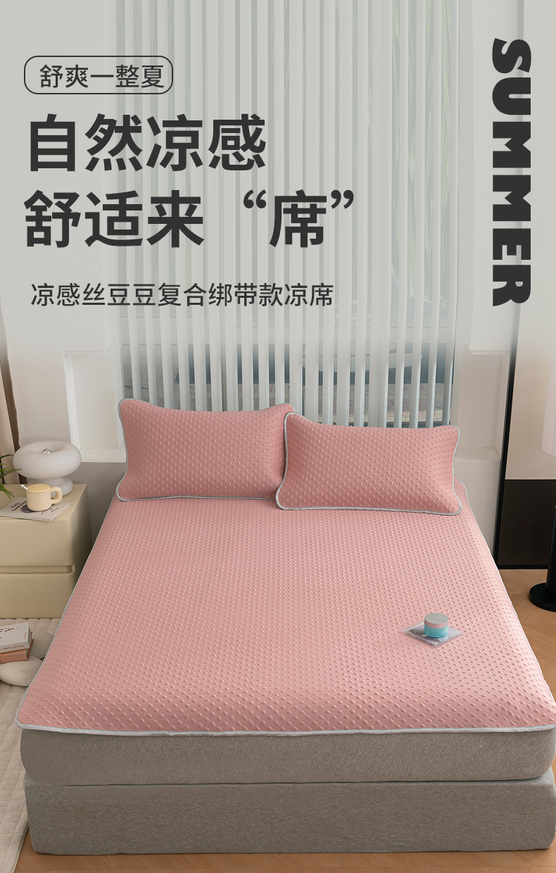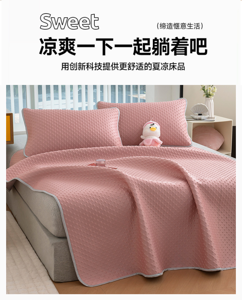 商品名称:默忆 2026新款3D轻奢风A类直播网红热款凉感丝冰豆豆三明治复合床单款凉席两件套三件套 时尚粉