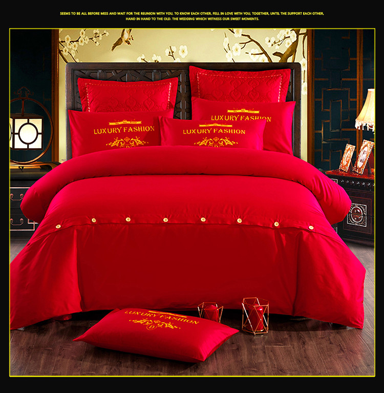 慕她家纺 婚庆四件套结婚大红色纽扣全棉纯棉多件套 约会春天