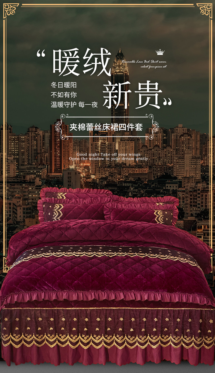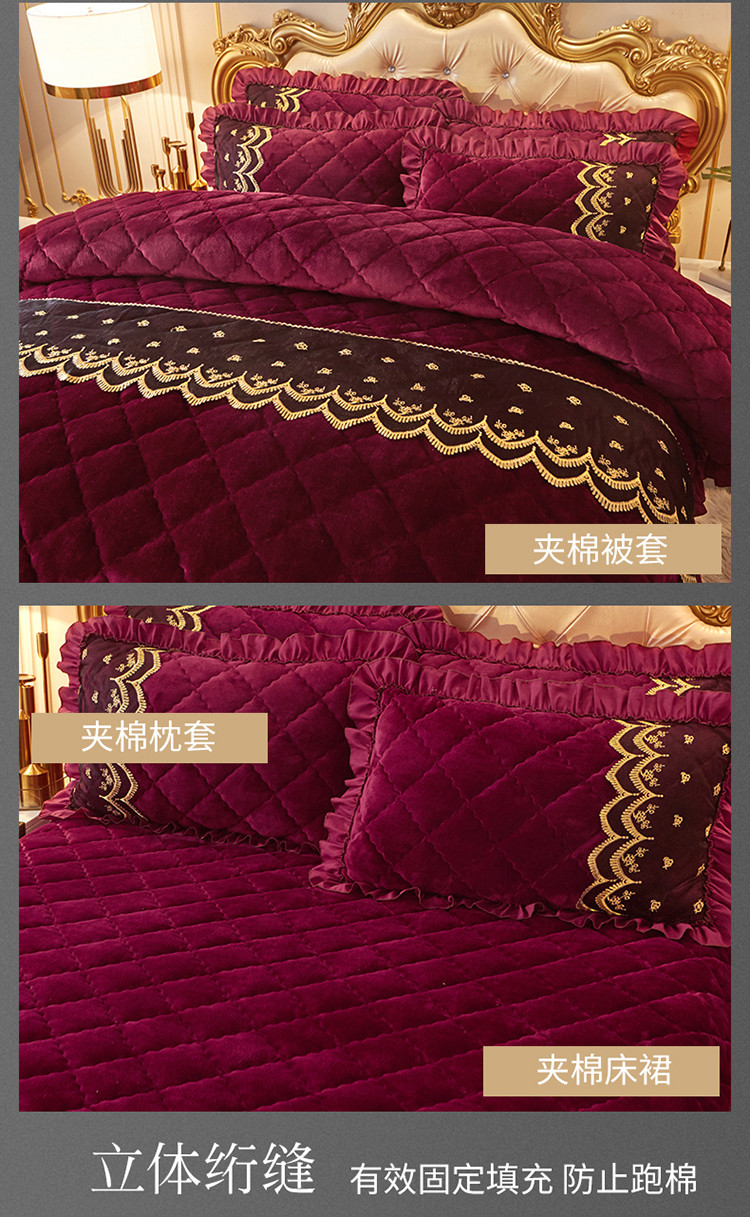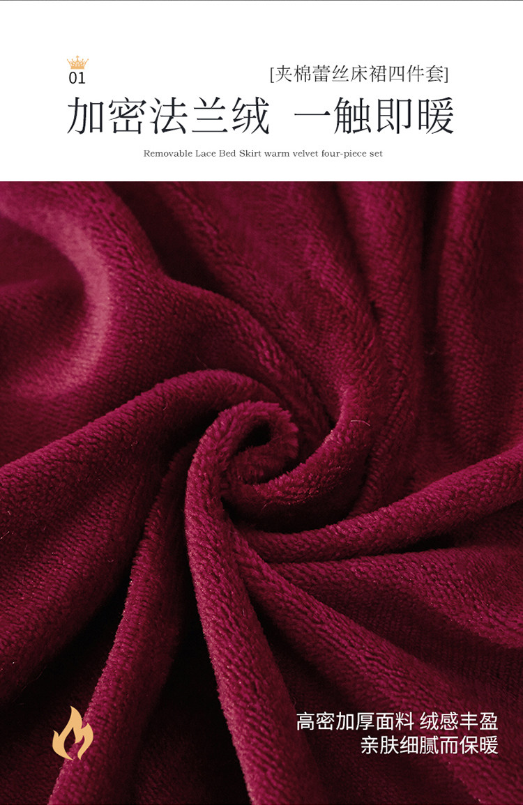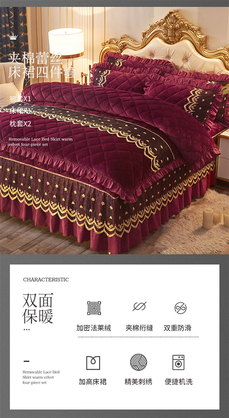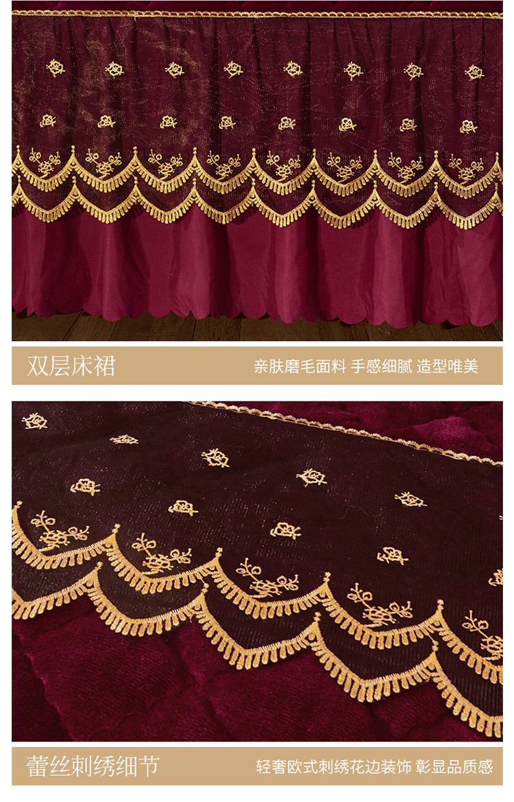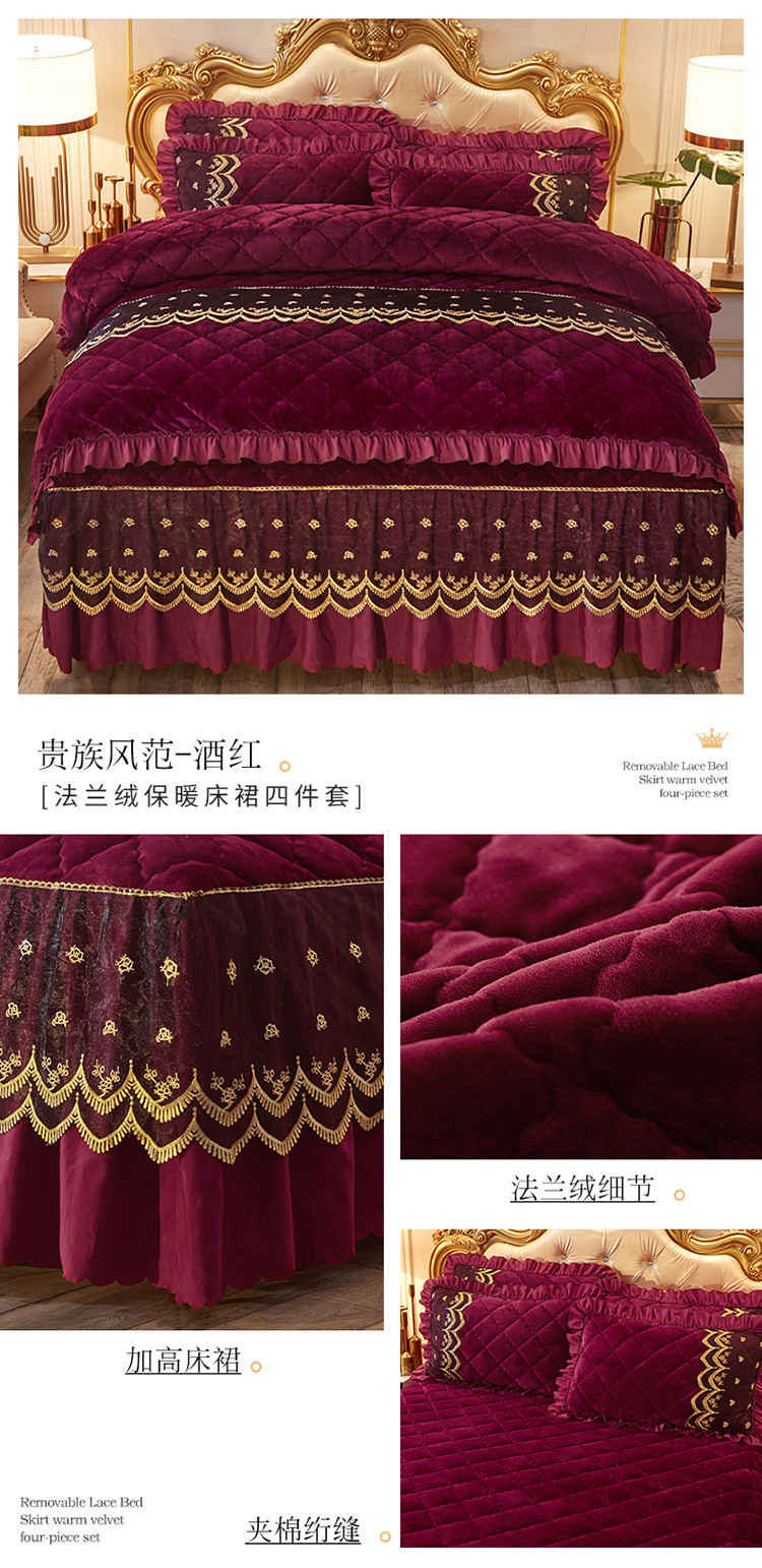 情恒家纺 2025法莱绒贵族风范夹棉床裙四件套 酒红