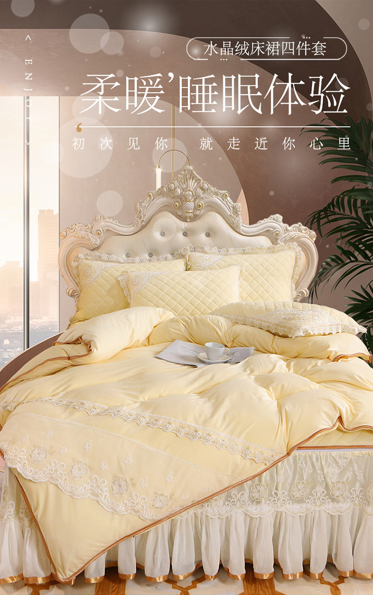 网红馆 2025新款水晶绒蕾丝床裙四件套 香槟