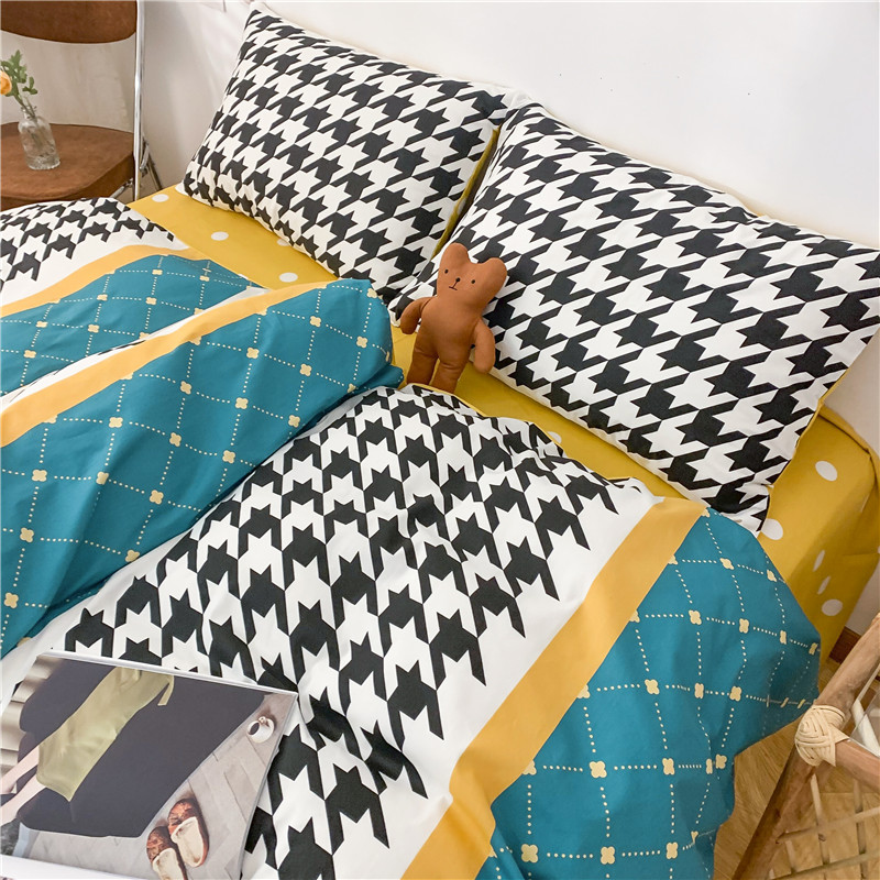 (总)感遇家纺 2022新款全棉印花四件套,格子小花,黑格恐龙,蓝色心情,浅暖