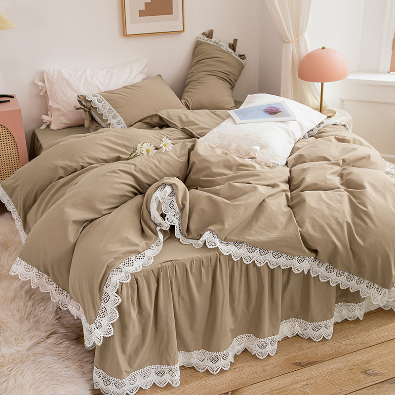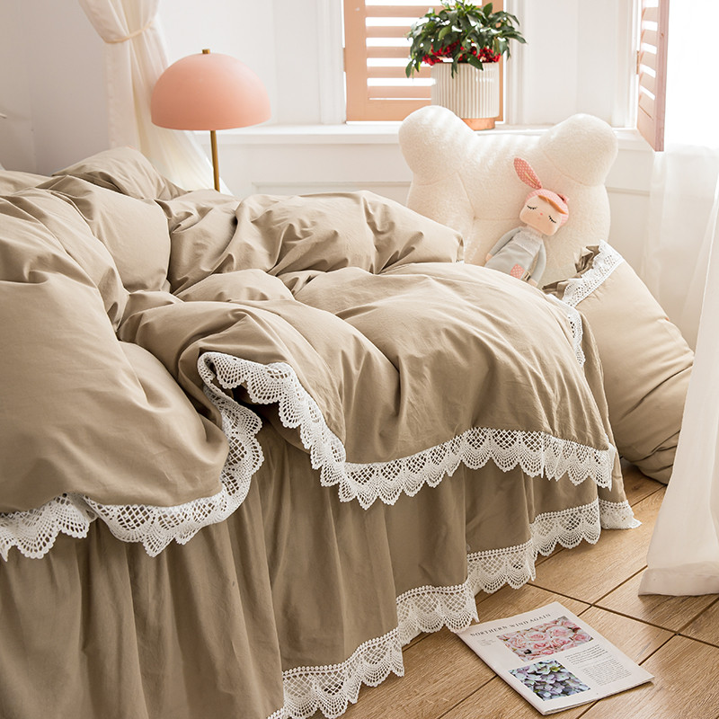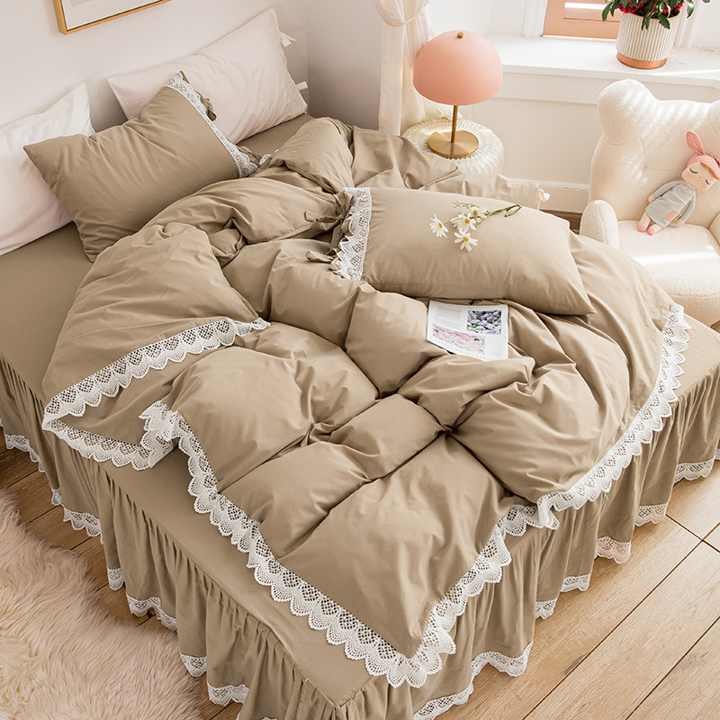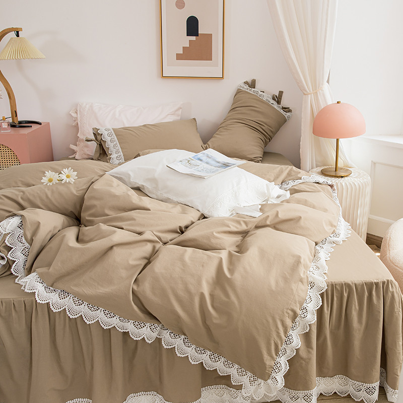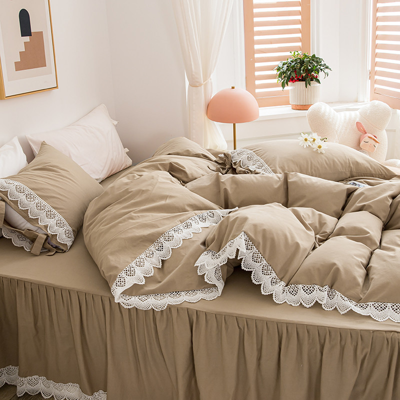淑女公社2021新全棉喷气13376镂空花边床裙四件套 梨花-卡其色