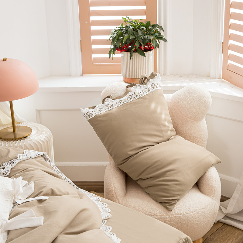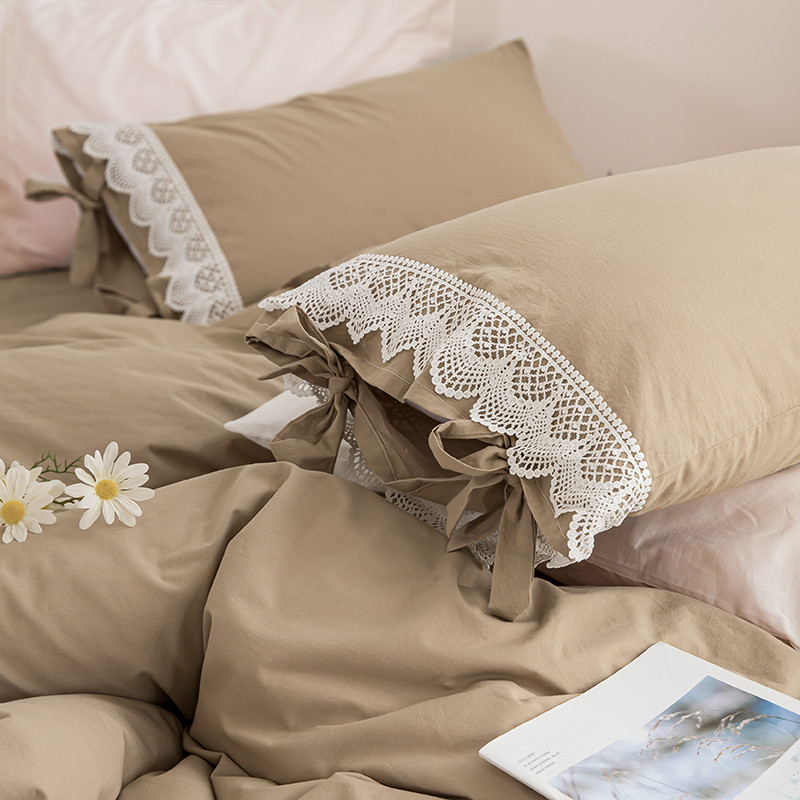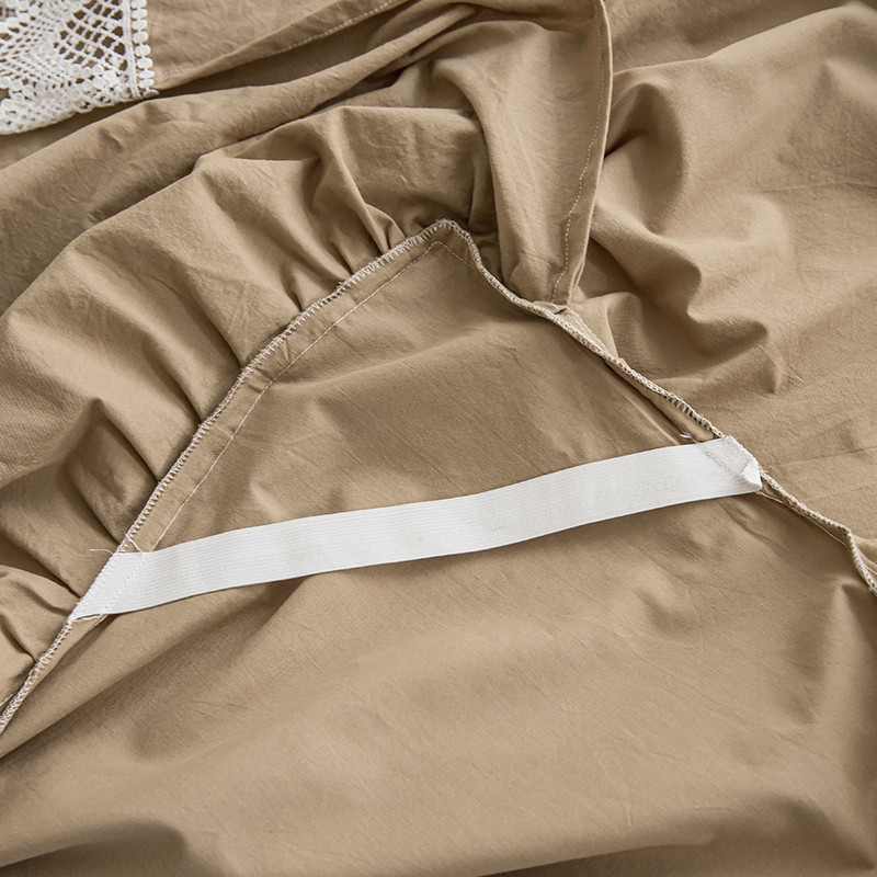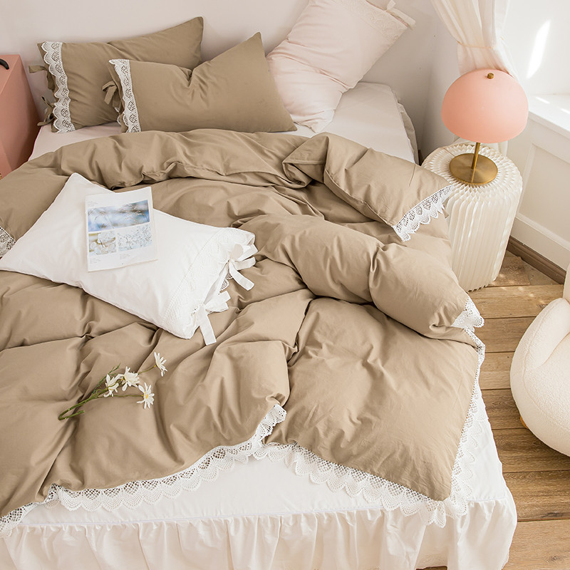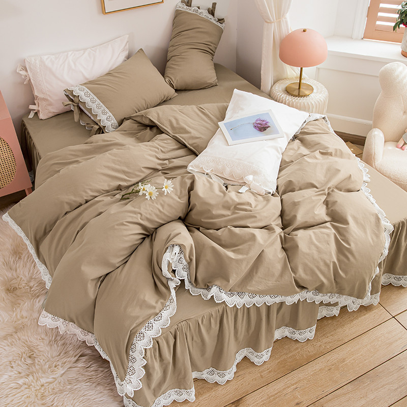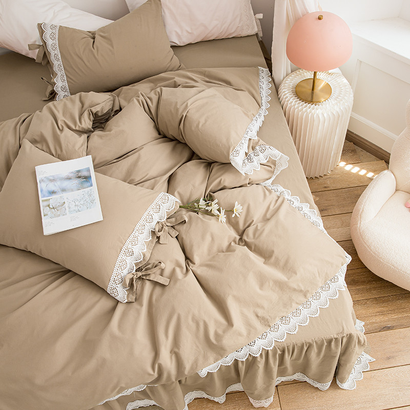 淑女公社2021新全棉喷气13376镂空花边床裙四件套 梨花-卡其色