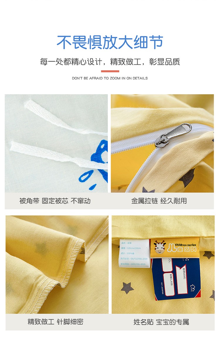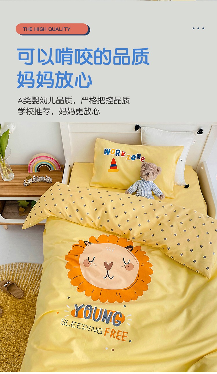 当前位置: 91家纺网 > 商品网购 > 婴童用品 > 婴童床品套件 > A类全棉数码台板印花儿童幼儿园被子三件套午睡六件套安睡小狮