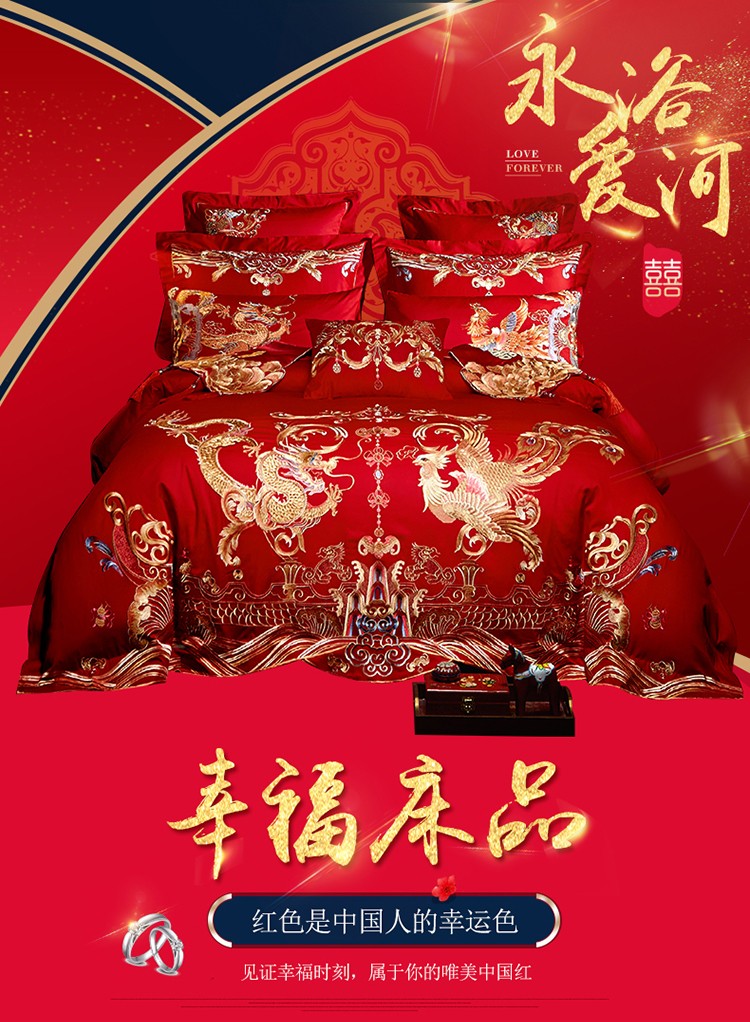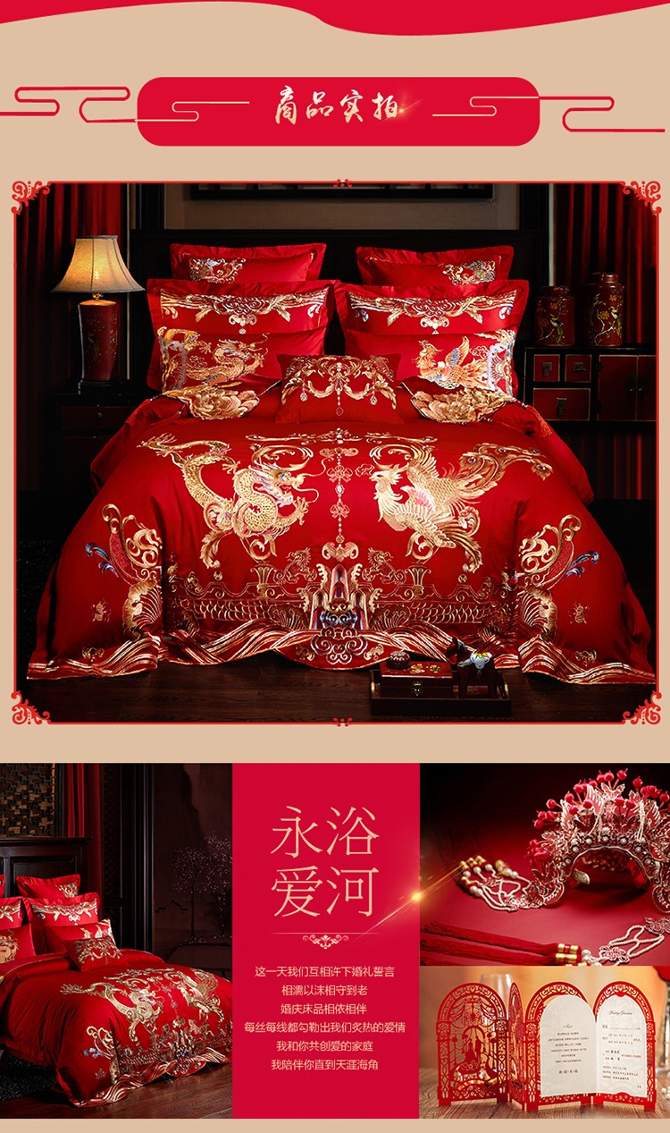 当前位置: 91家纺网 > 商品网购 > 床品套件 > 四件套 > 婚庆四件套 > 红番天 热卖款全棉婚庆刺绣四件套 永浴爱河