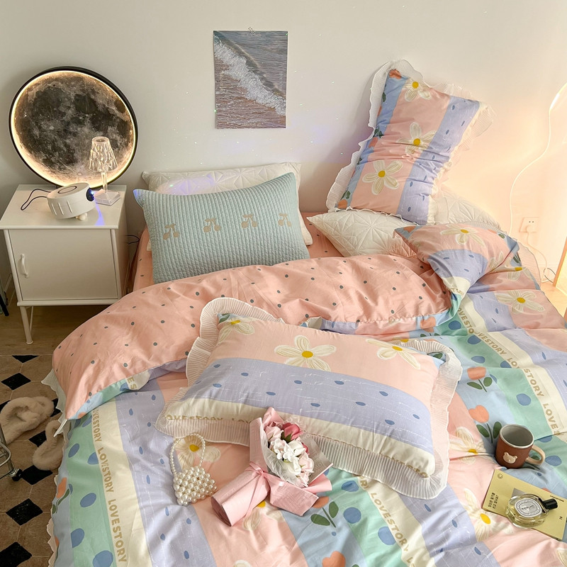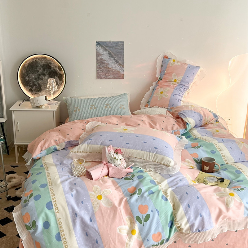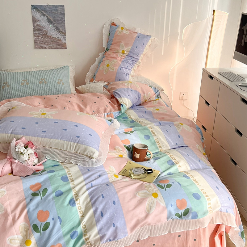 昔可家纺 2022新款13372全棉百褶花边四件套 竖条拼接花