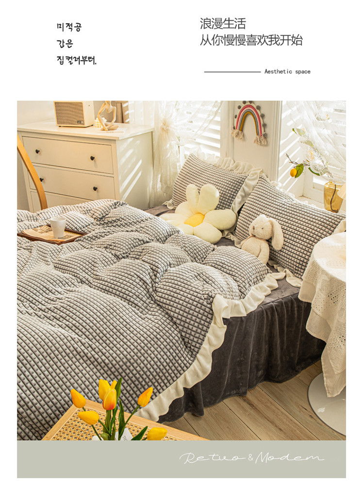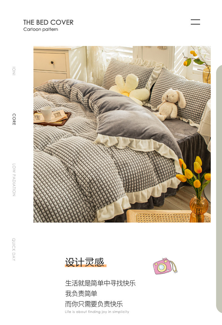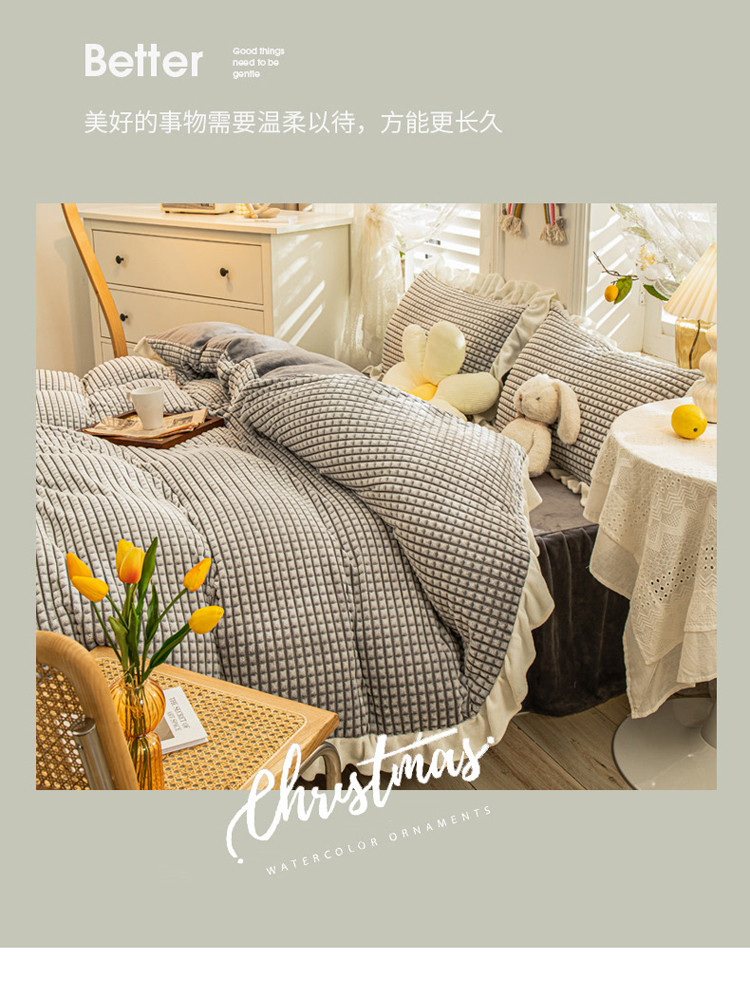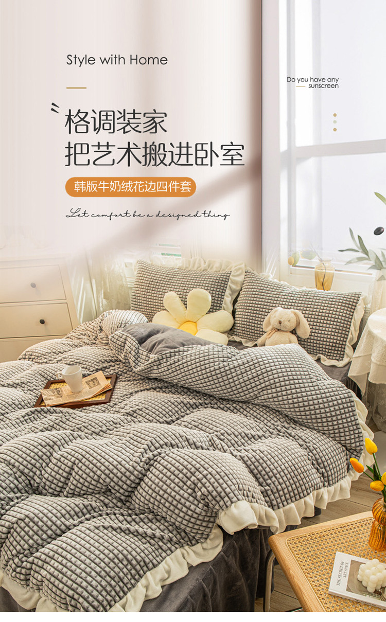 当前位置: 91家纺网 > 商品网购 > 床品套件 > 四件套 > 牛奶绒四件套 > 慕澄 2022牛奶绒剪花绒荷叶边四件套暖光效果图 浪漫灰