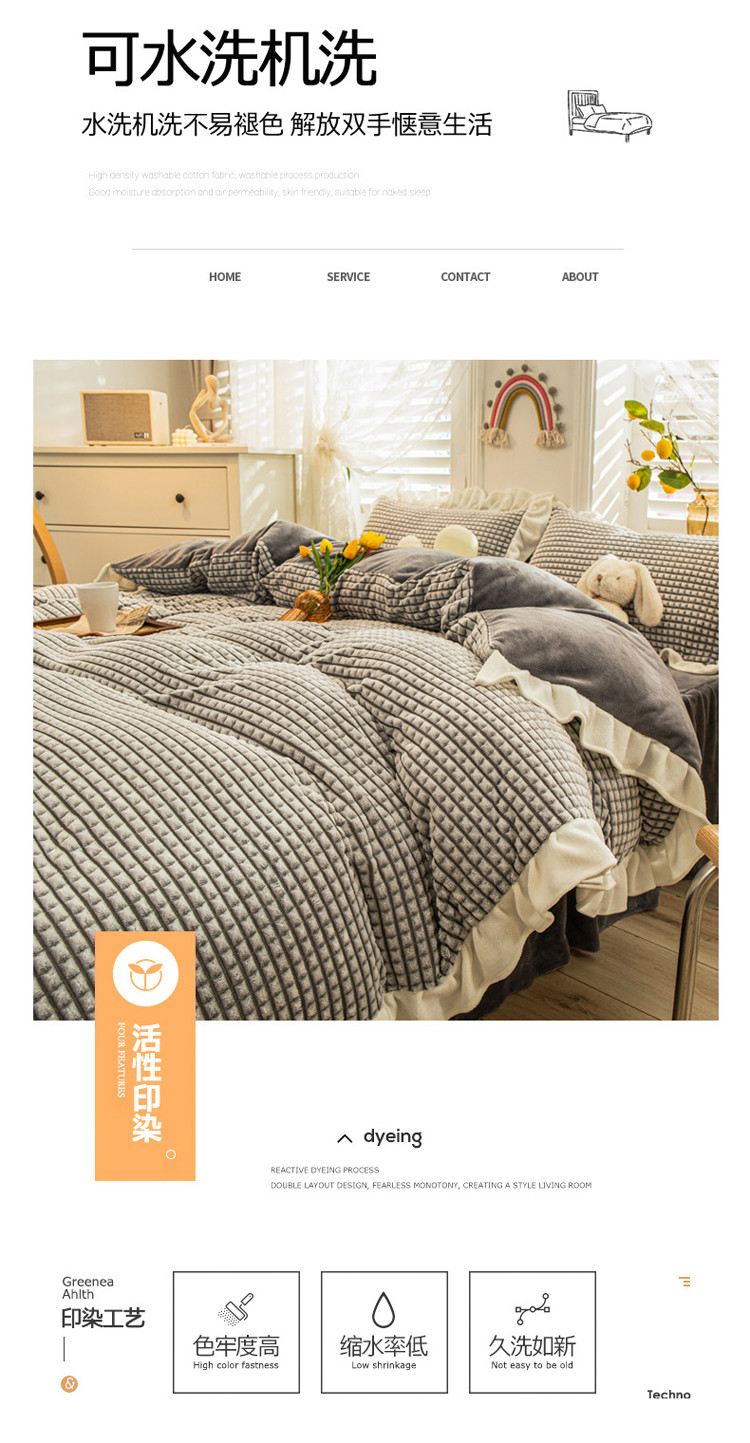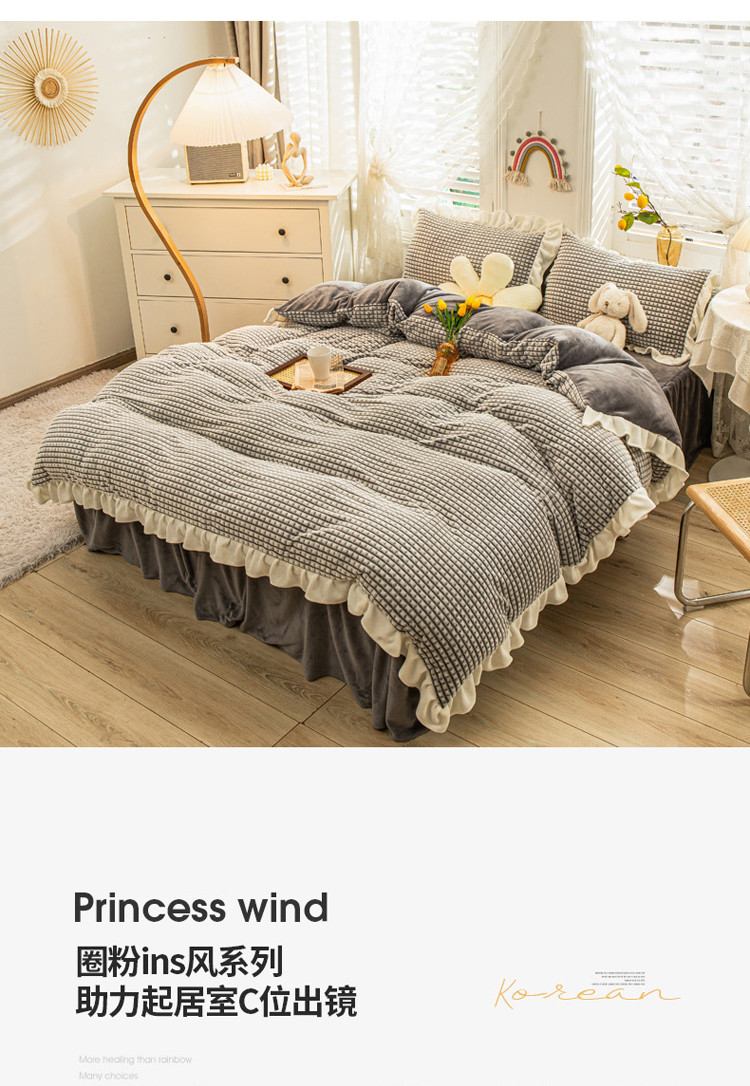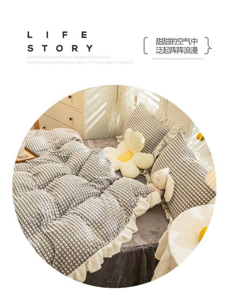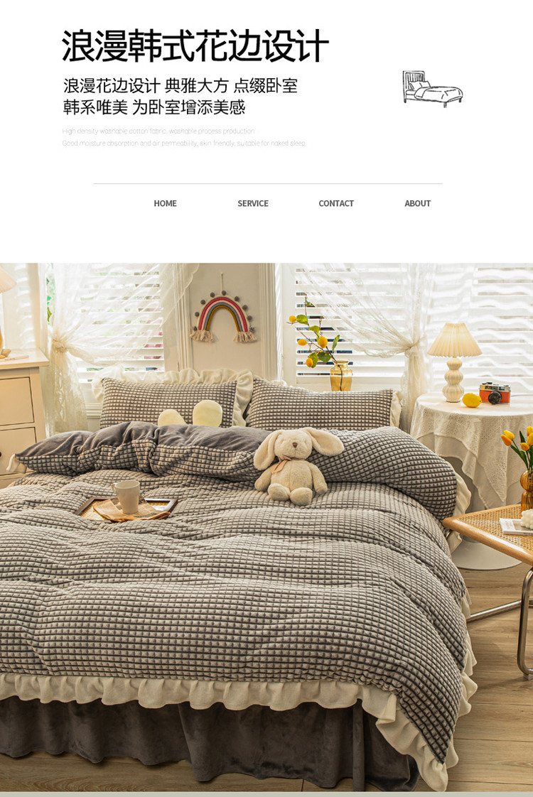 当前位置: 91家纺网 > 商品网购 > 床品套件 > 四件套 > 牛奶绒四件套 > 慕澄 2022牛奶绒剪花绒荷叶边四件套暖光效果图 浪漫灰
