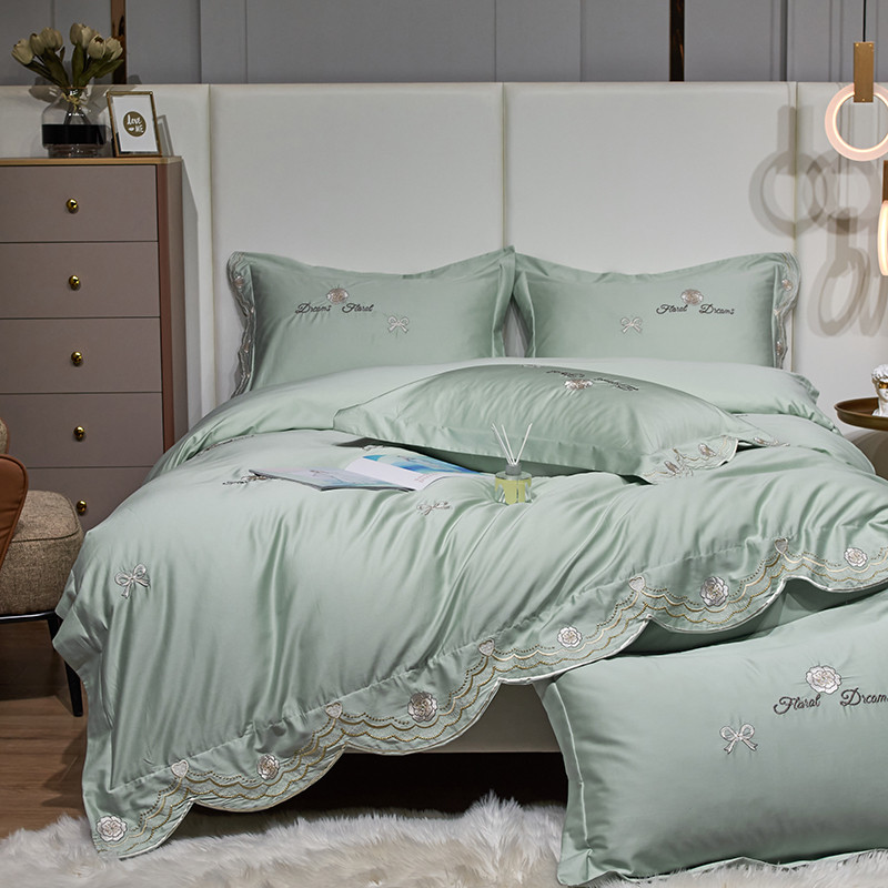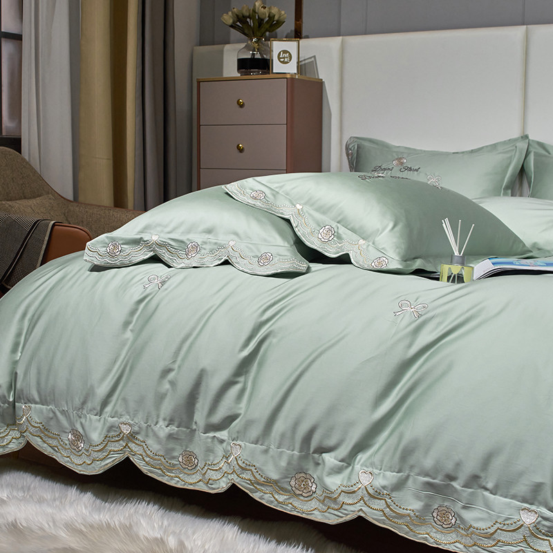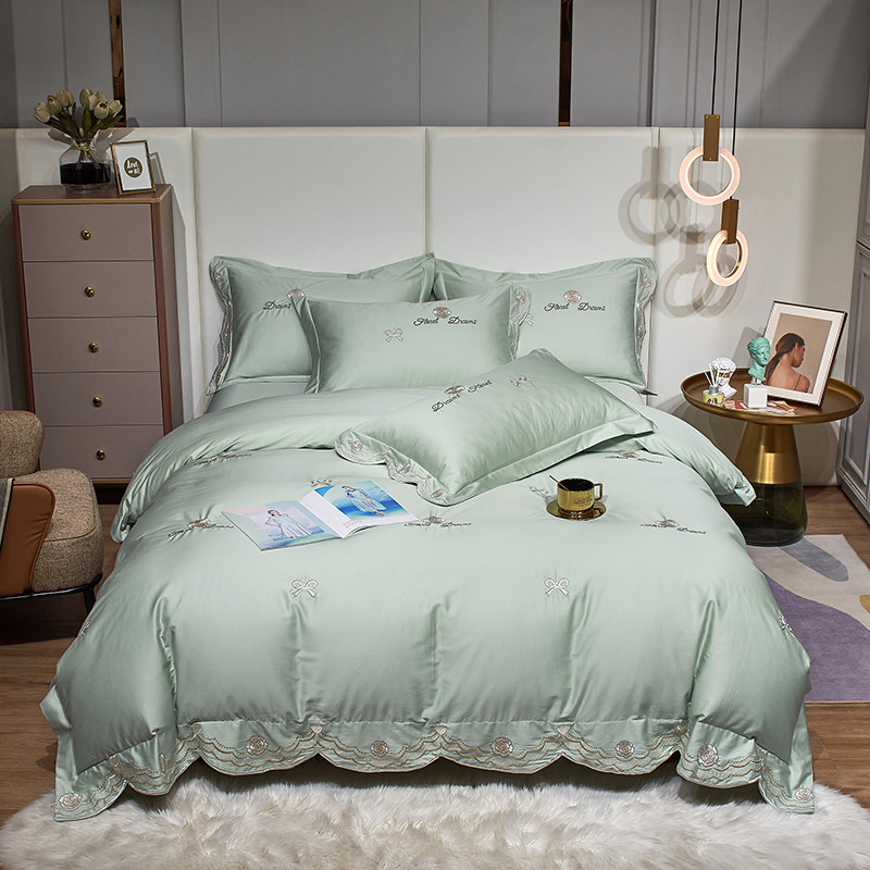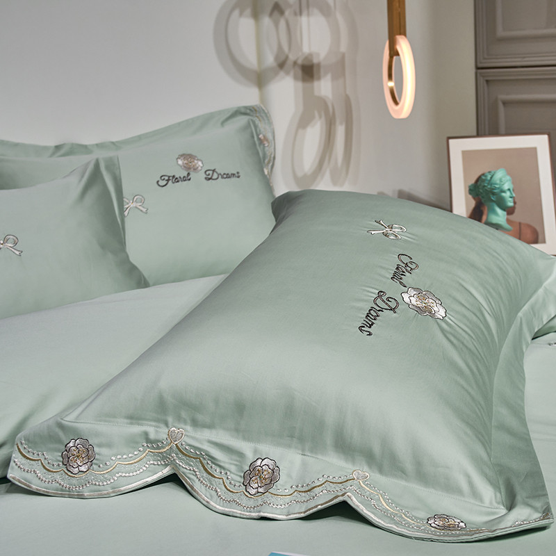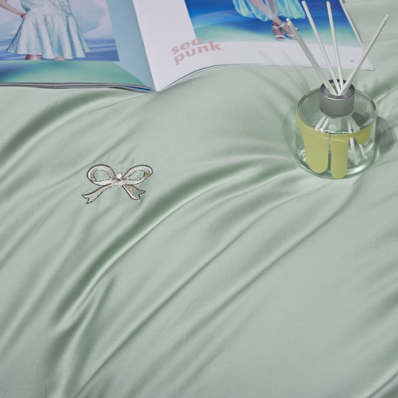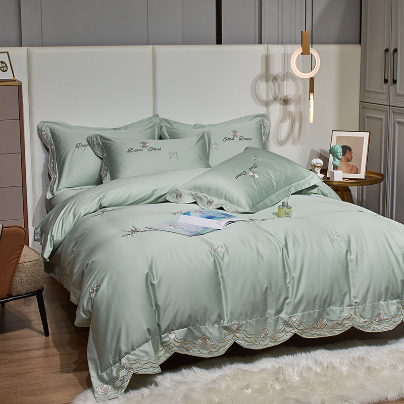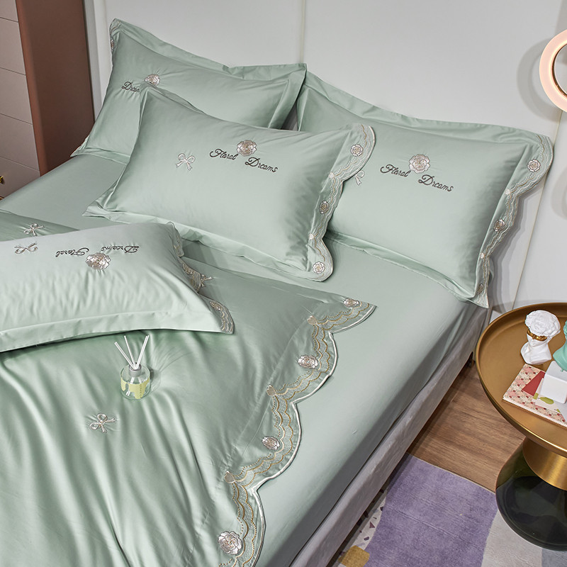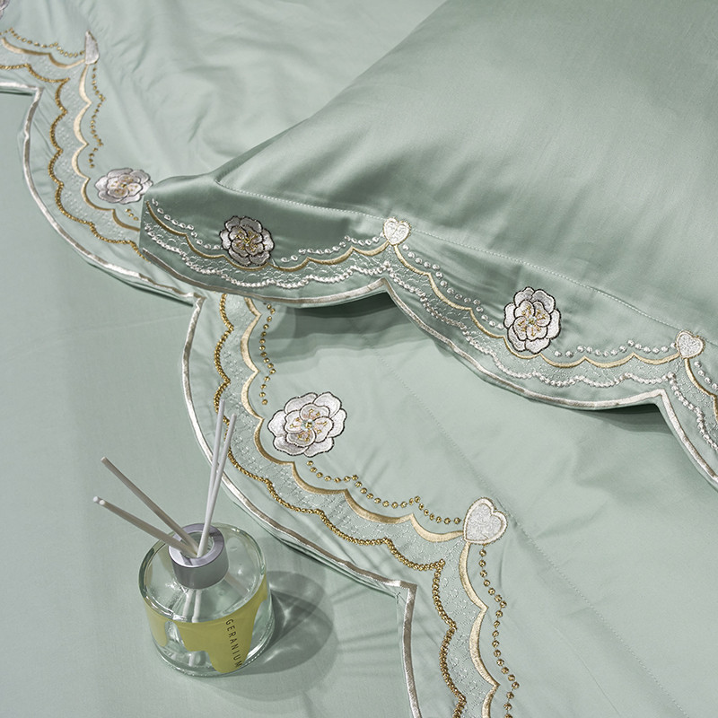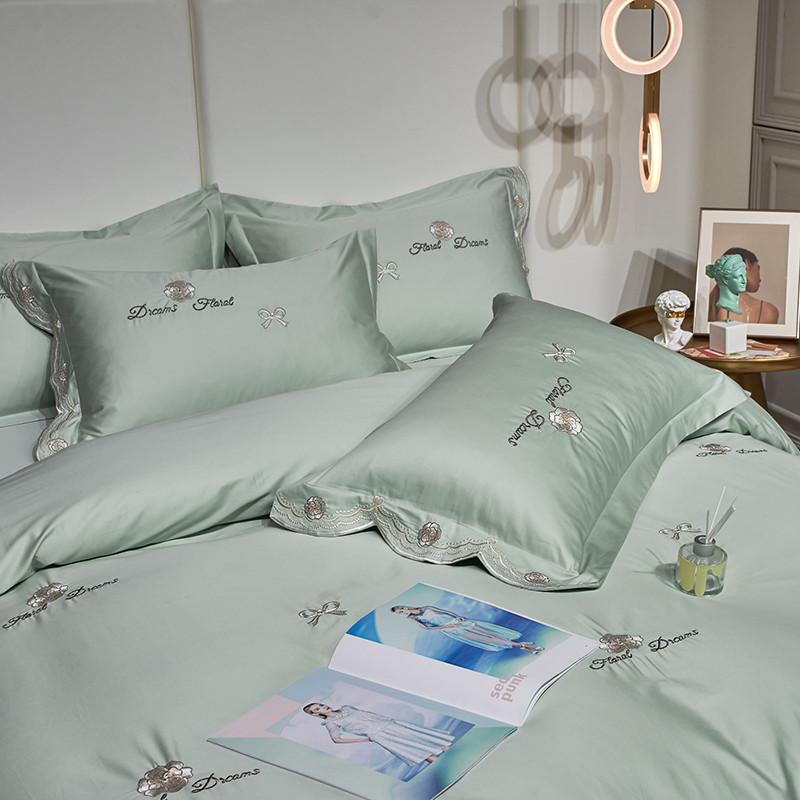 玖玖爱家纺 2022新款100支贡缎长绒棉刺绣四件套-香奈尔 香奈尔-豆绿