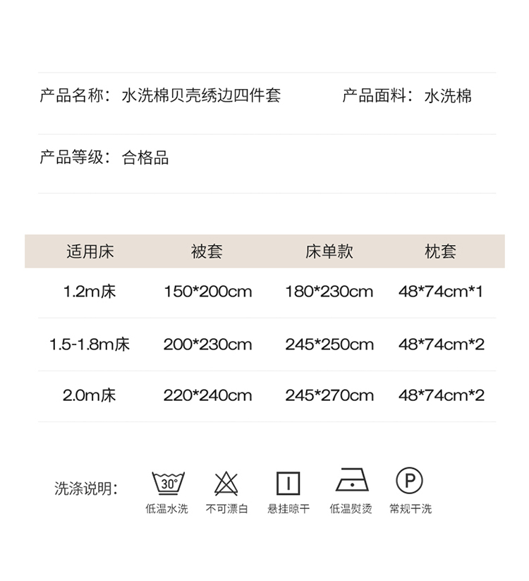 商品名称:(总)眠帛家居 2022新款水洗棉贝壳绣边四件套