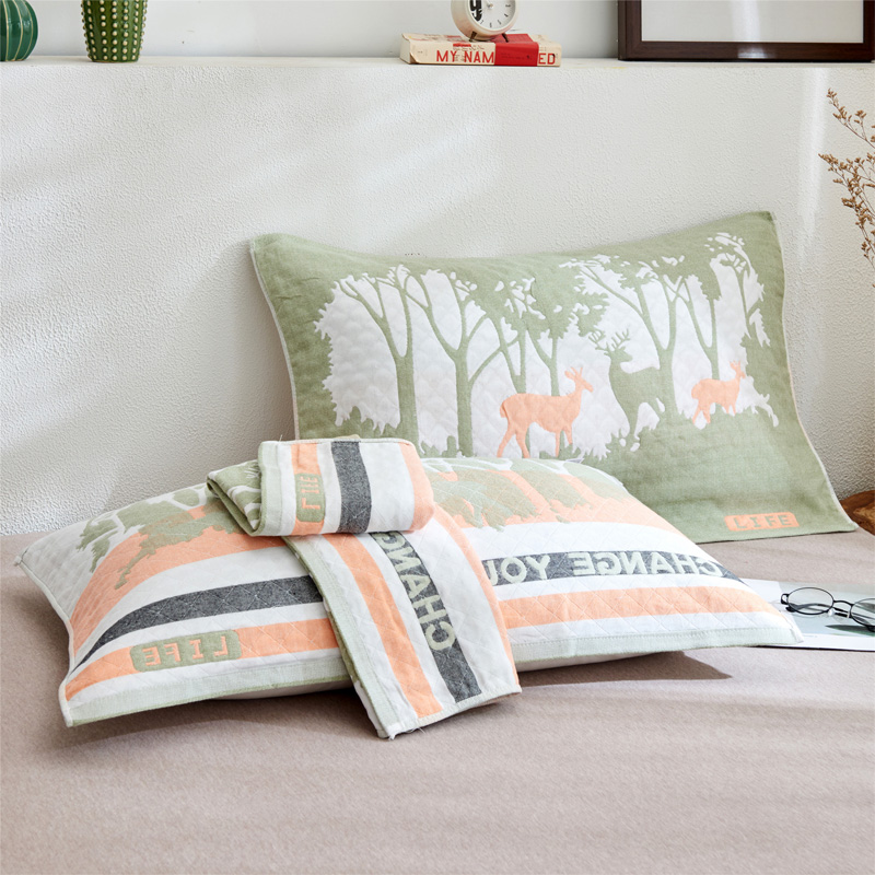• 91家纺网 家纺一手货源 找家纺 朴尔 2022新款三层纱布枕巾(一对) 仙林小鹿-绿(52*78)
