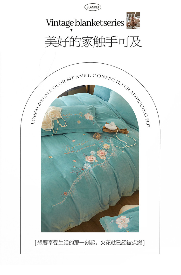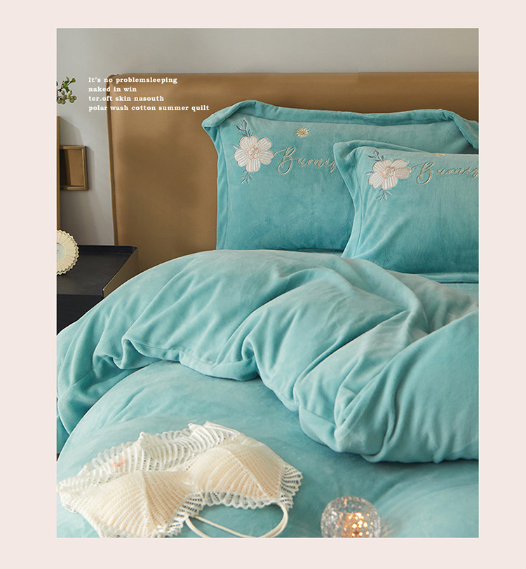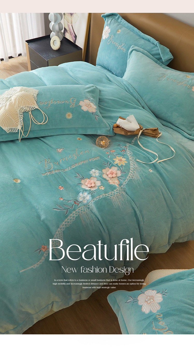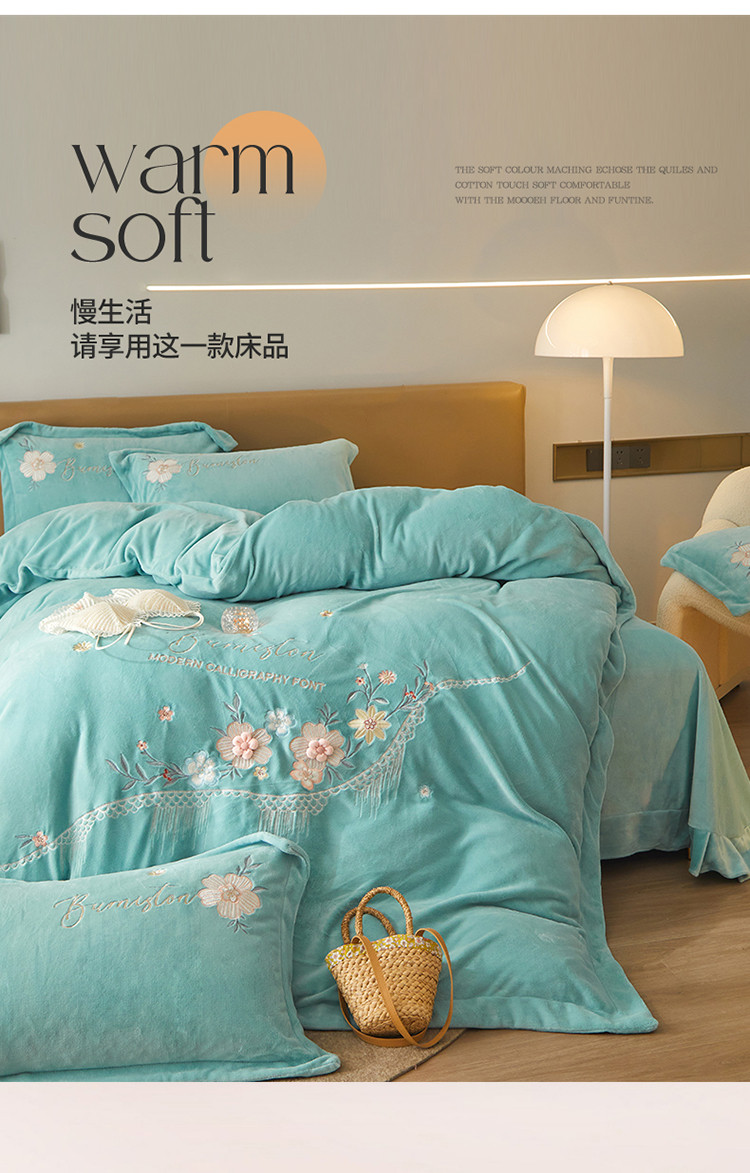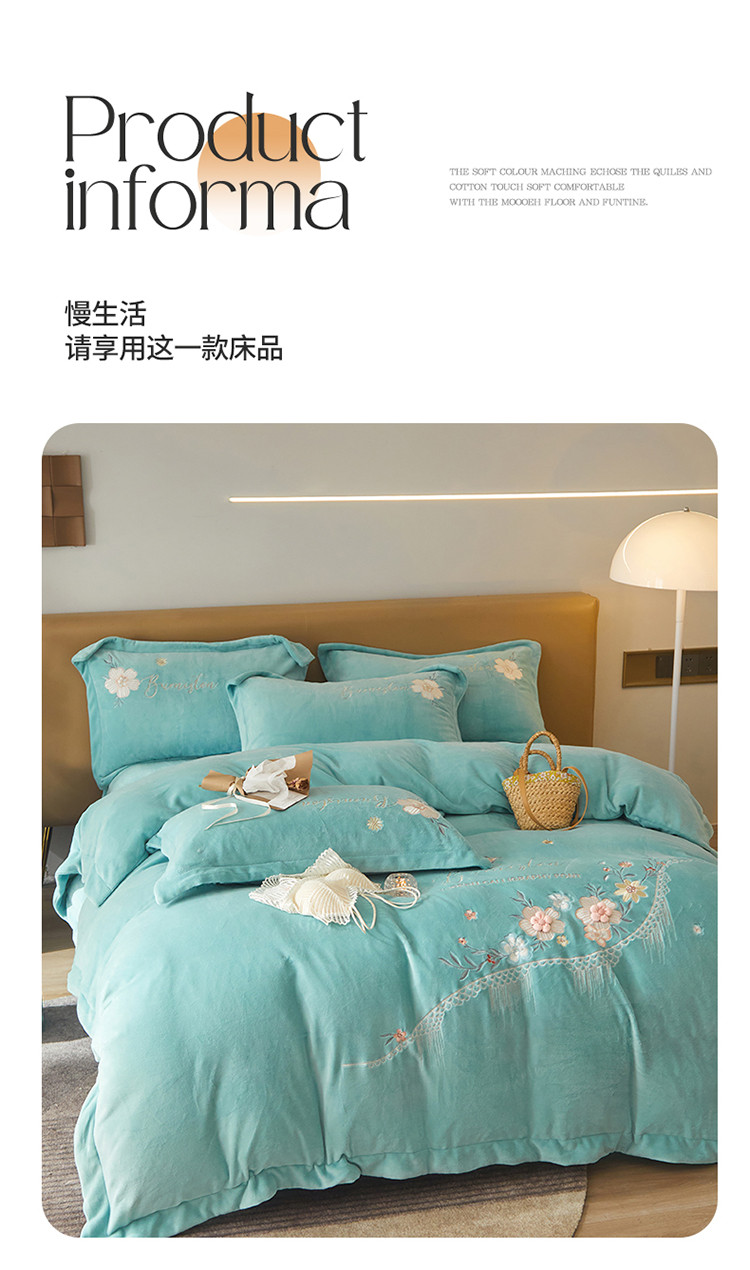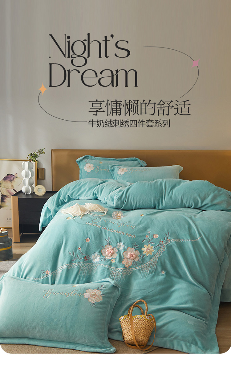 商品名称:名品优仓 新款230g牛奶绒刺绣四件套-贝拉花园 天空蓝