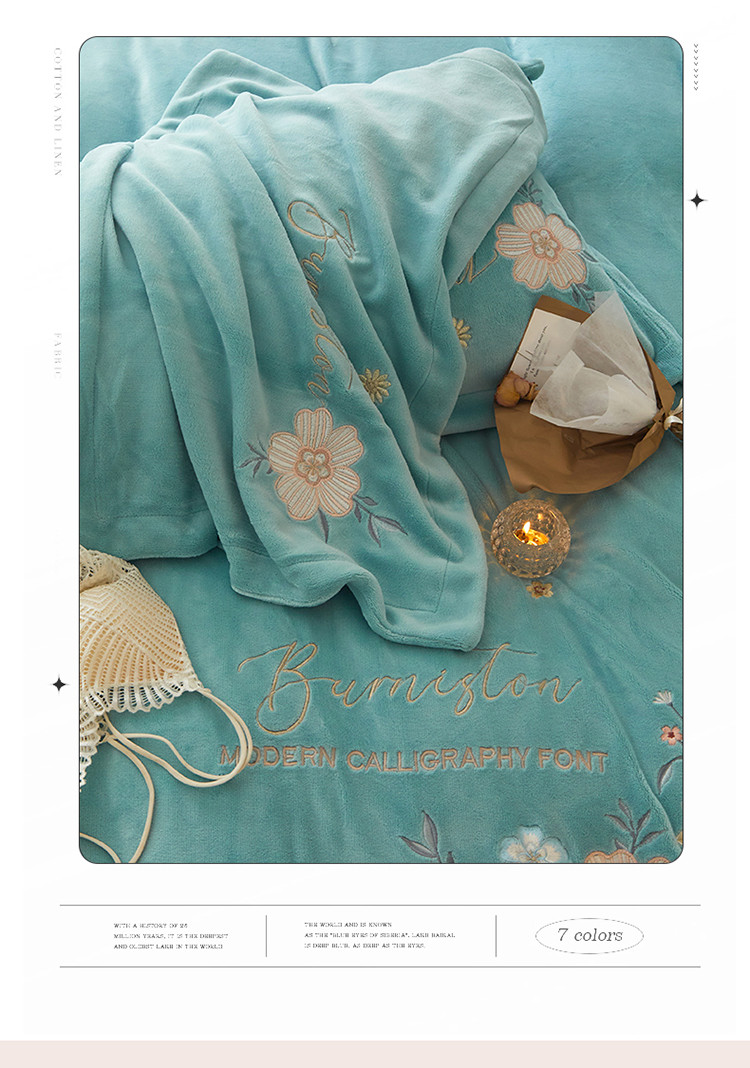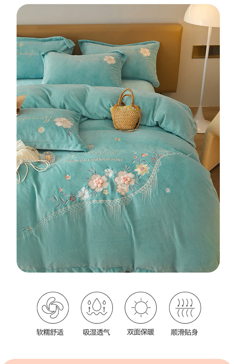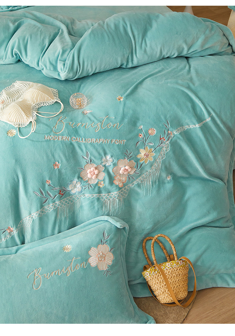 名品优仓 新款230g牛奶绒刺绣四件套-贝拉花园 天空蓝
