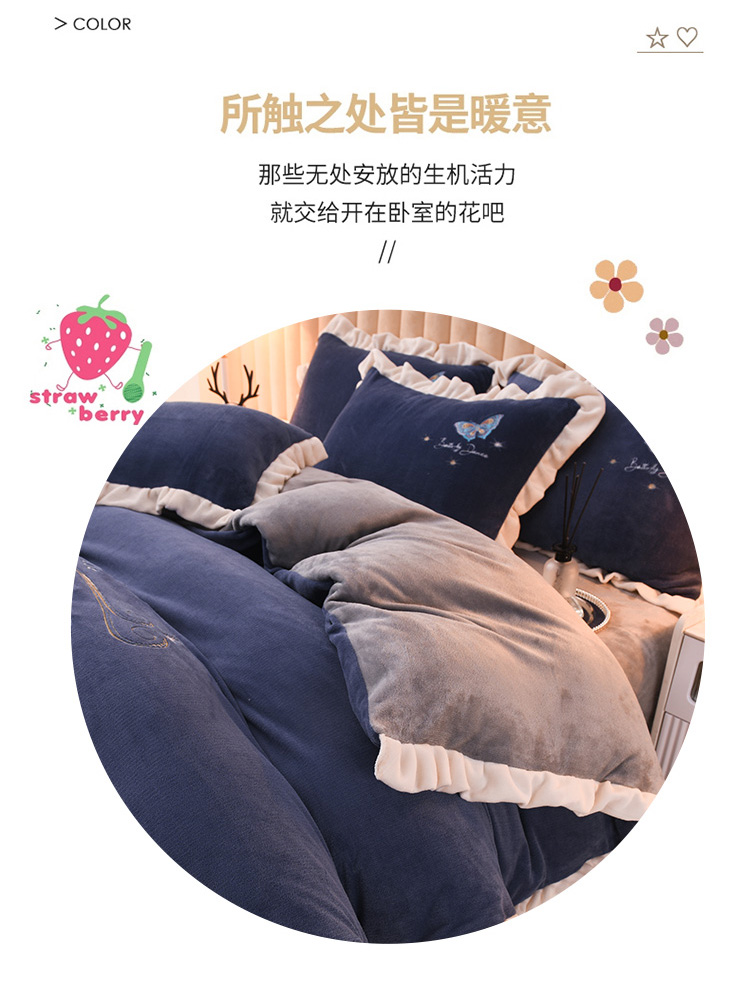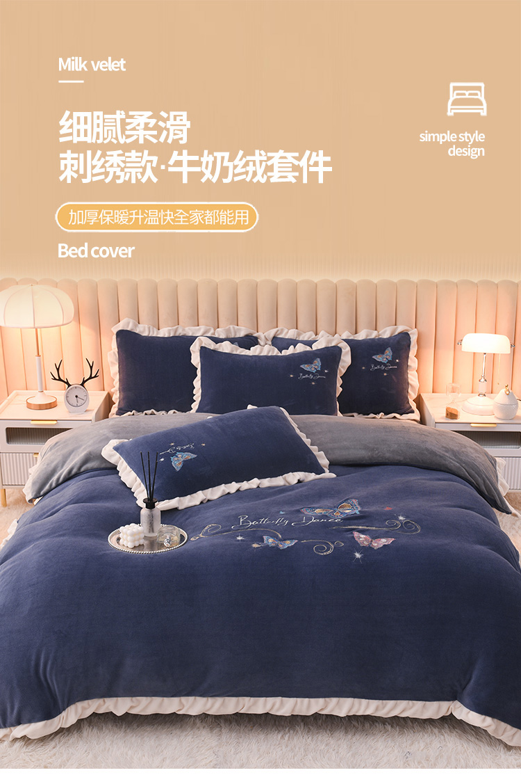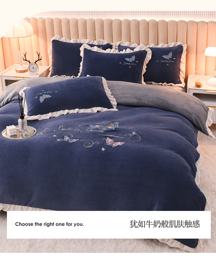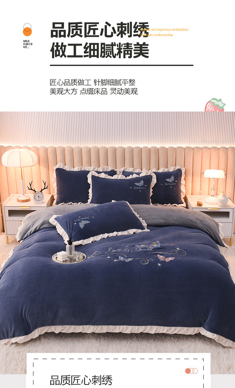 商品名称:芃成 2022新款加厚保暖牛奶绒绣花四件套 蝶舞 宝石蓝
